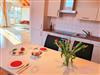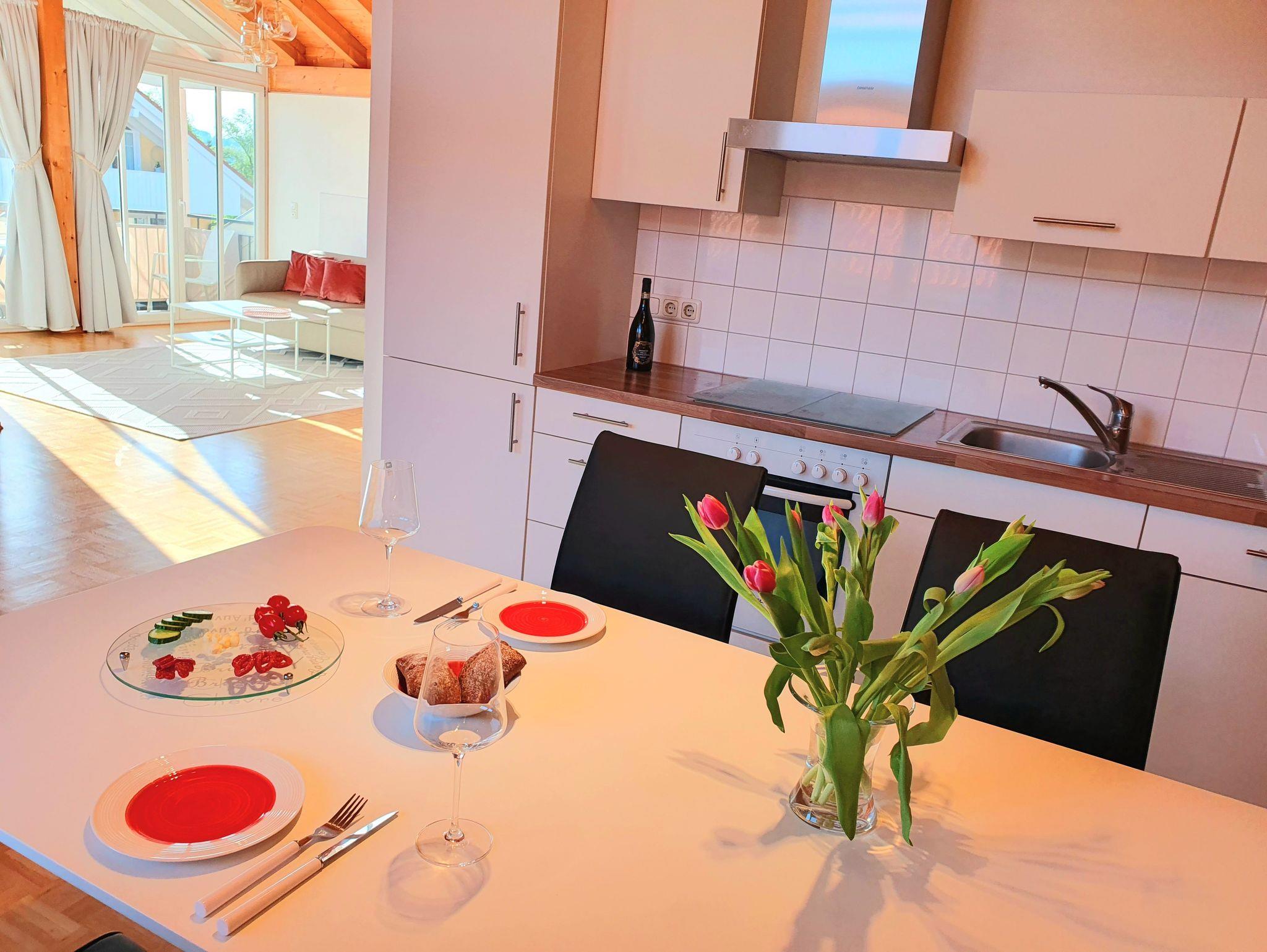 Der moderne Essbereich bietet Platz für 1 bis 6 Personen auf bequemen Lederstühlen, perfekt für gemütliche Abende. Die Küche ist vollständig ausgestattet, inklusive Herd, Kühlschrank mit Gefrierfach, Mikrowelle, Wasserkocher, Kaffeemaschine und Toaster – alles, was Sie für einen entspannten Urlaub brauchen.
