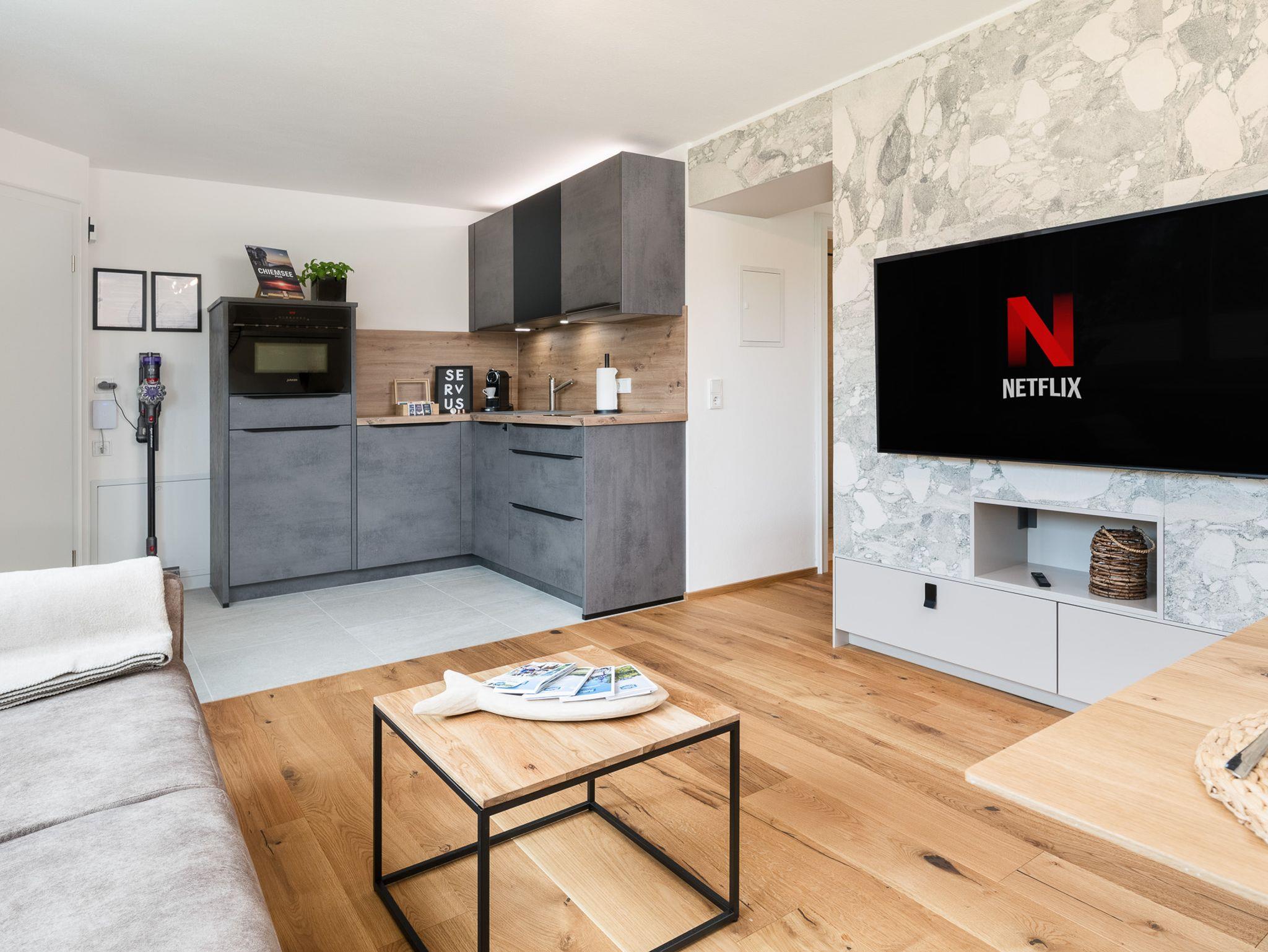 Entspann Dich im Wohnbereich mit gemütlichem Ambiente, das mit einem 55-Zoll-Smart-TV inkl. NETFLIX und Internet-TV in UHD-Qualität ausgestattet ist. Genieße Deine Lieblingssendungen und Filme in bester Bildqualität.