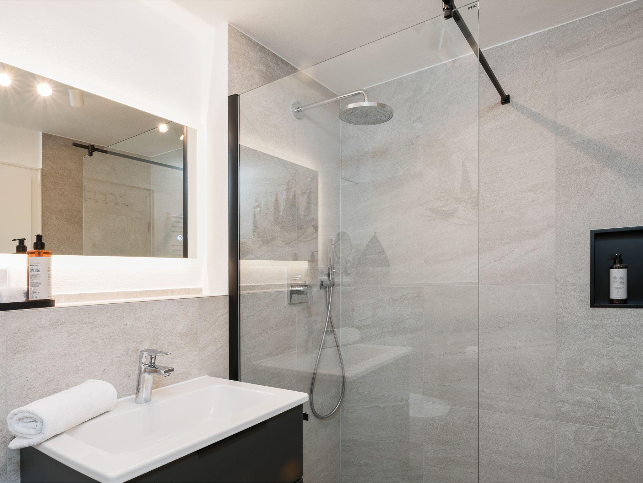 Genieße nach einem erlebnisreichen Tag pure Erfrischung in der hochwertigen, begehbaren Dusche unseres stilvollen Badezimmers.