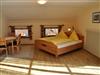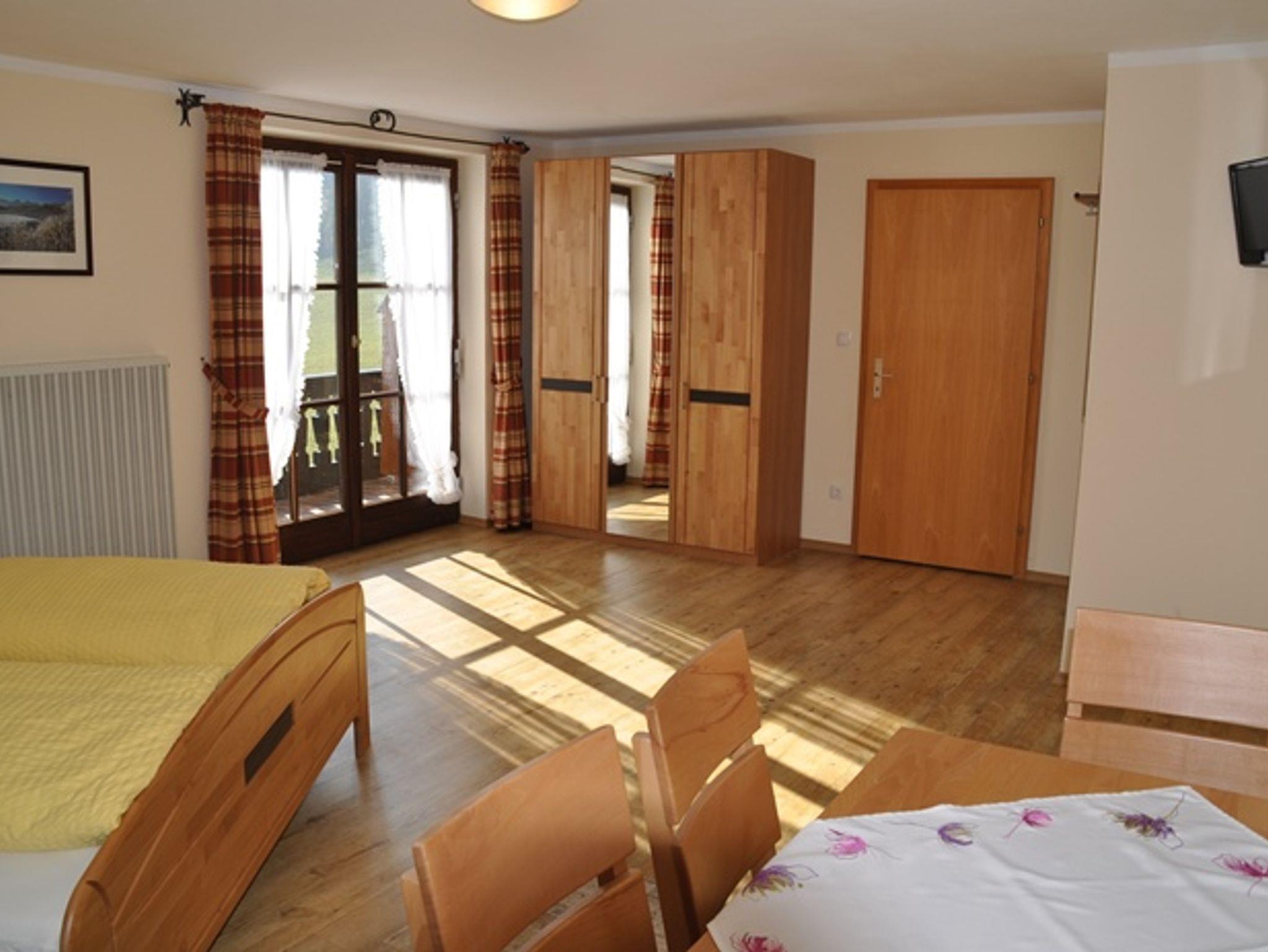 Doppelzimmer/ Familienzimmer für vier Personen - Unser neugestaltetes und geräumiges Doppelzimmer/Familienzimmer mit ca. 45 qm, bietet für vier Personen genügend Wohnfläche. Das Zimmer hat einen großzügigen, kombinierten Wohn- Schlafbereich mit Sitzgelegenheit und Flachbildschirm. Im Raum daneben befinden sich noch zwei weitere getrennte Betten als Schlafmöglichkeit. Das freundliche, großzügige Badezimmer ist mit Dusche/WC ausgestattet. Vom Wohn- Schlafbereich aus können Sie den eigenen, abgetrennten Balkon nutzen und die Berglandschaft in der Morgensonne genießen. Ebenso können Sie auf derselben Etage eine komplett ausgestattete Küche nutzen. Kostenfreies WLAN.