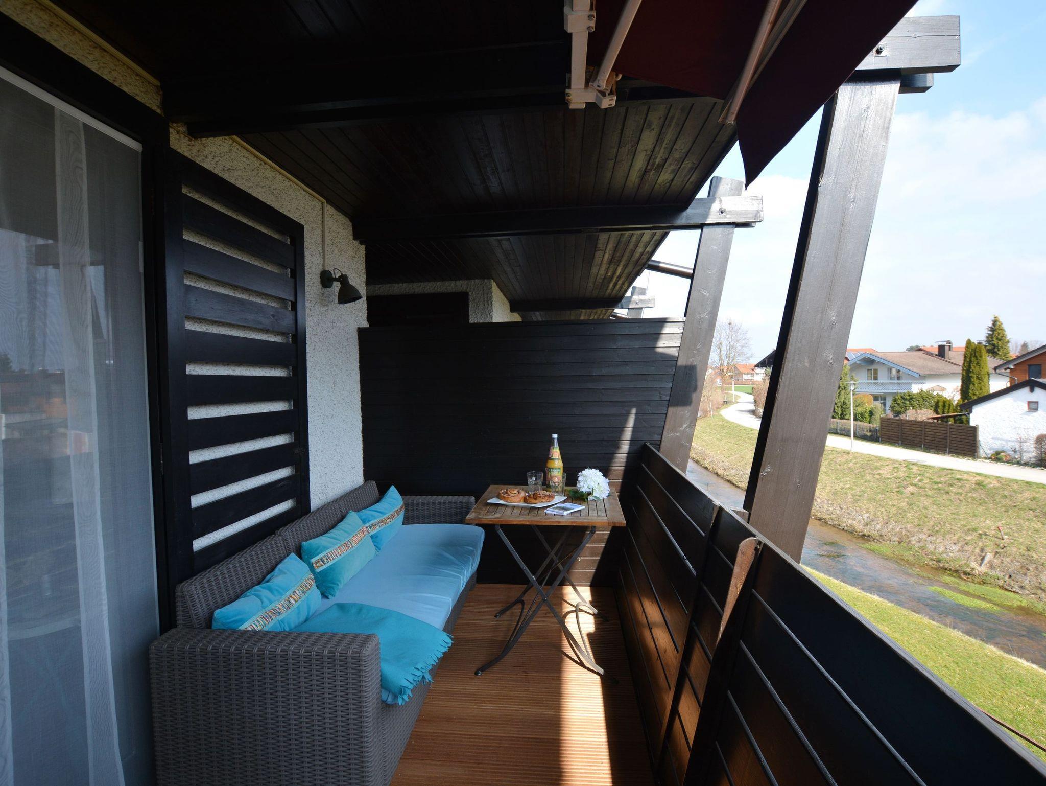 Die Ferienwohnung „Alpenperle“ befindet sich im 1. Obergeschoss (es sind jedoch zwei Stockwerke zu gehen) und bietet auf 53?m² Platz für bis zu 3 Personen. Sie verfügt über ein Schlafzimmer mit Doppelbett, einen offenen Wohnbereich mit voll ausgestatteter Küche und Schlafcouch, zwei TVs sowie ein modernes Bad mit Regendusche. Ein Highlight ist der große, umlaufende Süd-Ost-Balkon mit Outdoorküche, verschiedenen Sitzmöglichkeiten ? ideal zum Entspannen mit Blick auf die Berge und den nahegelegenen Bach.