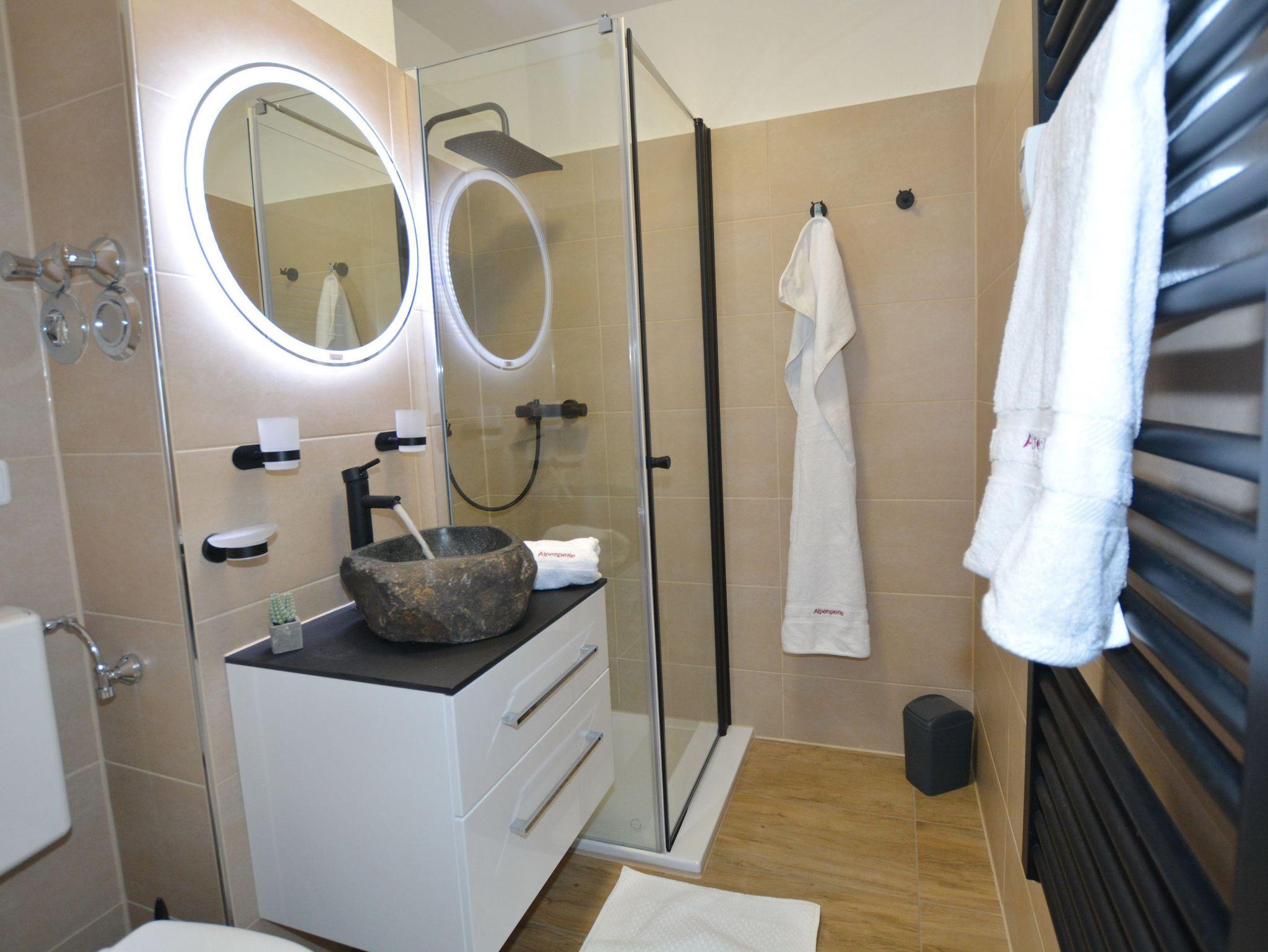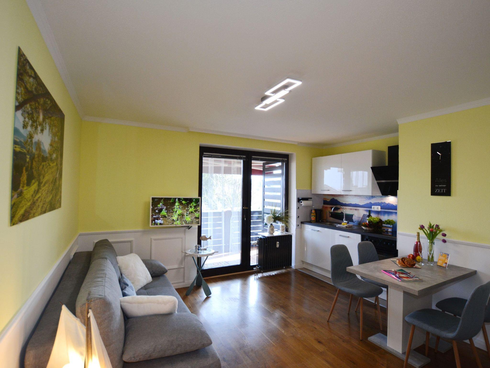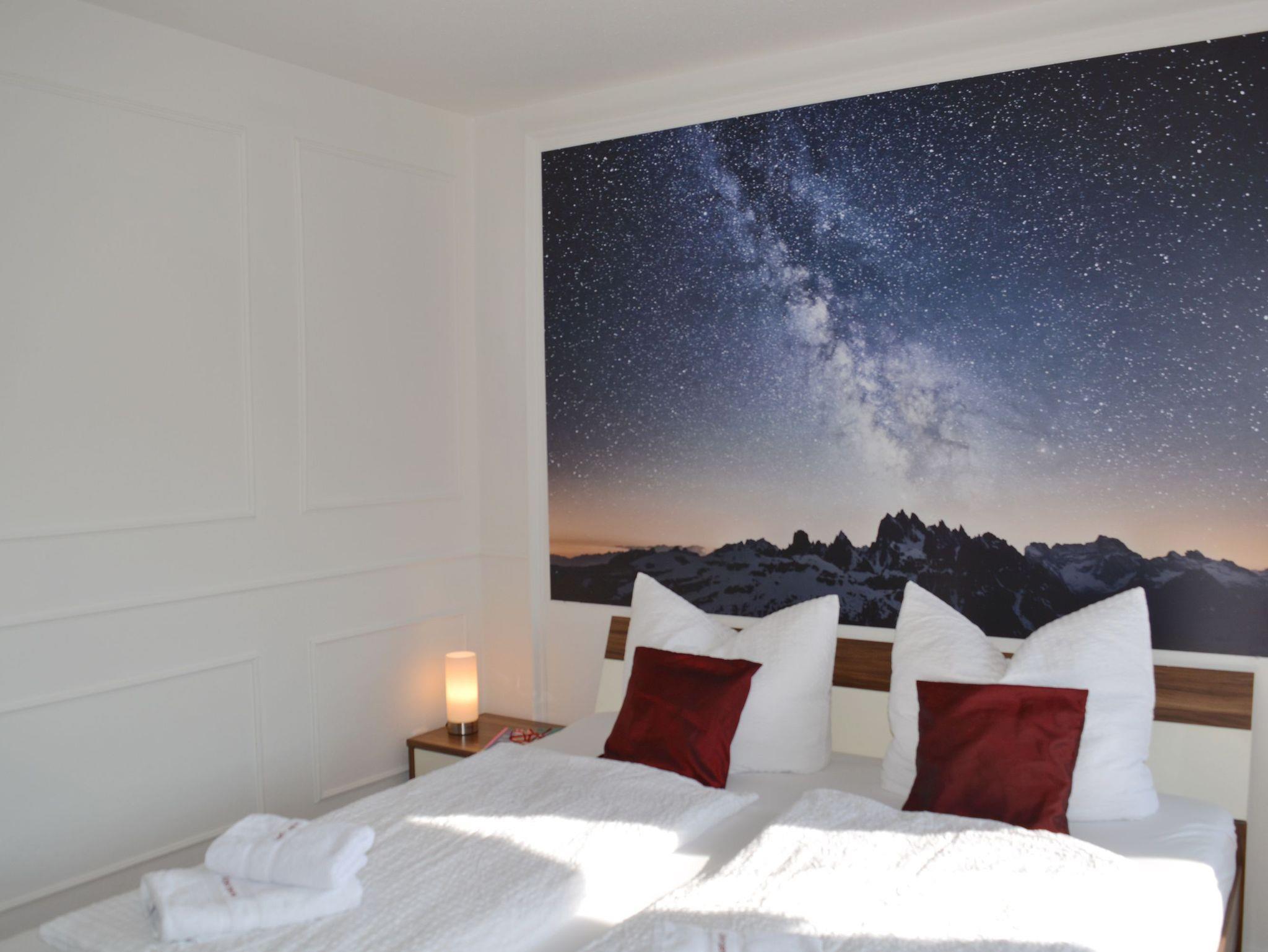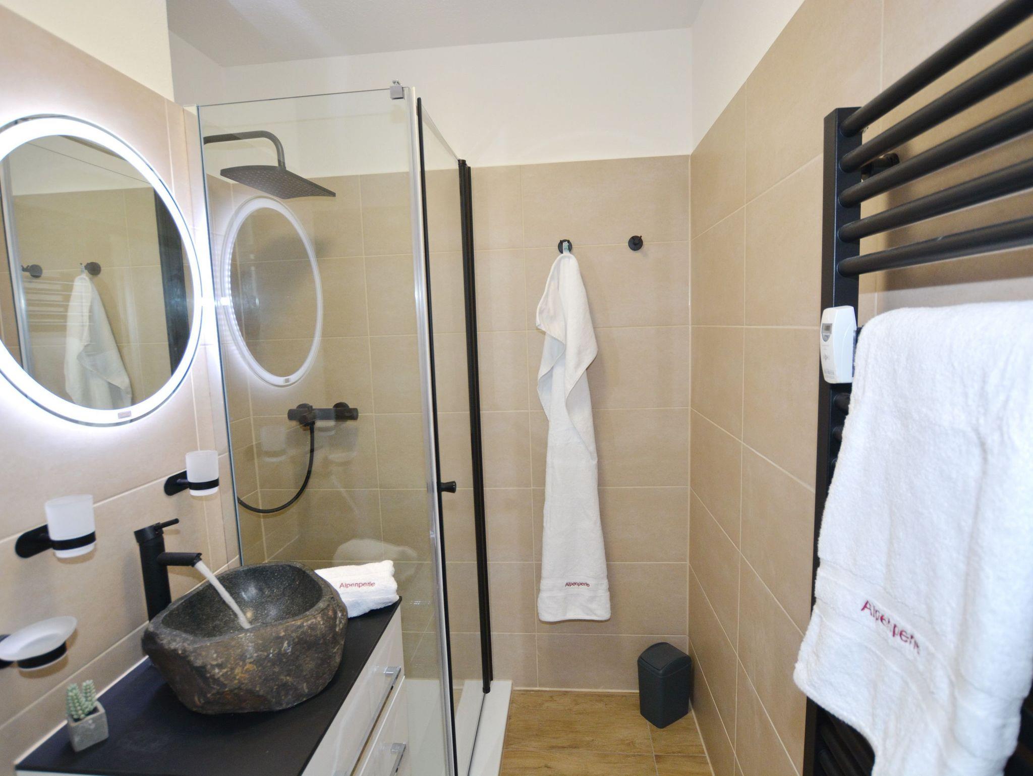 Die Ferienwohnung Alpenperle befindet sich im 1. Obergeschoss (es sind jedoch zwei Stockwerke zu gehen) und bietet auf 53?m² Platz für bis zu 3 Personen. Sie verfügt über ein Schlafzimmer mit Doppelbett, einen offenen Wohnbereich mit voll ausgestatteter Küche und Schlafcouch, zwei TVs sowie ein modernes Bad mit Regendusche. Ein Highlight ist der große, umlaufende Süd-Ost-Balkon mit Outdoorküche, verschiedenen Sitzmöglichkeiten ideal zum Entspannen mit Blick auf die Berge und den nahegelegenen Bach.