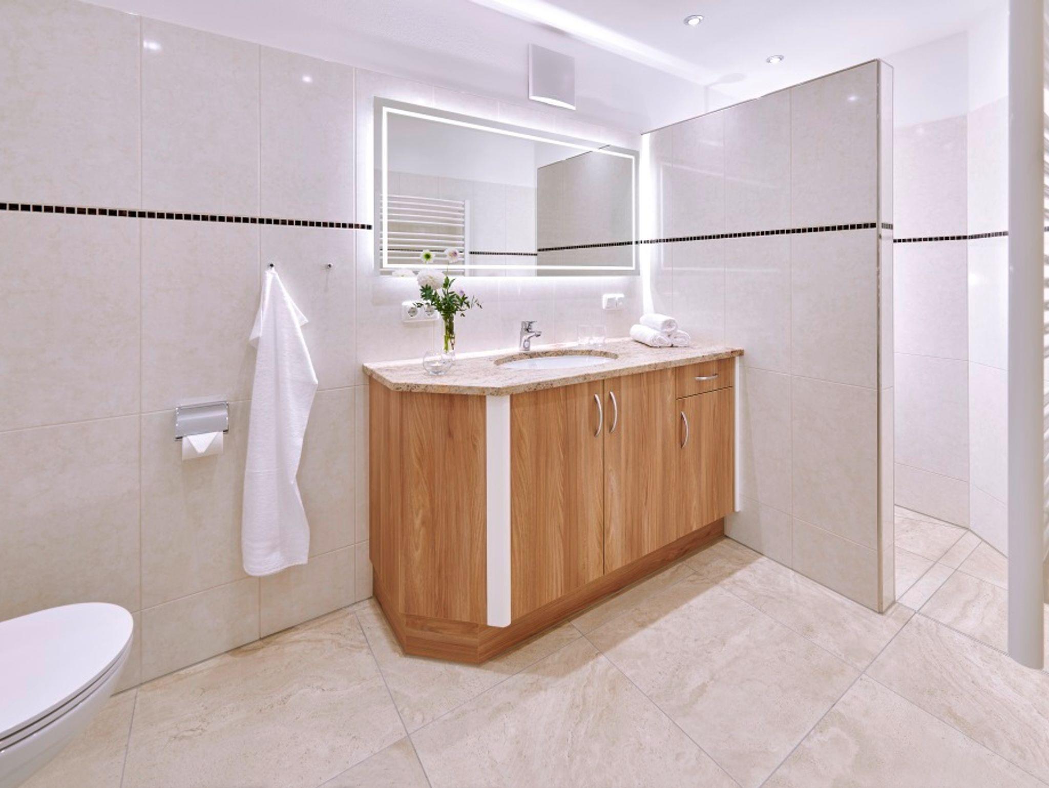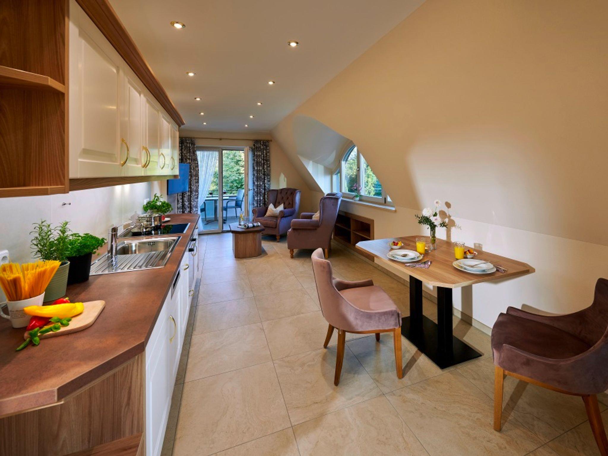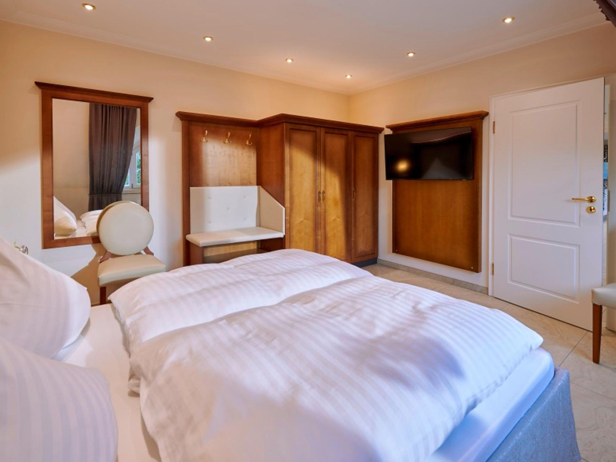 Die Ferienwohnung ist in Richtung Kurpark und Kirche (Nord-Ost) ausgerichtet. Der Balkon befindet sich auf der Ostseite. Alle Fewos sind ausgestattet mit Flachbild-Fernseher 40 bzw. 43 Zoll, Herd mit Backofen, Spülmaschine, Kühlschrank mit Gefrierfach, Kaffeemaschine, Toaster, Kochgeschirr, Geschirr, Safe, Föhn, WLAN, Geschirrtücher, Bettwäsche und Handtücher.Für alle Gäste: Aufzug, Aufenthaltsraum im EG, Waschmaschine und Trockner im EG, Terrasse im EG, Park (5000 m²) mit Liegen, ausreichend Parkplätze, abschließbare Fahrradgarage und Sauna.