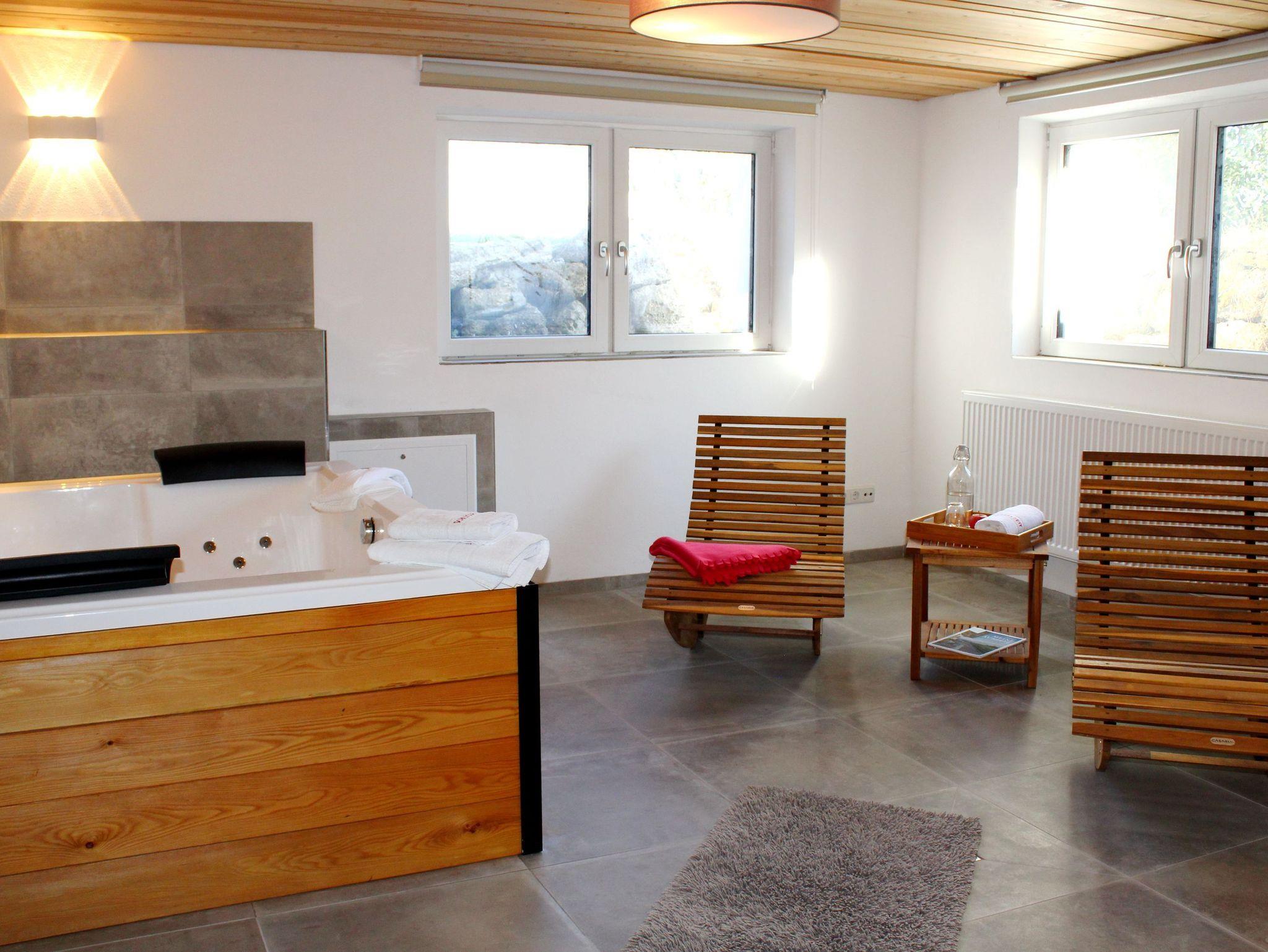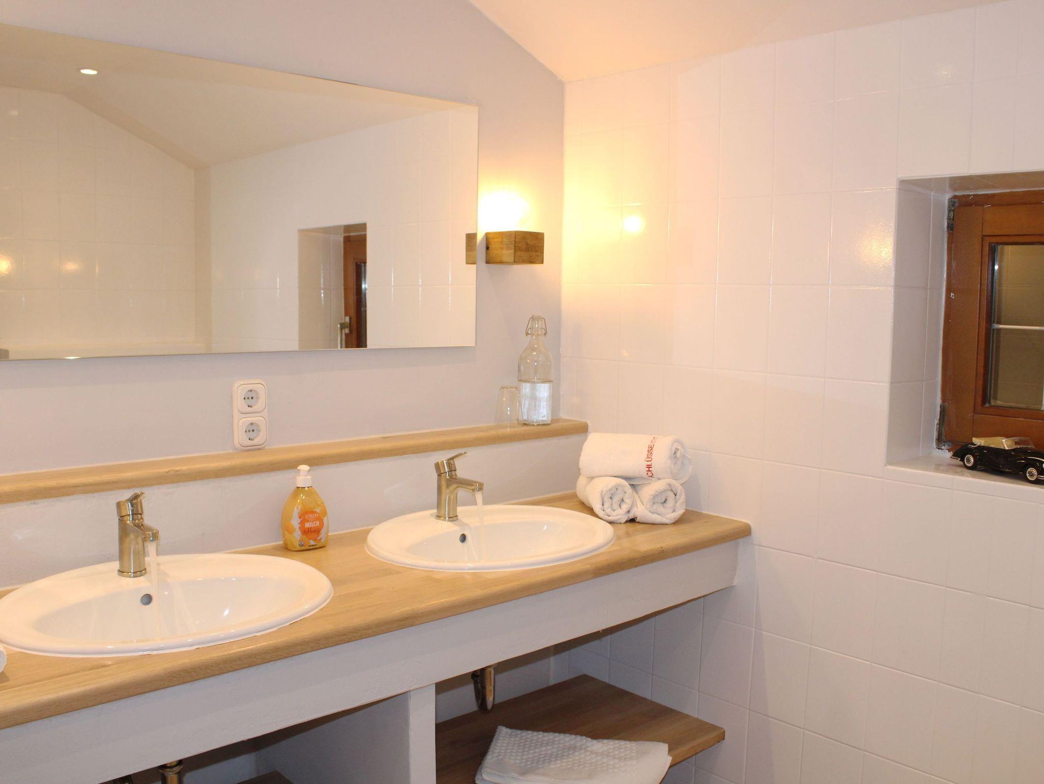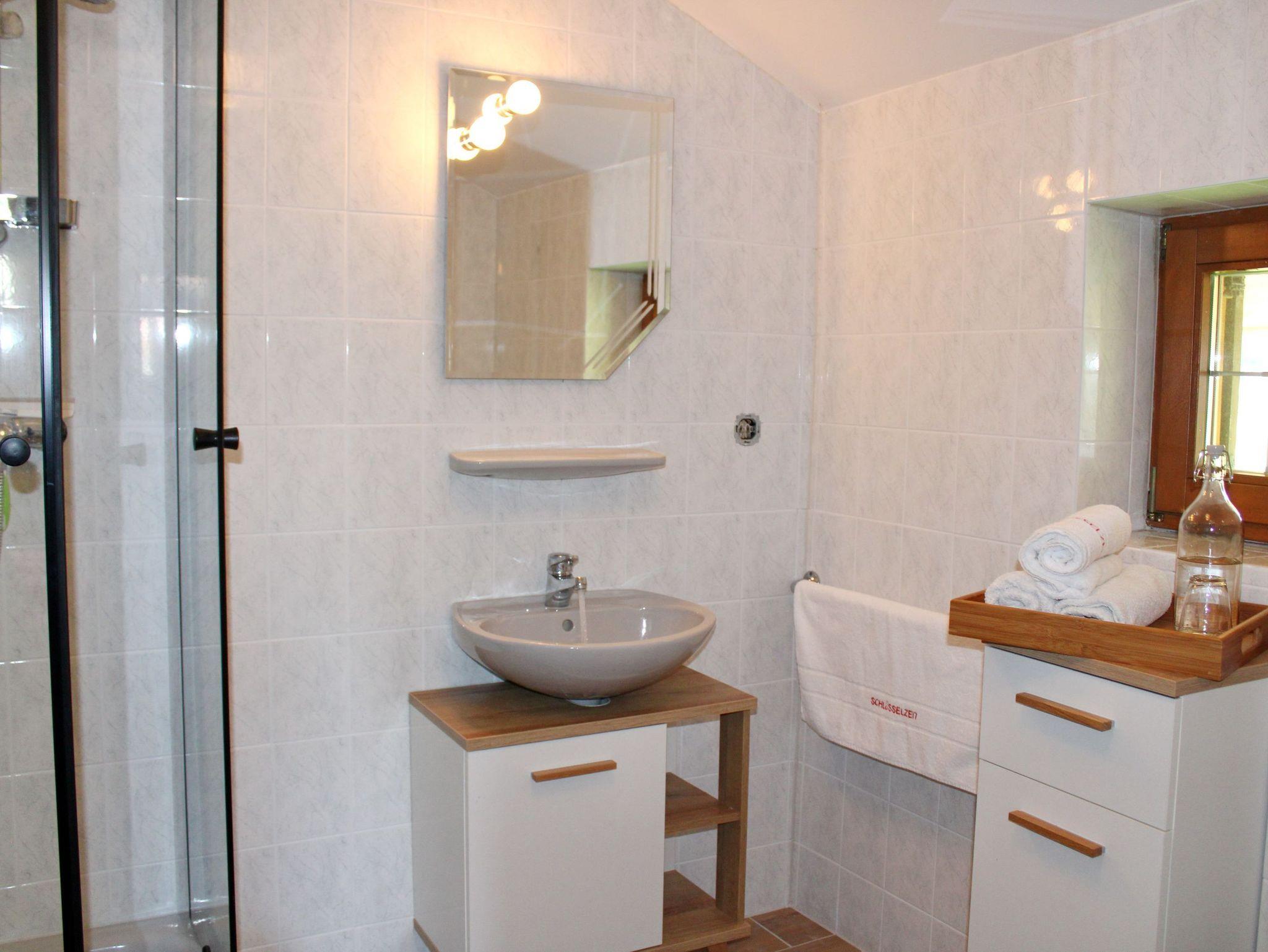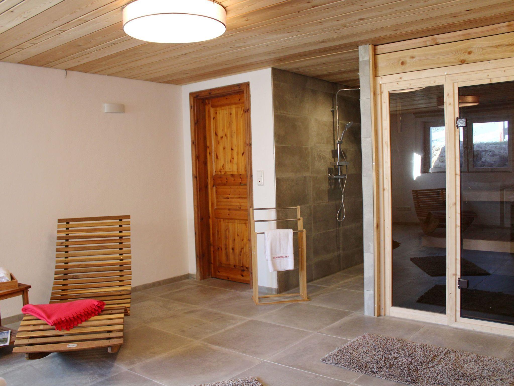 Im ersten Stock befindet sich ein Schlafzimmer mit Doppelbett, TV, Sofa und Badezimmer en Suite, welches mit Waschbecken, Dusche und WC ausgestattet ist. Getrennt auf dieser Etage ist ein weiteres Doppelzimmer mit TV und Sofa untergebracht, welches mit Balkon ausgestattet ist und mit seinem Blick in die Natur sowie auf den Chiemsee die Urlaubszeit unterstreicht. Der Durchgangsraum dieses Bereiches ist mit dem Stockbett (unten Liegefläche 110x200, oben 80x200) sicherlich nicht nur für Kinder von Interesse. Durch Lamellentüren kann das Stockbett abgetrennt werden. Das angrenzende kleine Badezimmer beinhaltet neben dem Doppelwaschbecken ein WC. Neben der Dusche und dem WC im Kellergeschoss ist ein weiteres WC im Erdgeschoss zu finden. Zusätzliche Entspannung bietet Ihnen der großzügige Wellnessraum im Kellerbereich mit Whirlpool, Sauna und Wellnessinsel. Ergänzt wird dieser Raum mit Dusche und WC. Ebenfalls im Keller steht die Waschmaschine zur Verfügung. Die große Eingangslobby und die Speis vervollständigen das Feriendomizil.