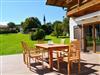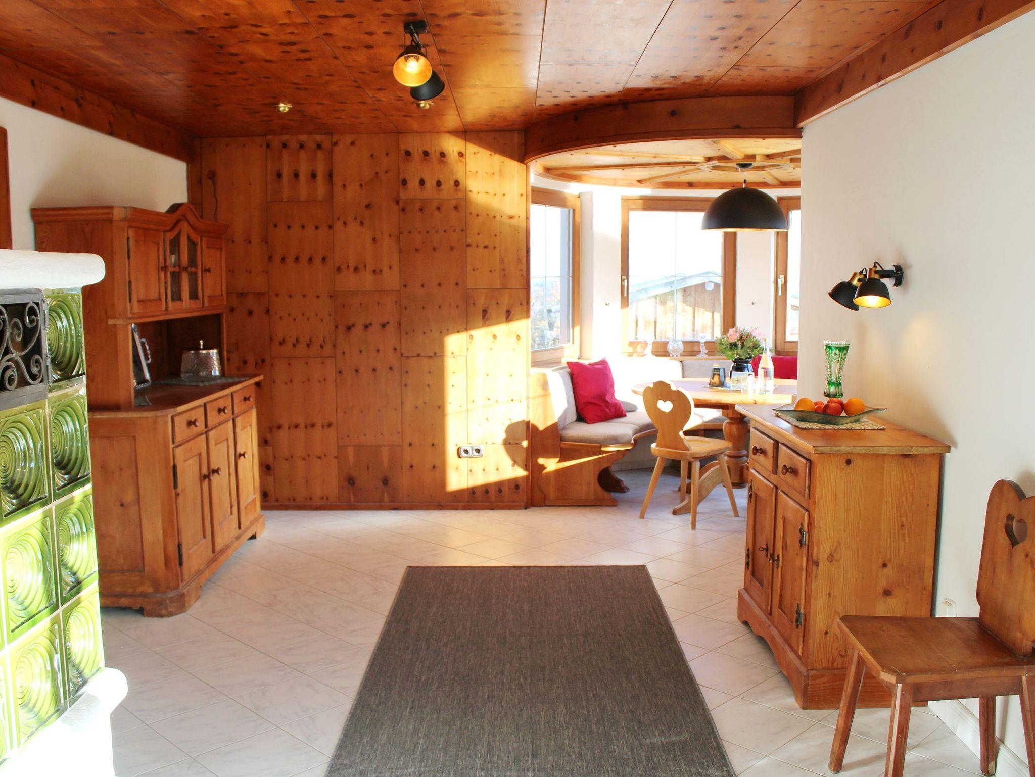 Der helle und großzügige Wohnbereich mit vielen Sitzmöglichkeiten und großem TV lädt zum Entspannen im Erdgeschoss ein. Für kuschelige Wärme sorgt der im typisch bayerischen Stil gehaltene Kachelofen. Die Holzvertäfelung unterstreicht den alpenländischen Charakter des Essbereiches mit Erker, welcher optisch durch den Kachelofen vom Wohnbereich getrennt ist. Hier findet sicherlich jeder seinen Rückzugsort. Die Küche lädt ein, seine Liebsten ausgiebig mit regionalen Köstlichkeiten zu verwöhnen und anschließend entspannt einen erfüllten Tag auf der großen Terrasse und im Garten ausklingen zu lassen. Terrasse und Garten können über den Wohnbereich betreten werden. Zwei Gartensofas laden zur Erholung inmitten der Natur mit wunderschönem Blick auf den Chiemsee ein.