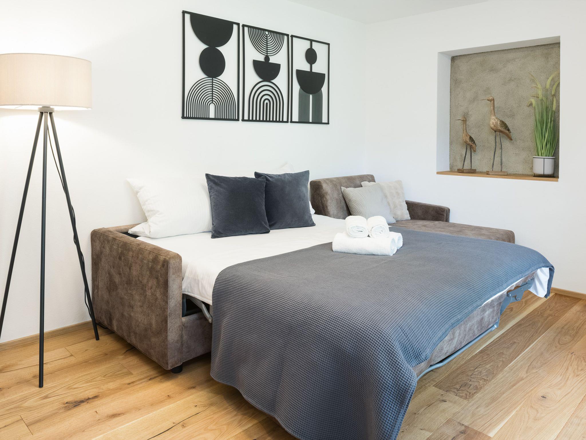 Damit Dein Schlaf erstklassig ist, wartet auf Dich im Schlafzimmer ein gemütliches Boxspring Doppelbett mit Bettwaren auf Hotelniveau. Des Weiteren wurde bei dem Schlafsofa eine hochwertige Ausführung mit extra Schlaffunktion gewählt.