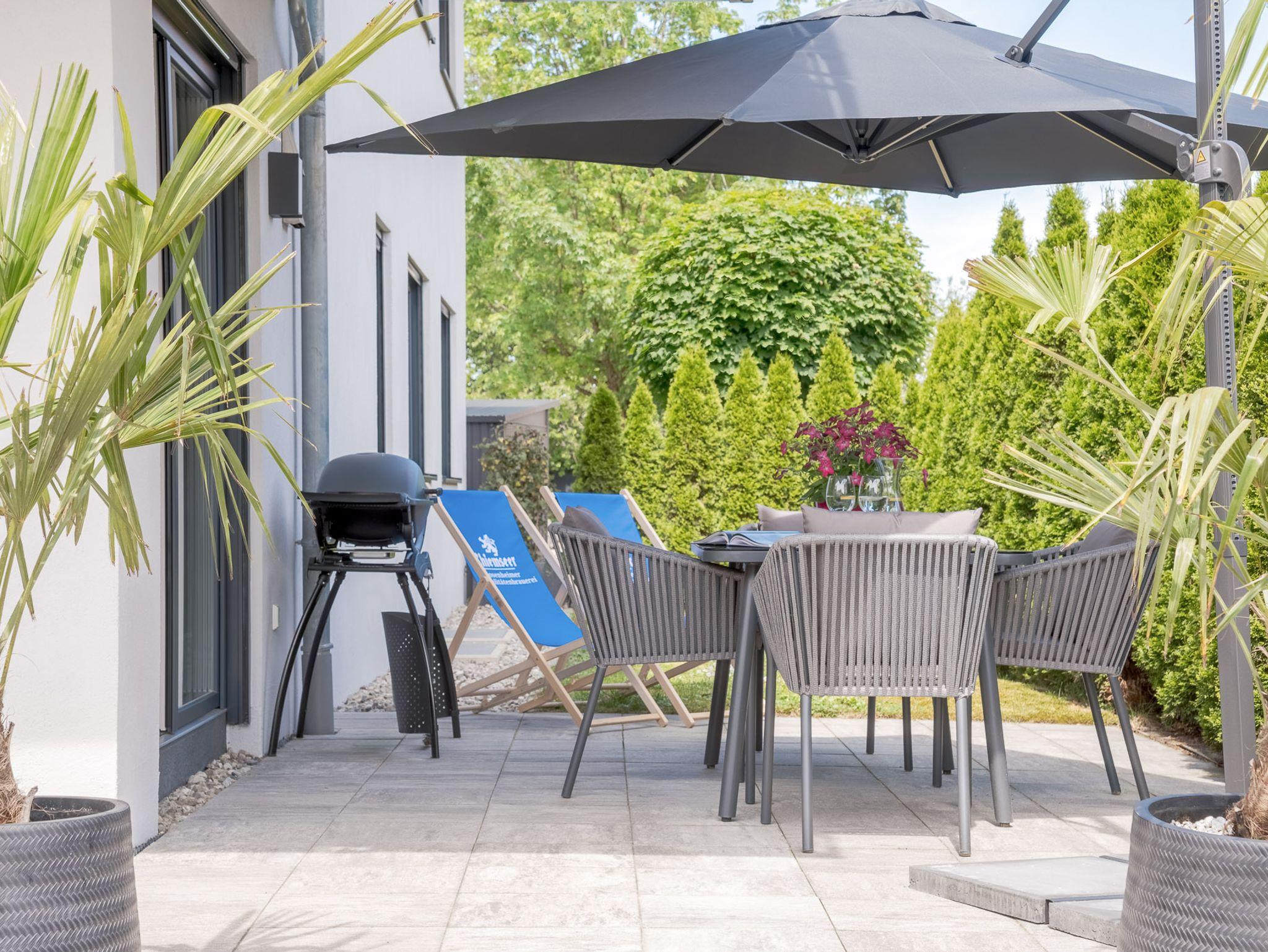 Auf der Terrasse und im Garten erwarten Dich weitere Sitzmöglichkeiten, Liegestühle zum relaxen und ein Weber-Grill für gemütliche Abende.