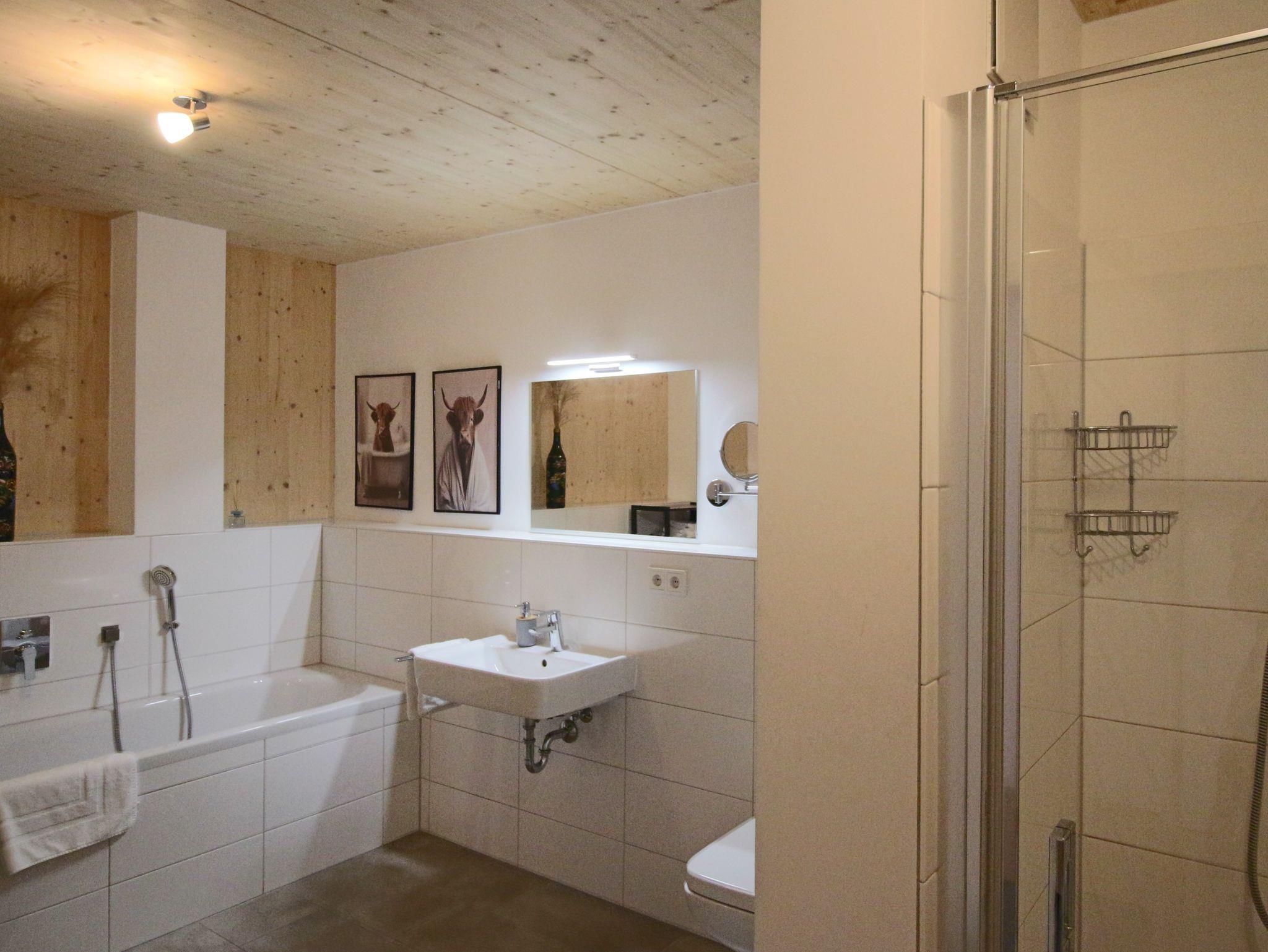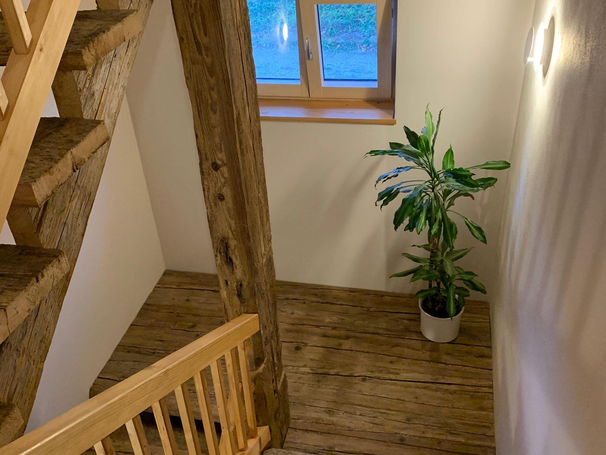 Unsere großzügige Ferienwohnung verbindet modernen Wohnkomfort mit dem unverwechselbaren Charme eines über 500 Jahre alten Bauernhauses. Sie befindet sich im ersten Stock des neu errichten Anbaus, in dem liebevoll Elemente aus dem alten Holz der Scheune integriert wurden.