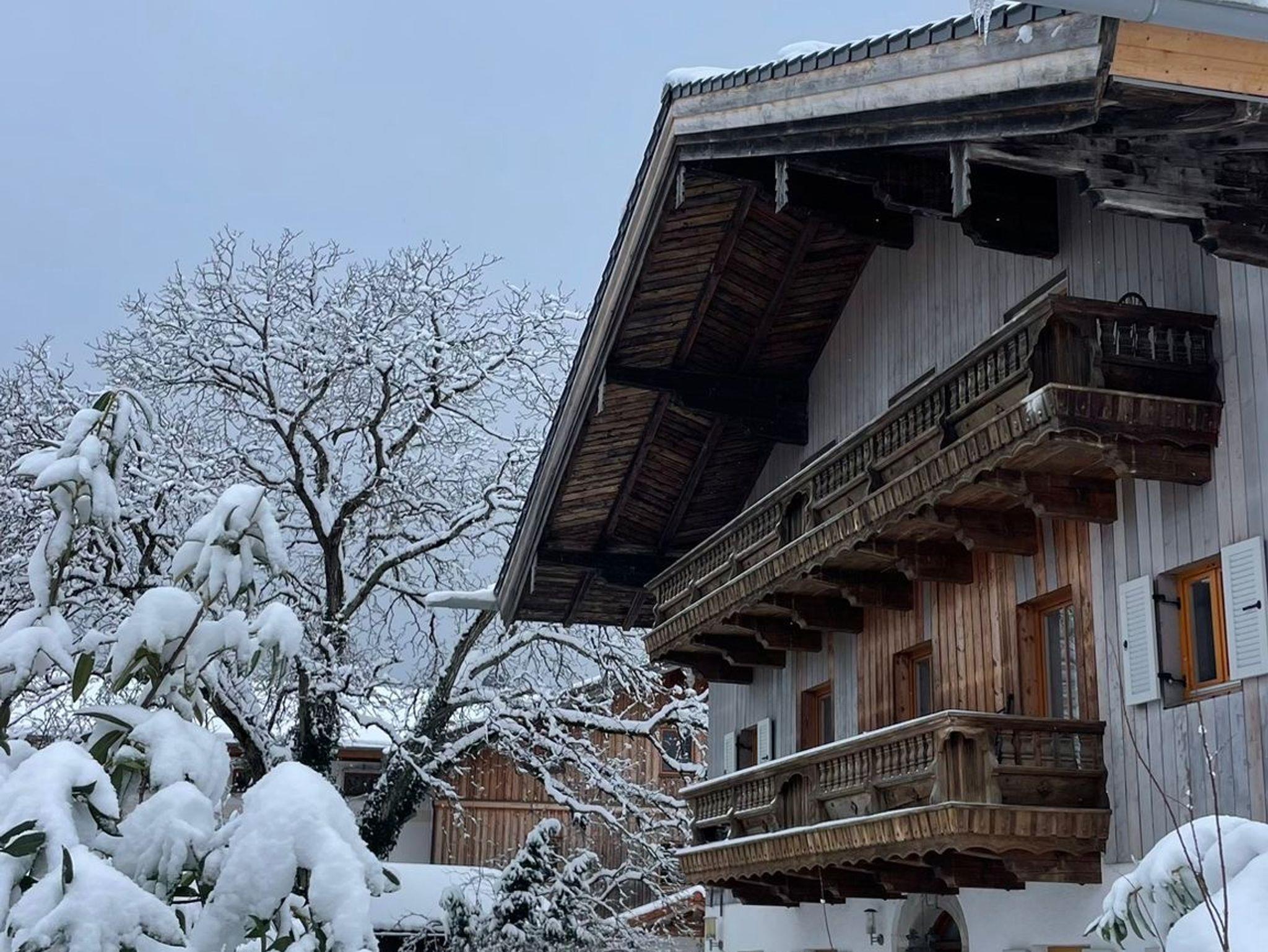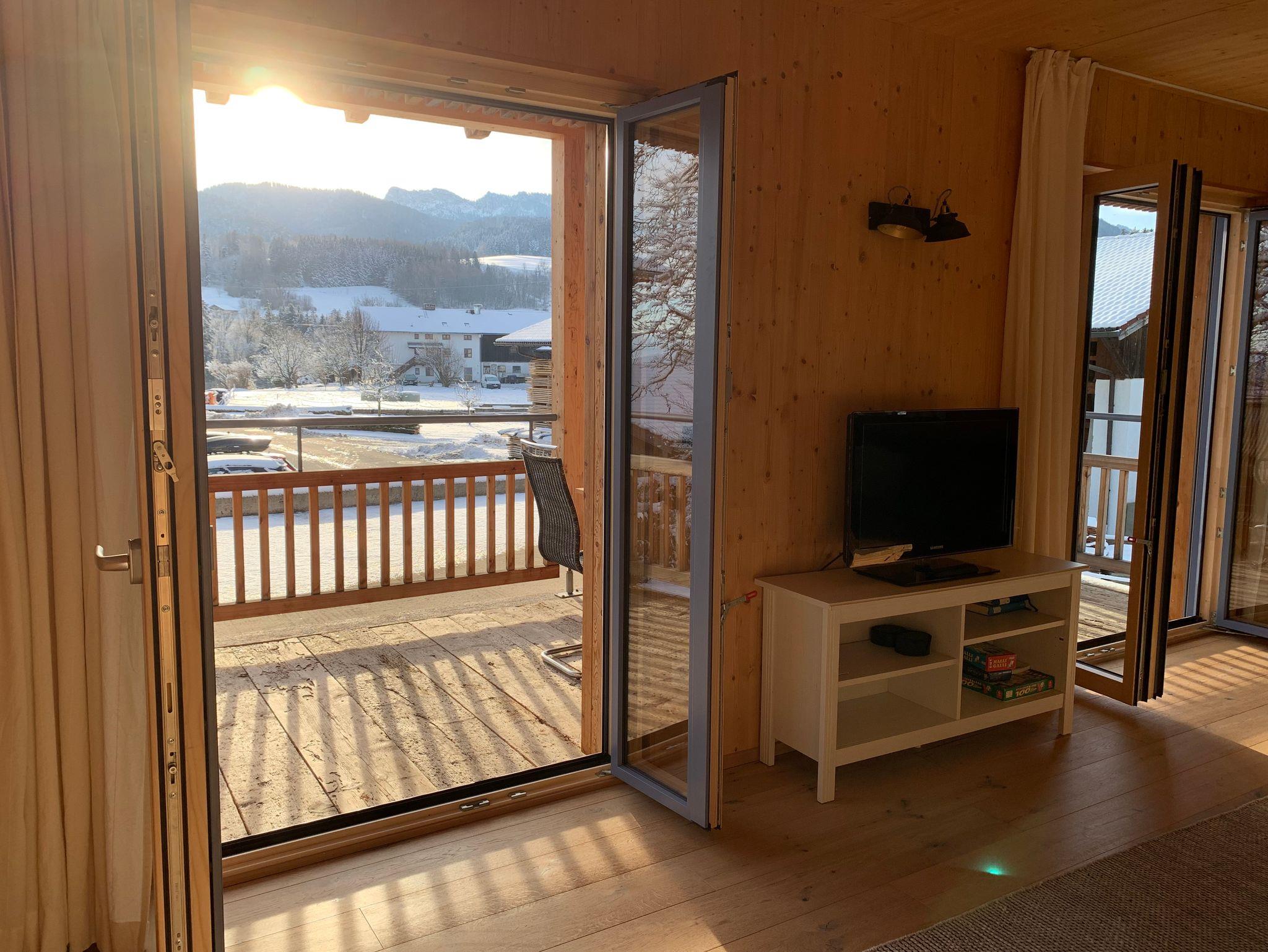 Vom überdachten Südbalkon eröffnet sich ein herrlicher Blick auf die Kampenwand – ein Panorama und Lichtspiel, das zu jeder Jahreszeit begeistert.