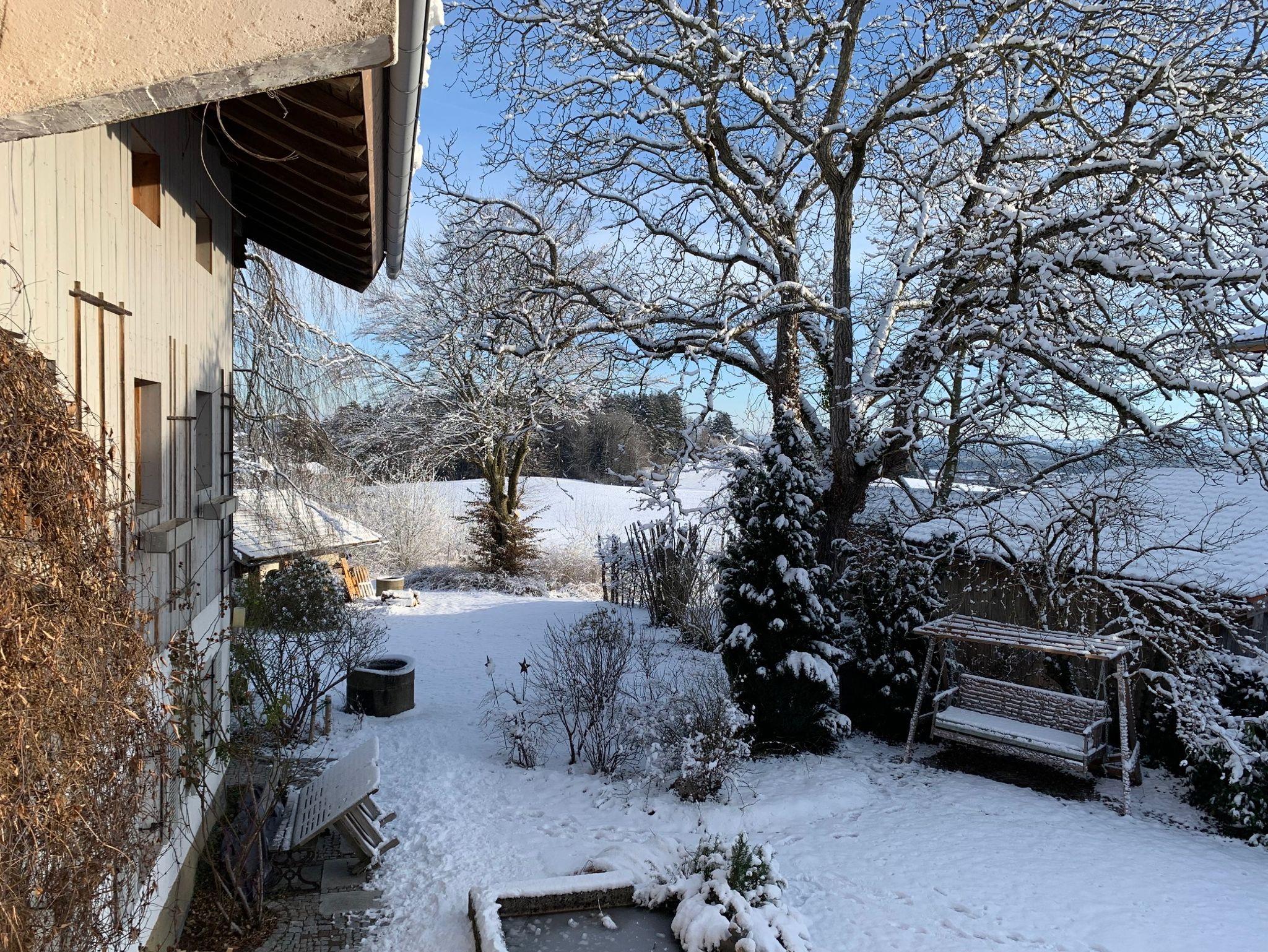 In einem idyllischen Weiher mit 6 alten Bauernhäusern befindet sich Ihre Ferienwohnung im Neubau unseres 500 Jahre alten Bauernhauses. Der Blick schweift von der Anhöhe auf die Kampenwand und über Bernau - Natur pur!