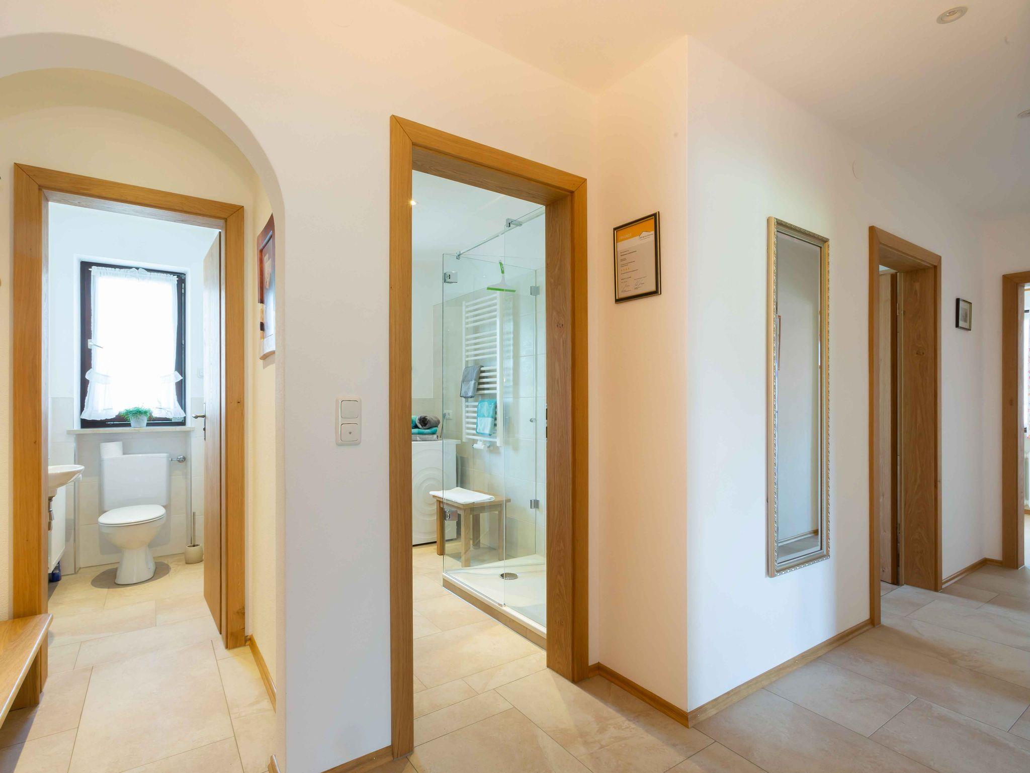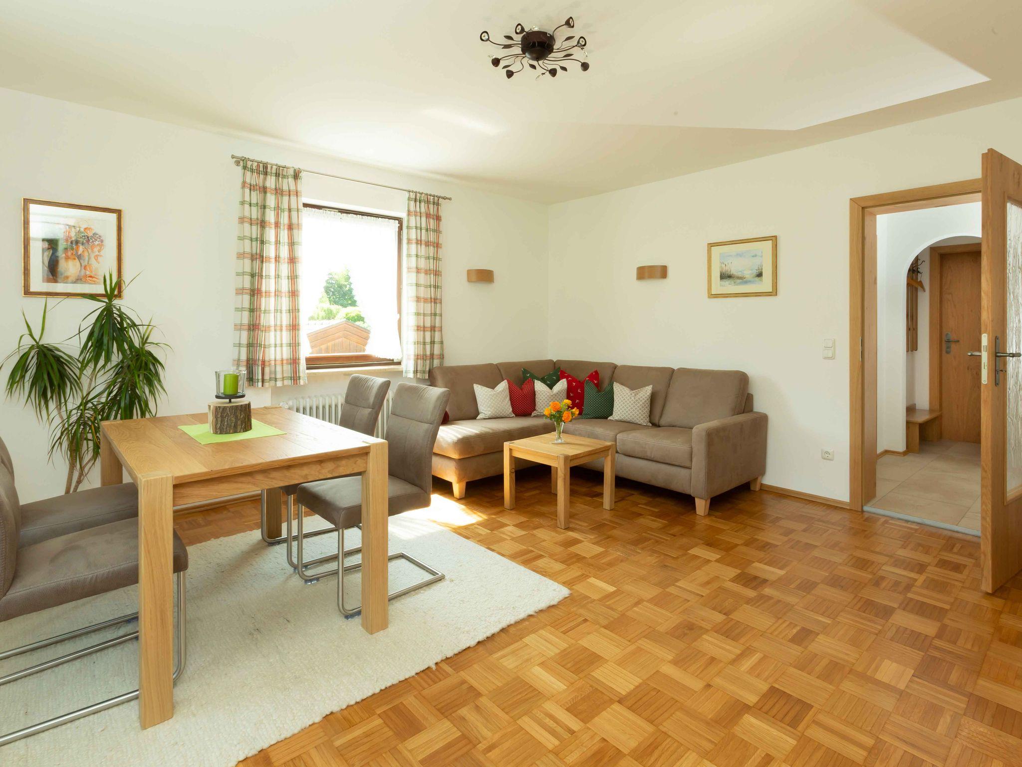 Ankommen, genießen und neue Kräfte würde uns freuen, Sie als Gäste in unserer 5-Sterne-Ferienwohnung begrüßen zu können. Es erwartet Sie eine 80m² große Wohnung im 1.OG, die reichlich Platz für einen erholsamen Urlaub bietet. Starten Sie Ihren Tag mit einem gemütlichen Frühstück in der Morgensonne auf unserem großen Süd-/Ostbalkon und genießen den herrlichen Blick auf die Chiemgauer Berge. Die 2020 neu renovierte Ferienwohnung verfügt über zwei Schlafzimmer. Im großzügig geschnittenen Wohnzimmer befindet sich eine gemütliche Eckcouch, eine Sitzgruppe mit herrlichen Blick aus dem Fenster, ein HD-Flachbildschirm-TV, Sat-TV und Radio/CD. Badezimmer mit großer Dusche, Handtuchheizkörper, Fußbodenheizung und Waschmaschine. Unsere Küche ist komplett ausgestattet mit E-Herd, Backofen, Geschirrspüler, Kühlschrank mit Gefrierfach, Wasserkocher, Kaffeemaschine, Toaster, Eierkocher, Handrührgerät, Bügeleisen/-brett, Geschirrtücher, Mikrowelle auf Wunsch. Kostenfreies W-Lan.