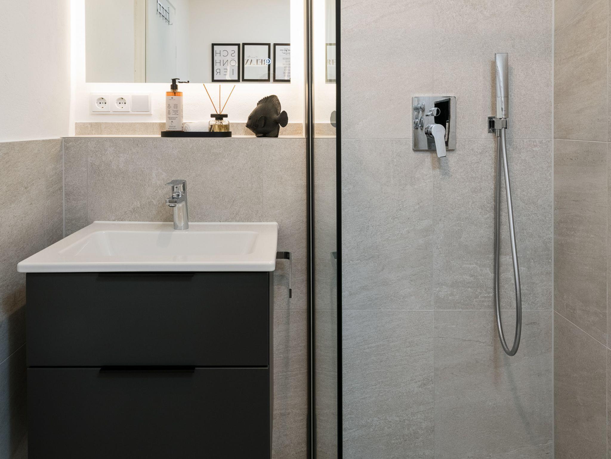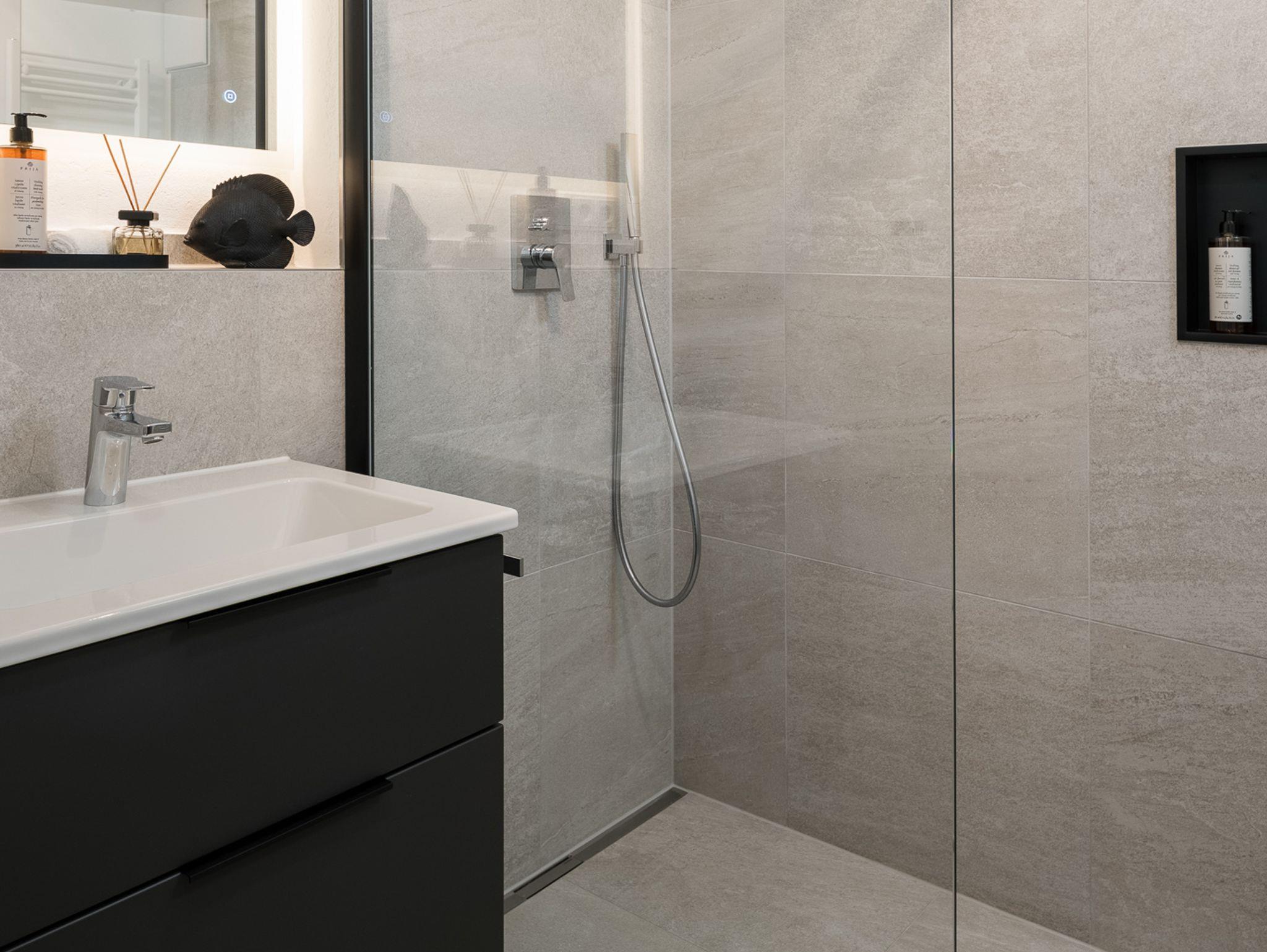 Genieße nach einem erlebnisreichen Tag pure Erfrischung in der hochwertigen, begehbaren Dusche unseres stilvollen Badezimmers.