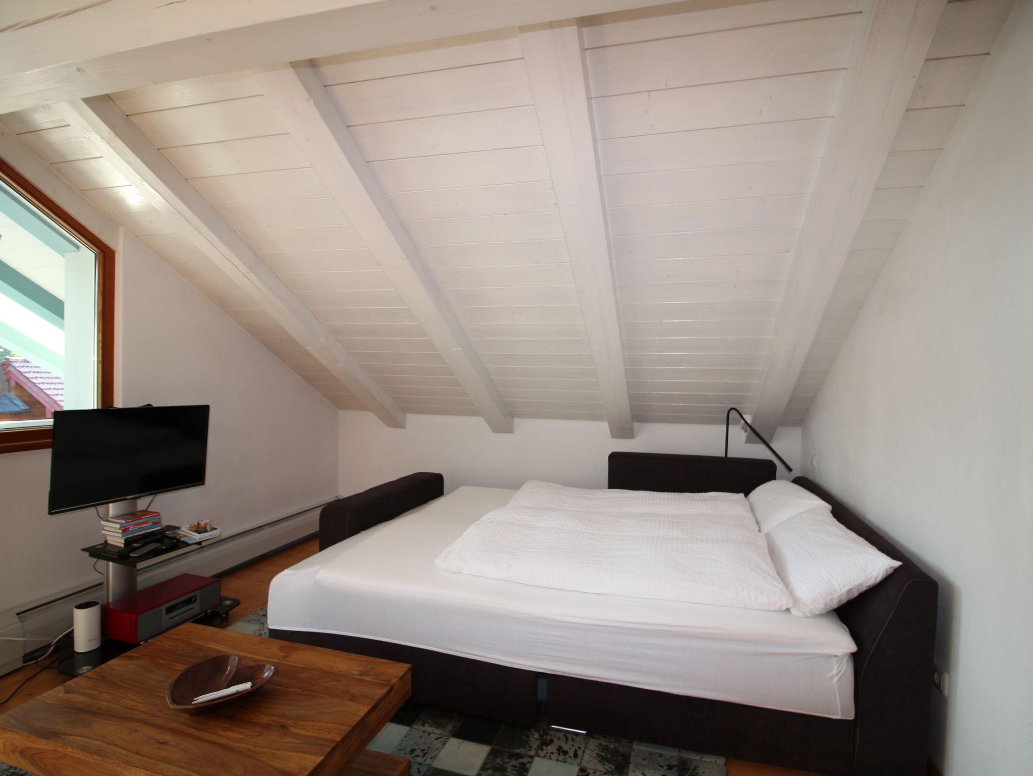Das Schlafzimmer verfügt über ein komfortables Doppelbett (1,80 m Breite) mit erstklassigen Matratzen und Bettwäsche in Hotelqualität. Handtücher in Hotelqualität sind selbstverständlich inklusive. Ein separates, sehr bequemes Schlafsofa bietet zusätzliche Schlafmöglichkeiten und kann durch eine Gardine optisch vom restlichen Raum getrennt werden – perfekt für flexible Nutzung.