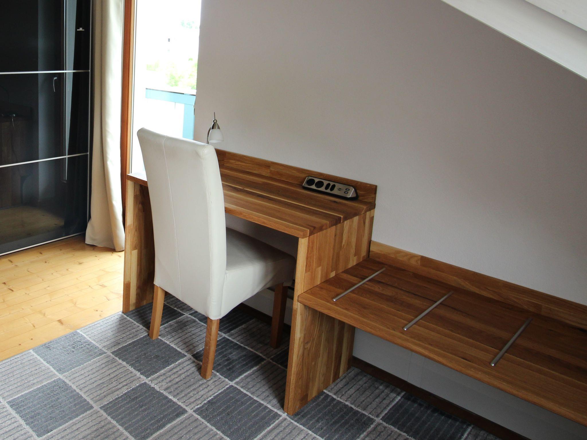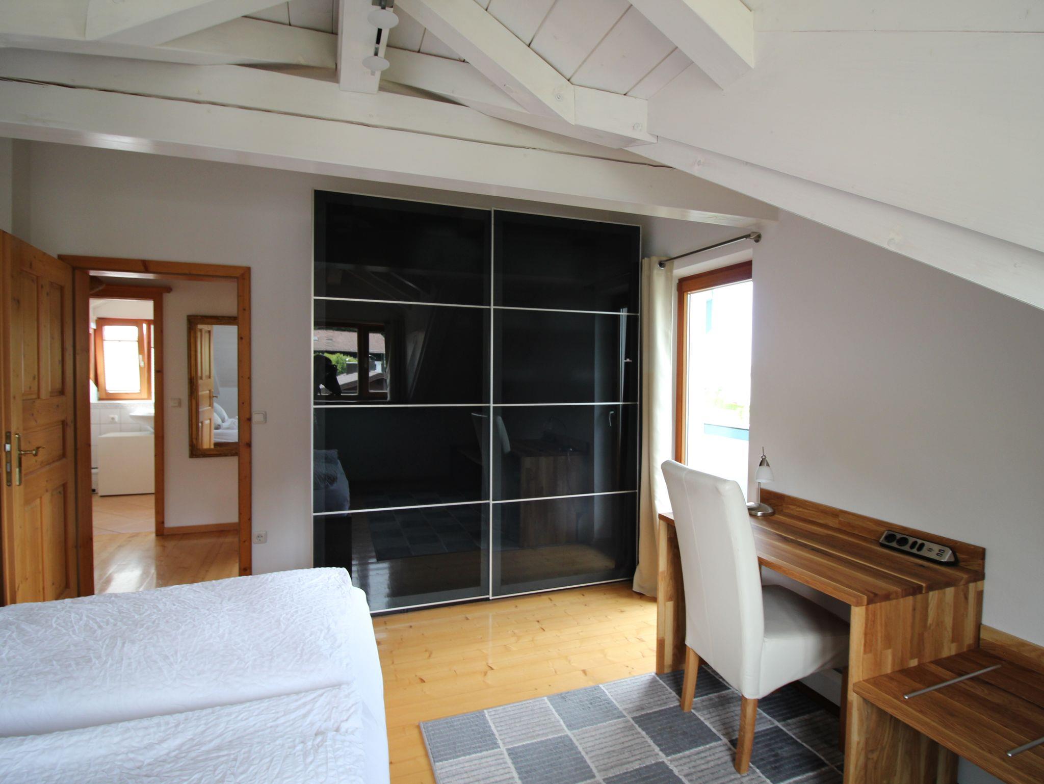 Im Schlafzimmer steht Ihnen ein 1,80 m breites Bett mit gemütlichen Matrazen und Daunenbetten und -kissen zur Verfügung (alternative Kissen liegen bereit), um Ihnen den optimalen Schlaf zu ermöglichen. Schrank, Schreibtisch und Kofferablage vervollständigen das Angebot.