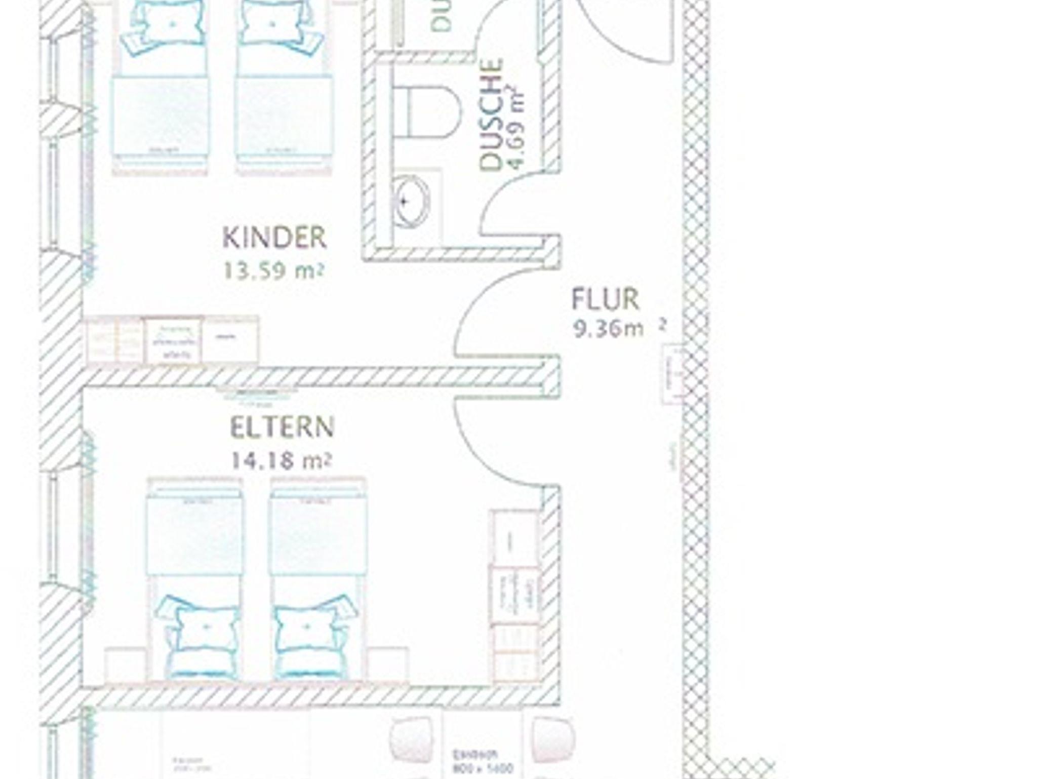 • ein Schlafzimmer mit Doppelbett, das wir gerne zu getrennten Betten umbauen