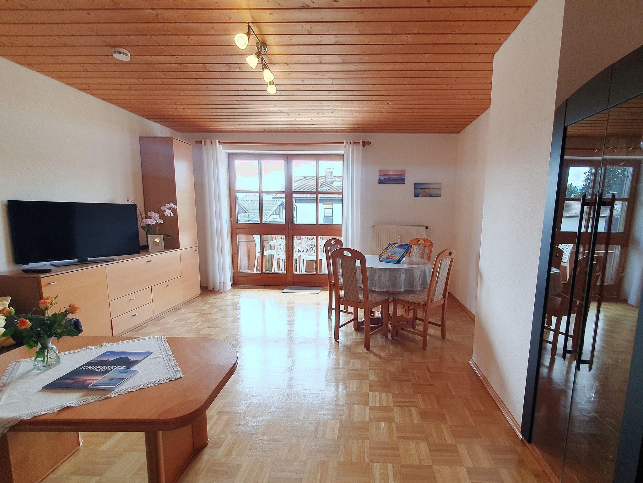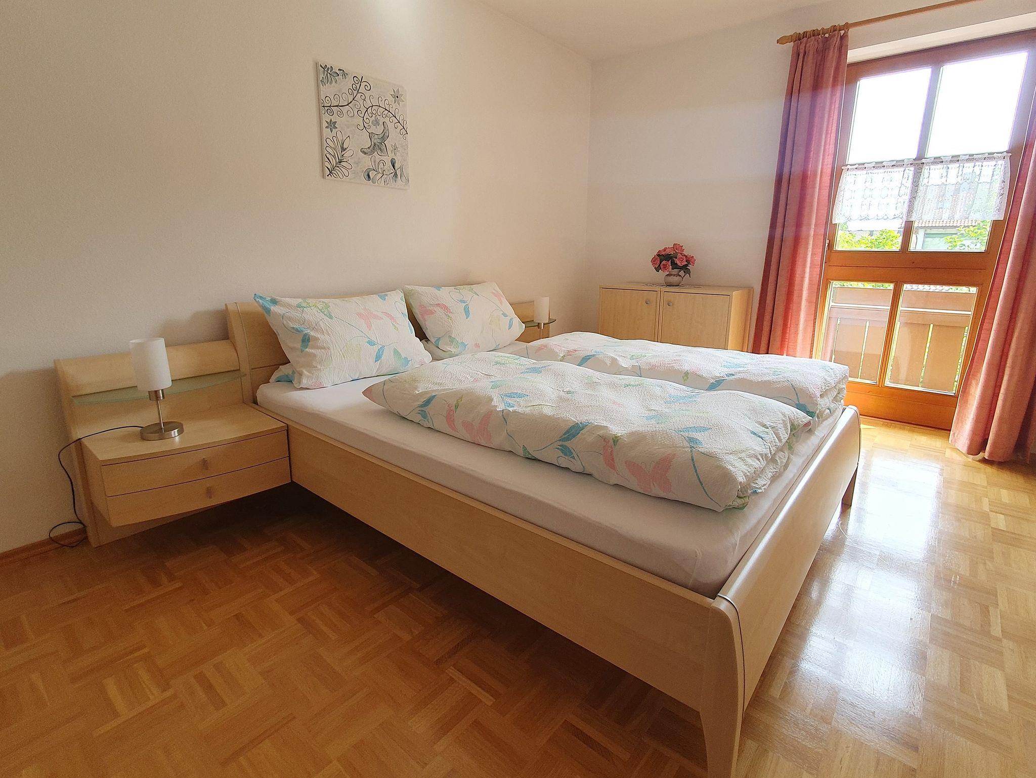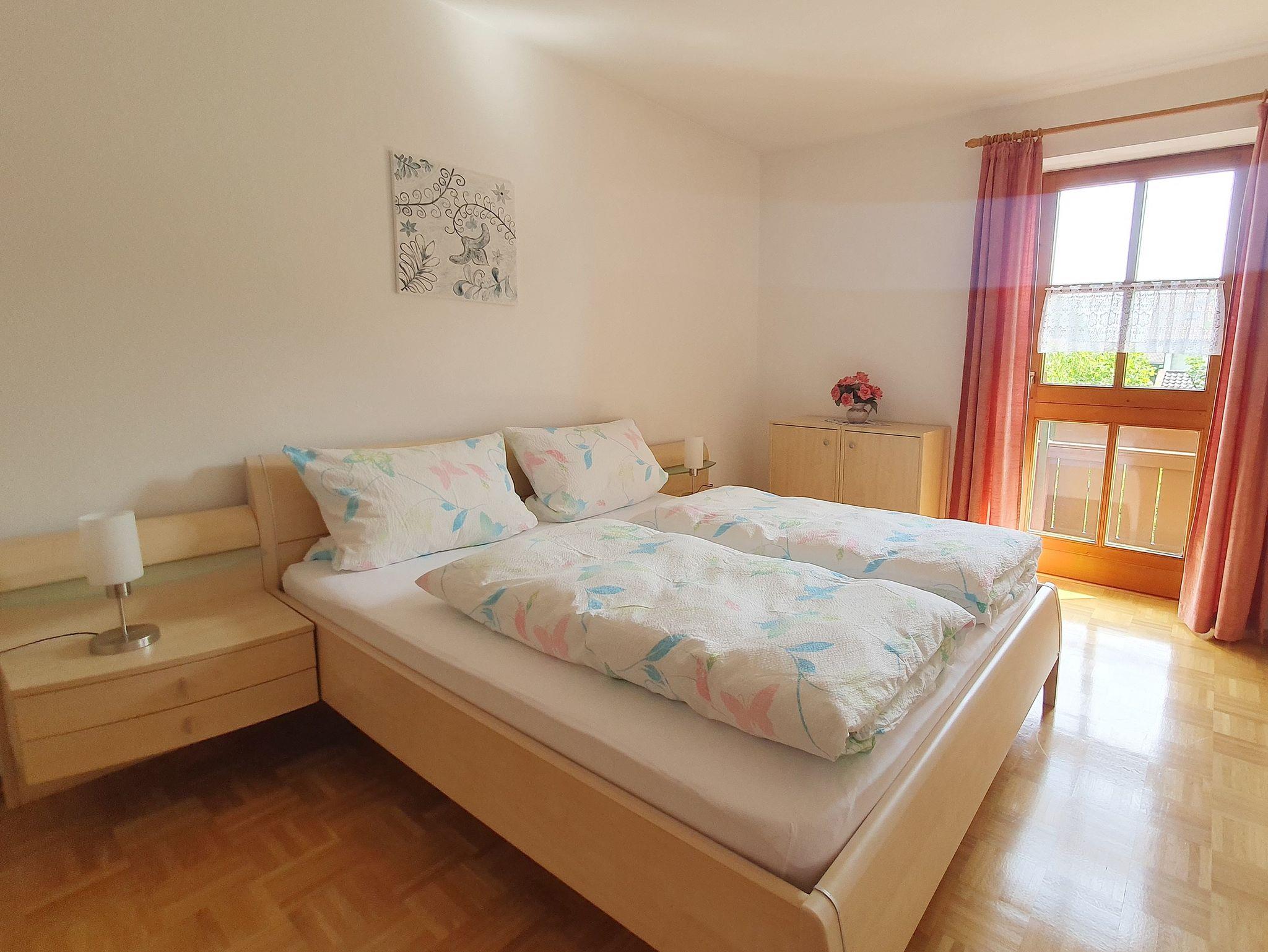 Verbringen Sie ein paar schöne Urlaubstage in der großzügig geschnittenen und lichtdurchfluteten Wohnung mit 120 qm im 1. Obergeschoss. Die Ferienwohnung verfügt über 3 Schlafzimmer, eines davon mit einem Doppelbett, die anderen mit Einzelbetten und einem zusätzlichen Kinderbett. Die 2022 neu eingebaute Küche ist ausgestattet mit einem Herd, Backofen, Kühlschrank, Geschirrspülmaschine, Wasserkocher, Kaffeemaschine, Toaster und einer Mikrowelle. Im Nebenzimmer befindet sich das Esszimmer mit Platz für die ganze Familie und Blick auf die Berge. Das Wohnzimmer mit der großen Eckcouch verfügt über einen SAT-TV. Vom Wohnzimmer und den Schlafzimmern haben Sie Zugang auf den Ost-/Südbalkon mit Blick auf die Chiemgauer Alpen. Das Badezimmer verfügt über eine Badewanne/Dusche, zwei Waschbecken und ein WC. In der Wohnung befindet sich noch ein zusätzliches WC. Ein Hauseigener Parkplatz wird Ihnen kostenfrei zur Verfügung gestellt. Kostenfreies WLAN ist in der Wohnung vorhanden. Haustiere sind nicht erlaubt. Für mitgebrachte Fahrräder steht Ihnen eine abschließbare Garage zur Verfügung.