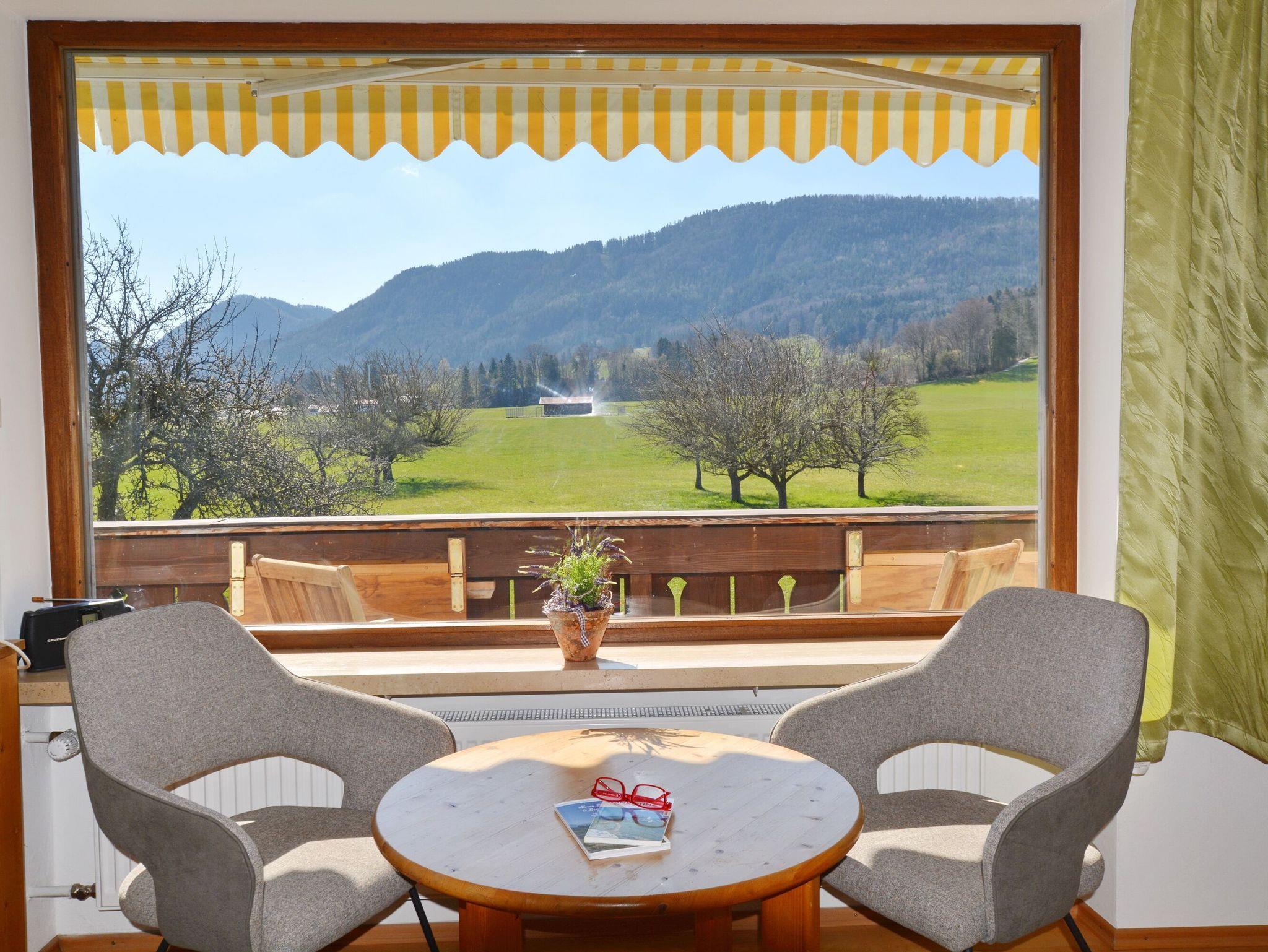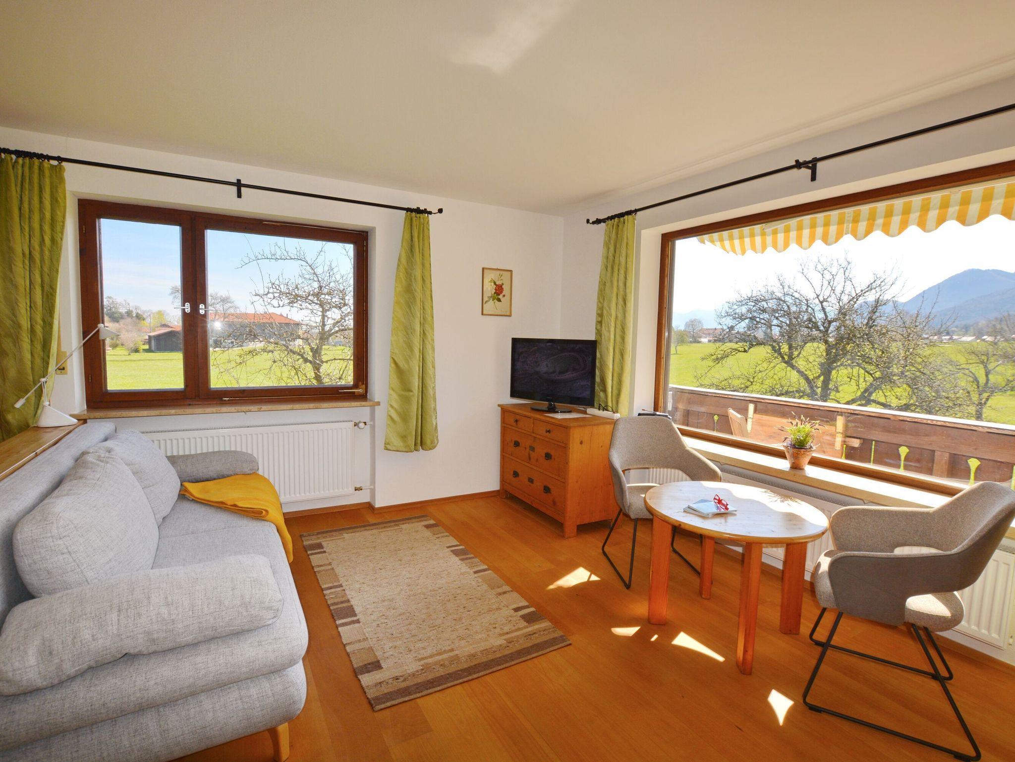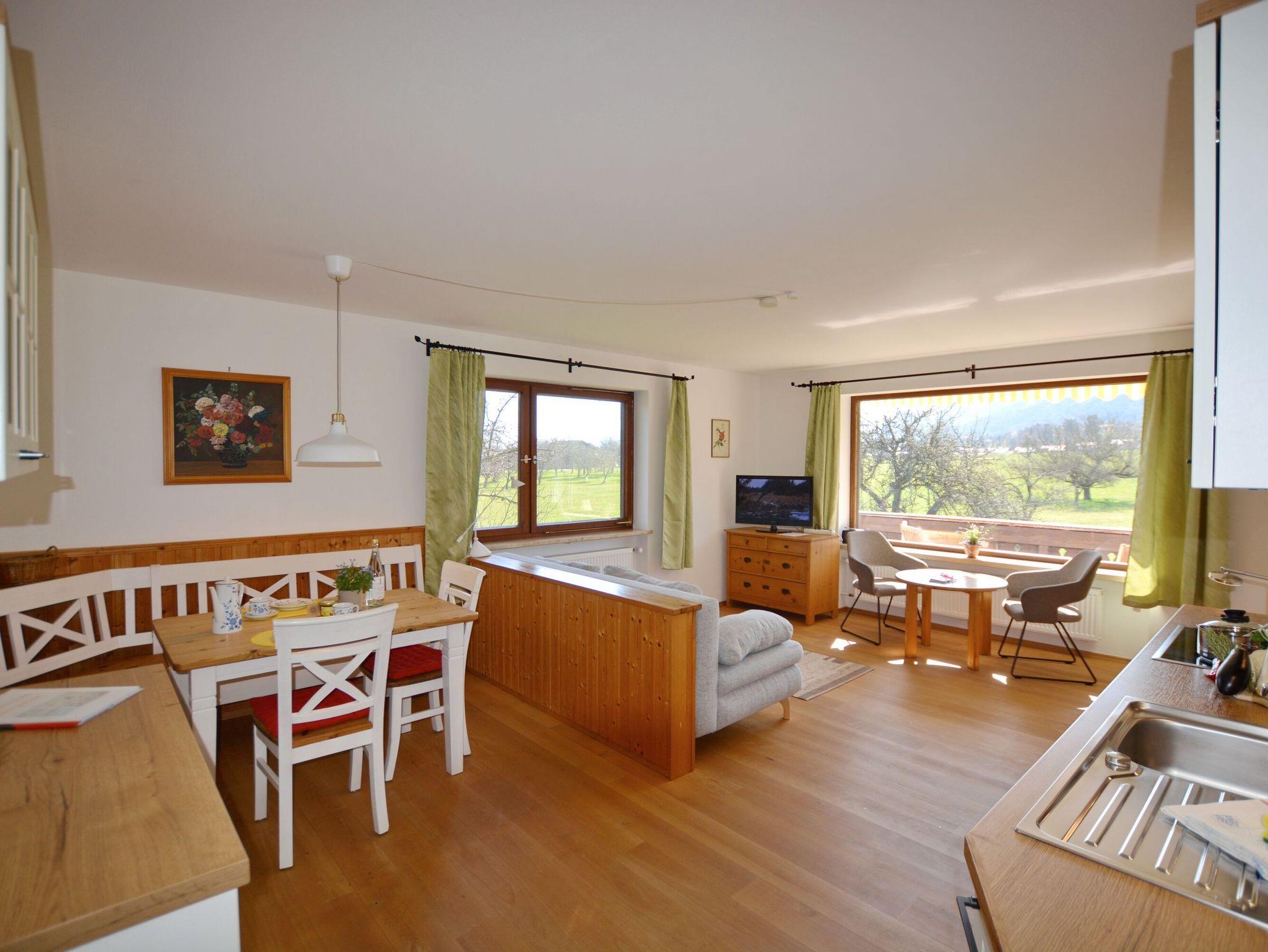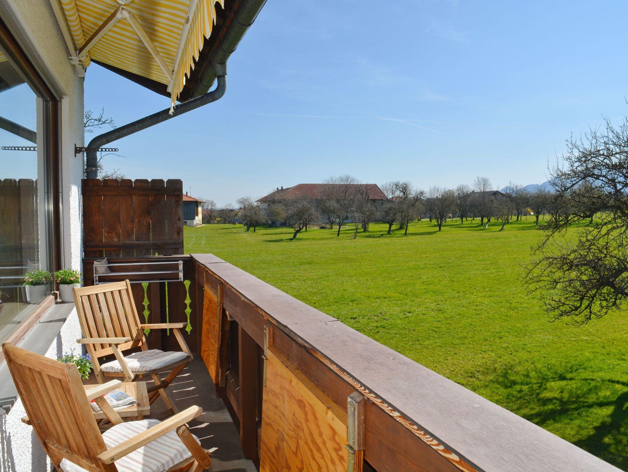 Die großzügige 2-Zimmer-Wohnung für bis zu 4 Personen befindet sich im 1.Stock und verfügt über einen Südbalkon, von dem aus Sie eine faszinierende Aussicht über die Obstbäume, Wiesen und die Bergkette genießen können.