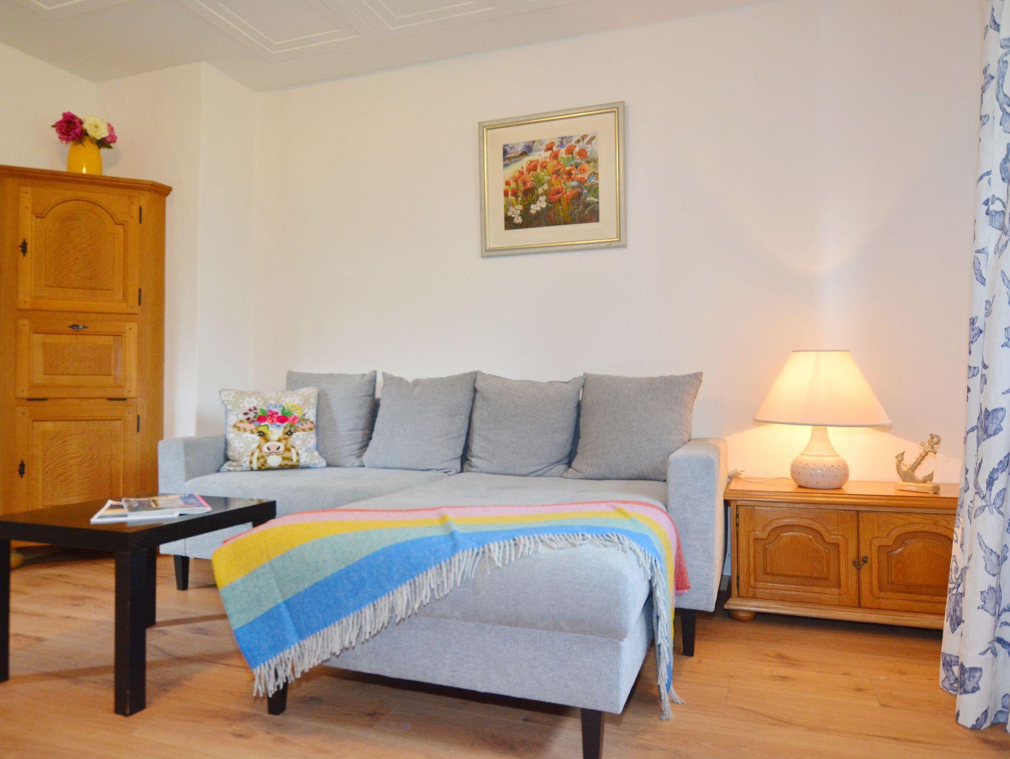 Der großzügige Wohnbereich ist in zwei Teilen eingeteilt, welche durch einen Rundbogen miteinander verbunden sind hier findet jeder seinen Rückzugsort. Ob Fernsehen und Lümmeln auf der Wohnlandschaft, oder sich im ländlichen Stil gehaltenen Leseraum zurückzuziehen der Flair wird Sie in den Bann ziehen. In der Küche erwartet Sie eine neue und komplett ausgestattete Einbauküche mit Ceranfeld, Backofen, Kühlschrank mit Gefrierfach, Kaffeemaschine, Wasserkocher, Toaster, ausreichend Geschirr sowie allen notwendigen Küchenutensilien. Die im ländlichen Stil gehaltene Sitzecke spiegelt den Einrichtungsstil des Anwesens wieder. ?Ein modernes Badezimmer mit ebener Dusche und WC ist ebenfalls auf der Etage vorhanden. Garderobe und Flur vervollständigen diese Ebene.