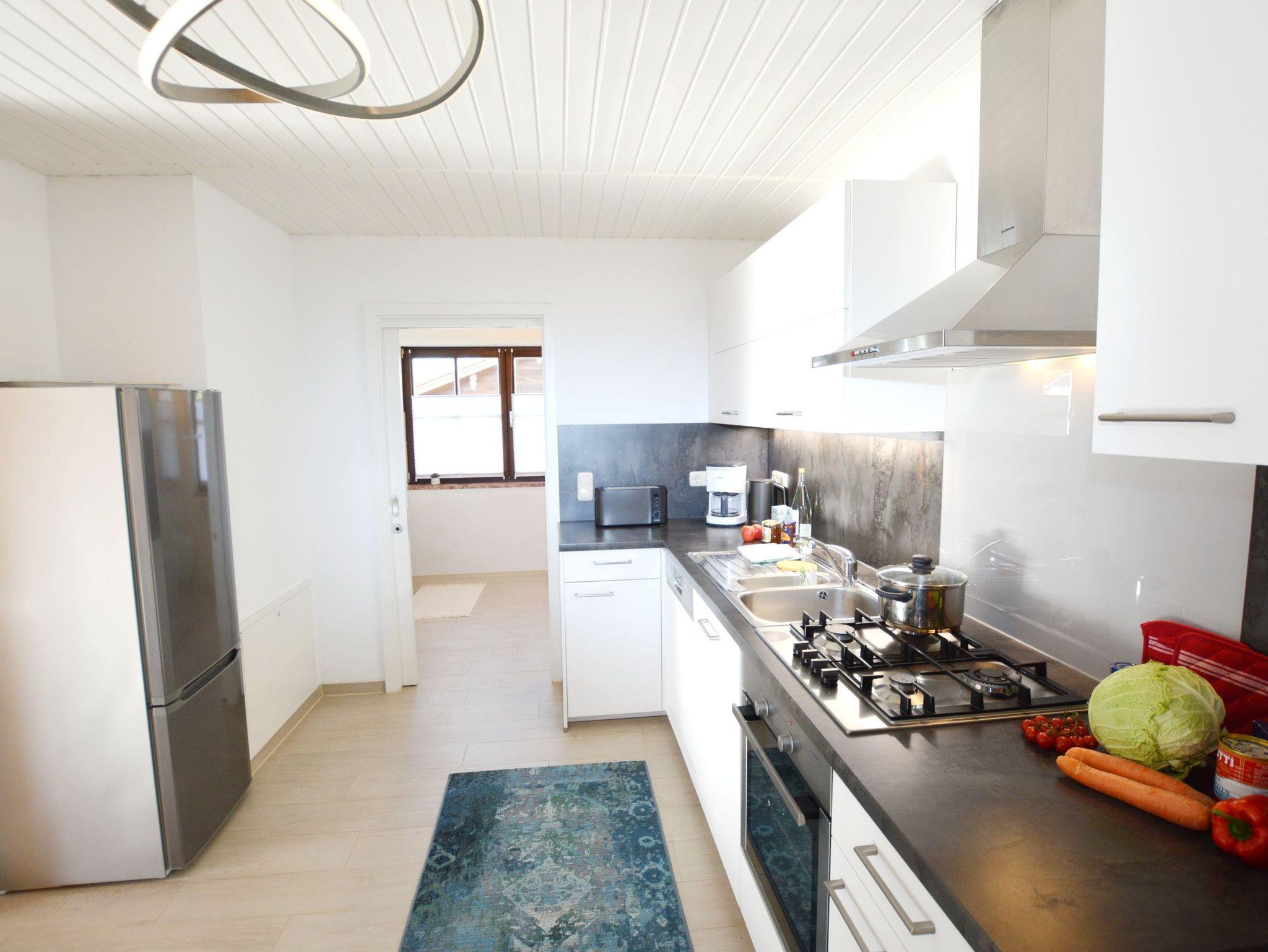Das Herzstück der Ferienwohnung ist der offene große Wohn- und Essbereich mit großer Fensterfront, einem Esstisch, Flachbildfernseher und zwei Sofas. Durch einen Bogen ist die offene Küche optisch vom Wohnbereich getrennt. Die Küche ist mit allen wichtigen Utensilien, die zum Kochen benötigt werden, ausgestattet. Vom Wohnbereich aus betreten Sie über die Schiebetüre den Süd-Balkon, um die schöne Urlaubszeit zu genießen und Blick auf die Berge zu erhaschen. Ein zweiter Balkon zur Südseite ist über ein Schlafzimmer zu betreten. Das Domizil umfasst zwei Schlafzimmer, welche jeweils über ein Doppelbett und genügend Stauraum verfügen. Zusätzlich bietet ein Schlafraum ein Schlafsofa an, weshalb bis zu 5 Personen eine schöne Auszeit vom Alltag im ?MountainView? verbringen können. Modern präsentiert sich das Badezimmer, ausgestattet mit Fenster, WC, Dusche, Bidet, Waschbecken, Waschmaschine, Spiegel und Haartrockner.