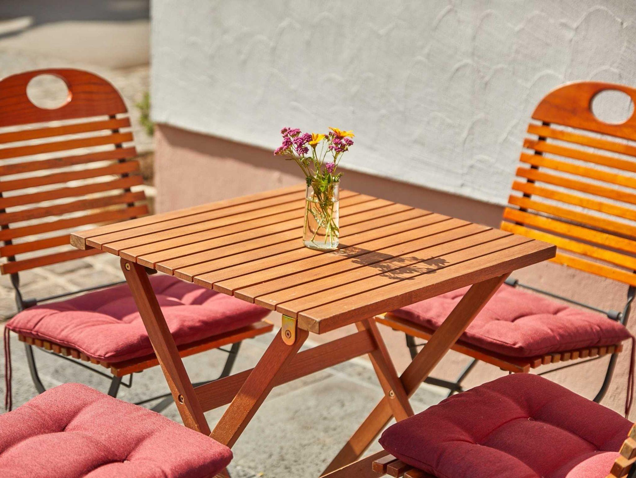 Zur Wohnung gehören Sitz- und Verweilmöglichkeiten auf der gepflasterten Terrasse vor dem Haus. Waschmaschine und ein Trockner stehen unseren Gästen zur kostenlosen Nutzung zur Verfügung.