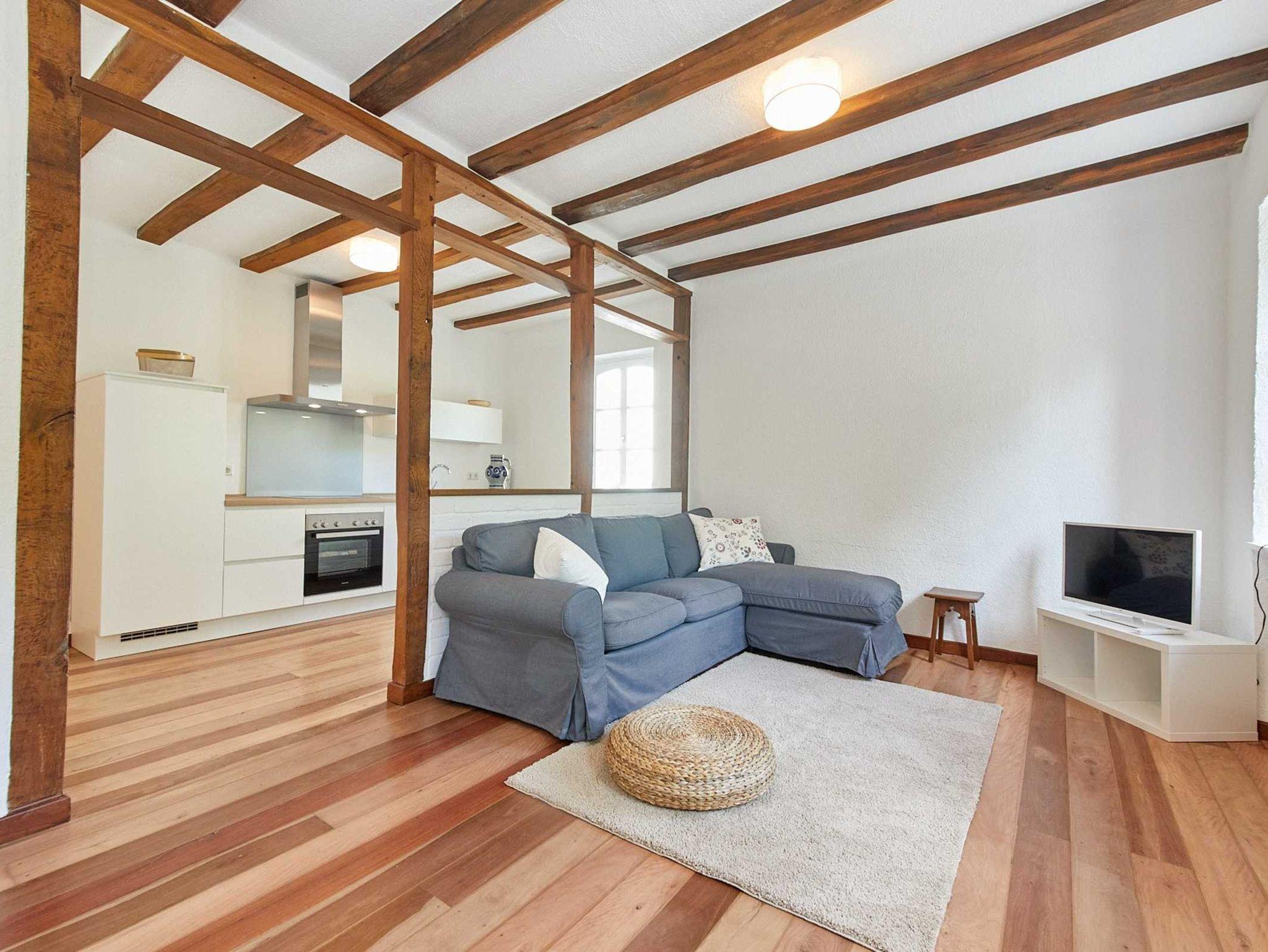 Die Ferienwohnung befindet sich auf der 1. Etage des denkmalgeschützten Weingutshauses direkt am Moselufer von Bernkastel-Kues im Ortsteil Wehlen. Die 75 qm große Wohnung für 4-6 Personen verfügt über einen großzügigen Wohn-Essbereich mit offener Küche, einem Esstisch für bis zu 6 Personen und gemütlicher Sofaecke. Zur Wohnung gehören ein modernes Duschbad sowie ein Doppelschlafzimmer und ein Schlafzimmer für vier Personen mit Doppelbett und zusätzlicher Schlafmöglichkeit für 2 Personen auf einem Schlafsofa.