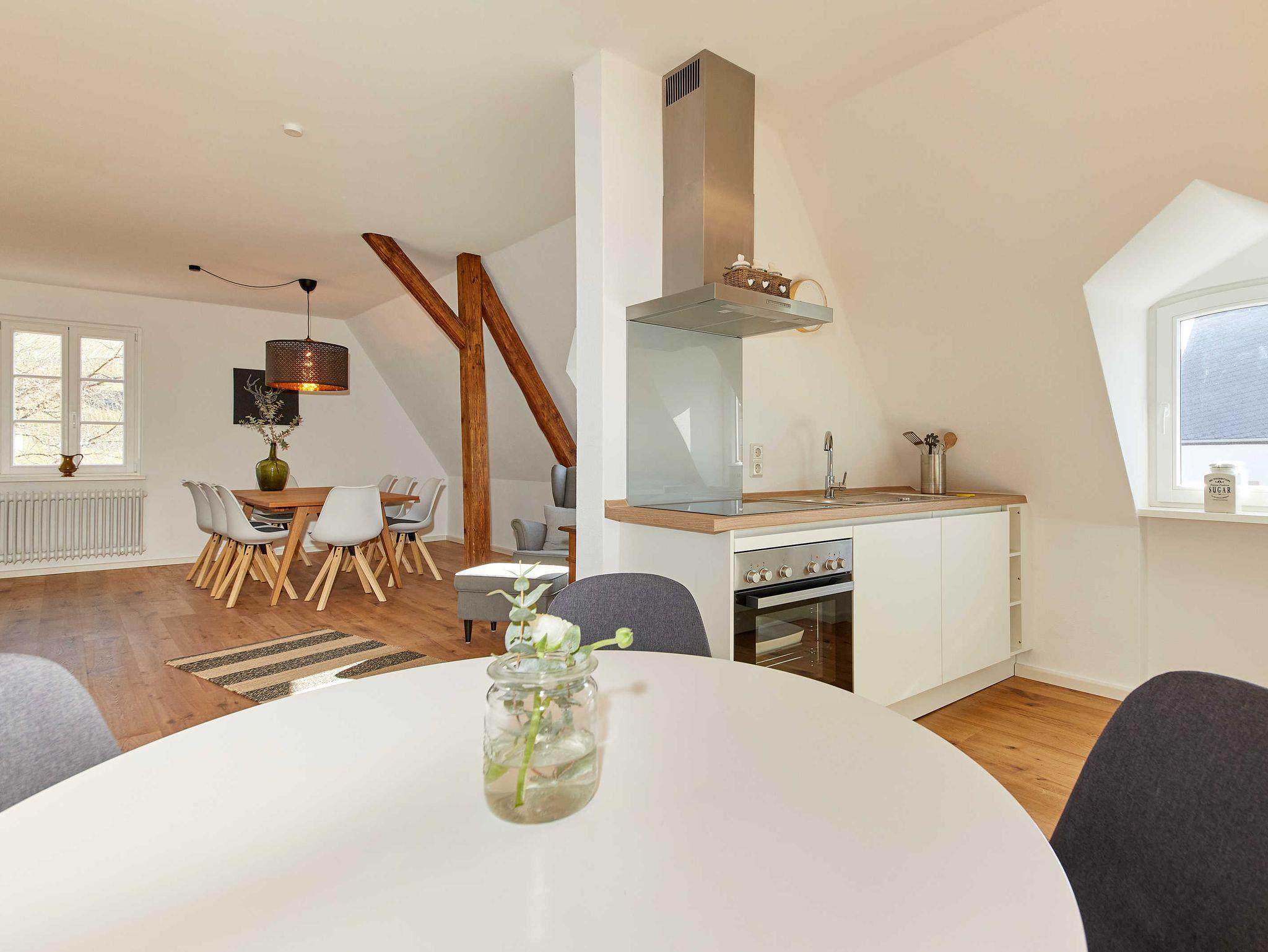Die Ferienwohnung befindet sich auf der zweiten Etage des denkmalgeschützten, ehemaligen Weinguts direkt am Moselufer von Bernkastel-Kues im Ortsteil Wehlen. Die luxuriöse 120 qm große Penthouse-Wohnung für 8 Personen verfügt über eine offene, voll ausgestattete moderne Landhausküche mit großzügigem Essbereich, separatem Wohnzimmer, Leseecke, zwei moderne Bäder (1 x mit Dusche, 1 x mit Badewanne) und 4 Doppelschlafzimmer. Zwei zusätzliche Schlafmöglichkeiten können im Wohnzimmer mit Zustellbetten geschaffen werden. Von der Wohnung genießt man einen einzigartigen Blick auf Mosel und die gegenüberliegenden Weinbergshänge.