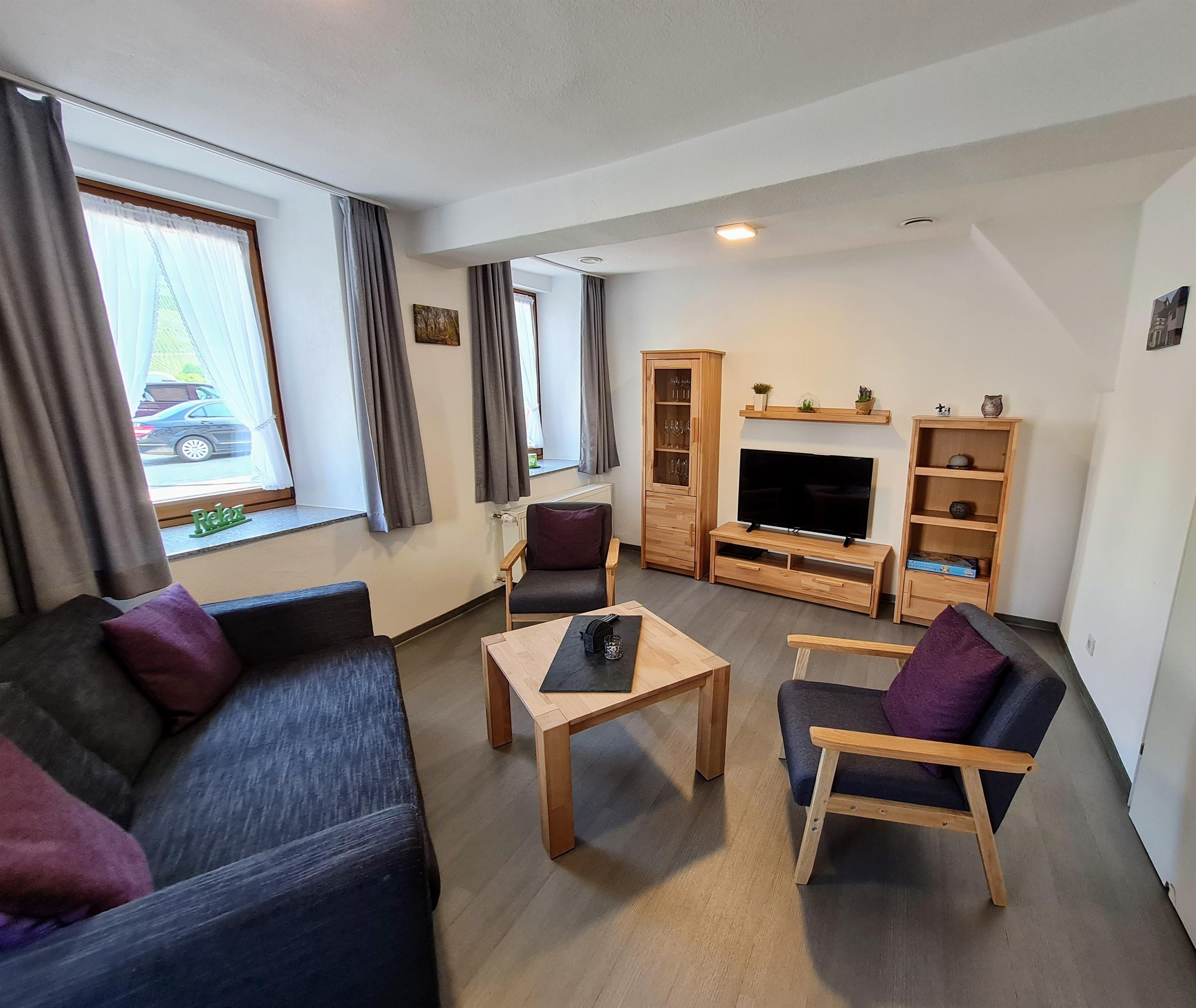 Im Eingangsbereich / Flur befindet sich ein Holzofen. Dort ist auch das Gäste-WC. Ebenfalls finden Sie hier das gemütlich eingerichtete Wohnzimmer mit TV, DVD-Player und Stereoanlage.