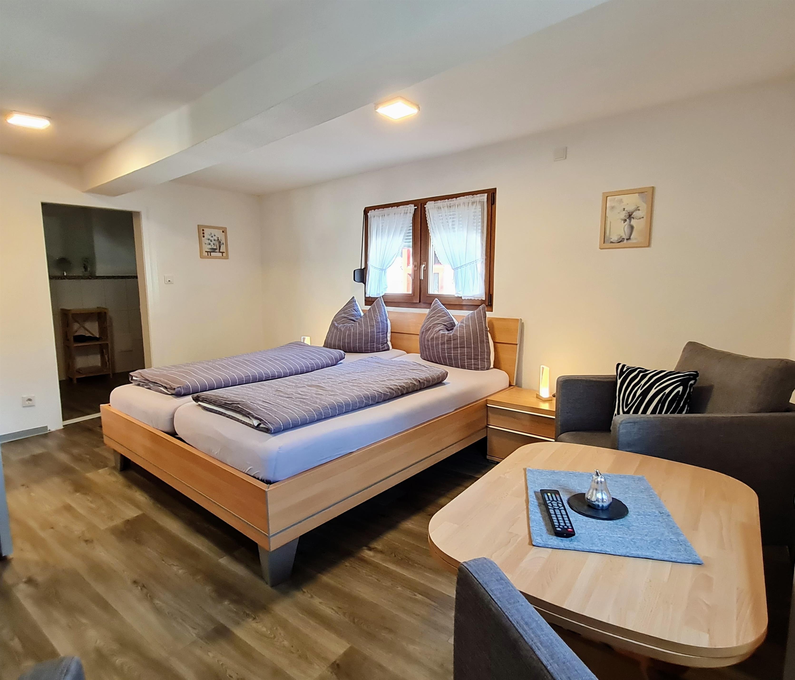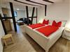 Im Obergeschoss befindet sich Schlafzimmer I mit Doppelbett und Wohnbereich und TV. Hieran gliedert sich das Bad mit Dusche und WC. Sowie Schlafzimmer II mit Tageslicht-Bad/WC.