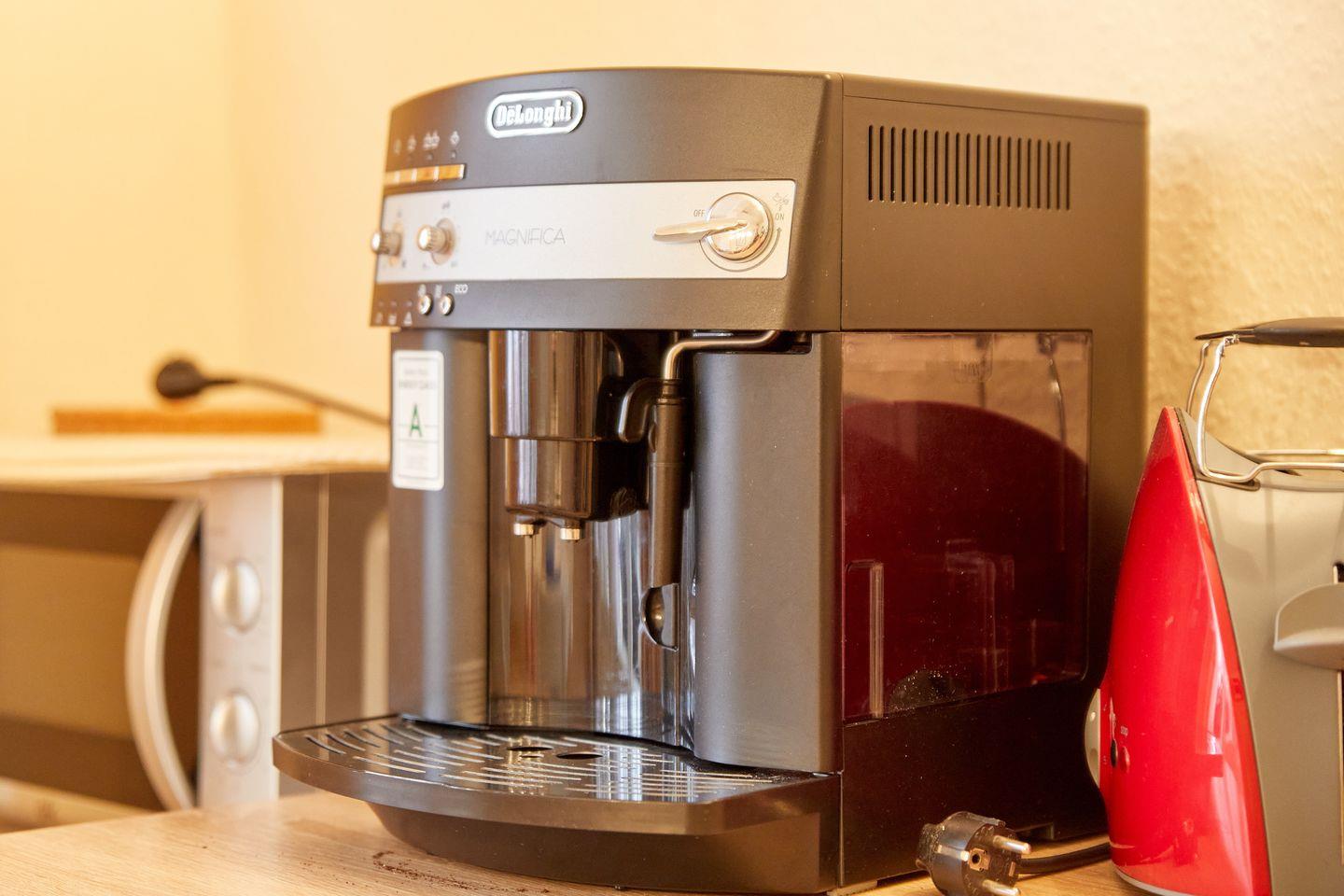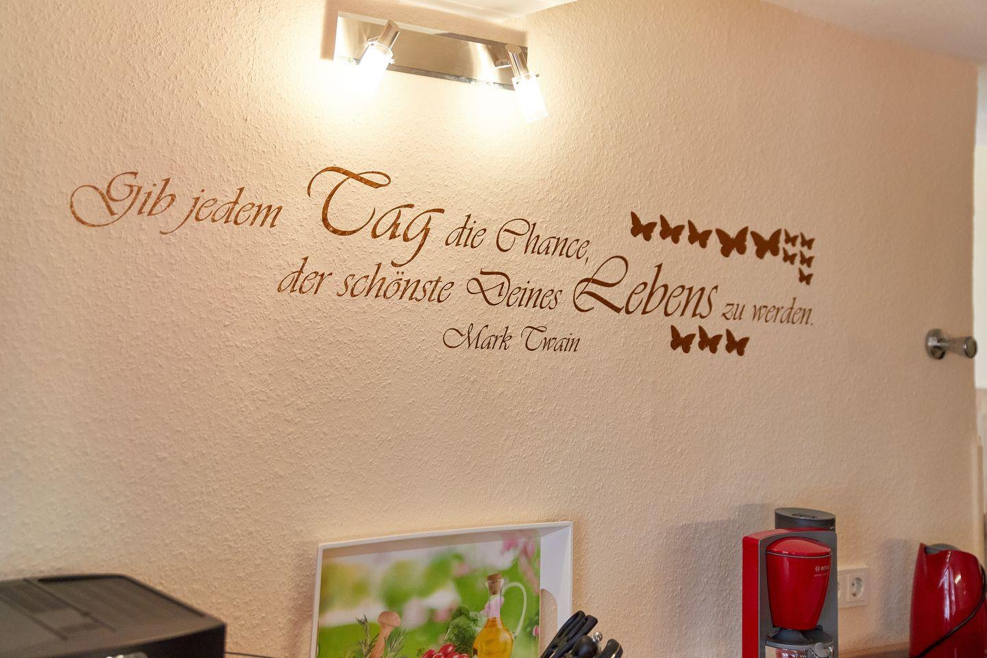 Die separate Küche ist vollständig eingerichtet und bietet Ihnen alle Annehmlichkeiten für die Selbstversorgung: Ein 4-Plattenherd, ein Backofen, eine Mikrowelle, eine Geschirrspülmaschine und ein Kühlschrank mit Gefrierfach stehen zur Verfügung. Küchenutensilien, Geschirr und Besteck sind ebenso vorhanden wie Kaffeemaschine, Wasserkocher, Toaster und verschiedene Gewürze. Ein Esstisch ermöglicht komfortables Speisen direkt in der Küche.