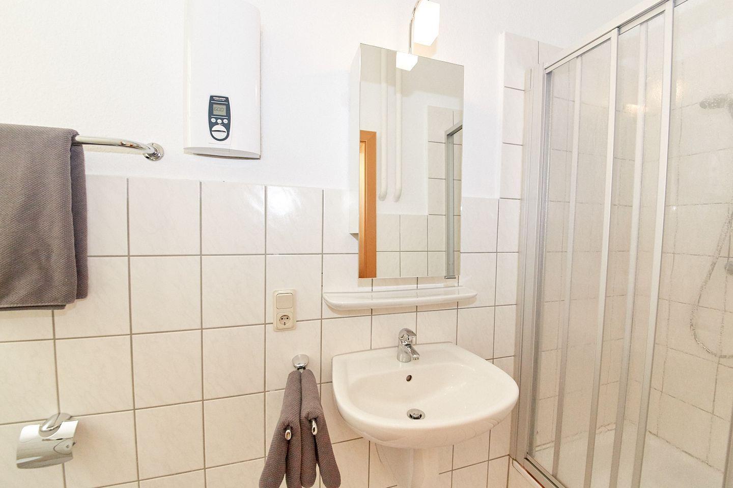 Das Badezimmer ist mit einer Dusche, WC, Waschbecken und Spiegel ausgestattet. bereitgestellte Handtücher, Badetücher, Haartrockner sowie Erstausstattung.