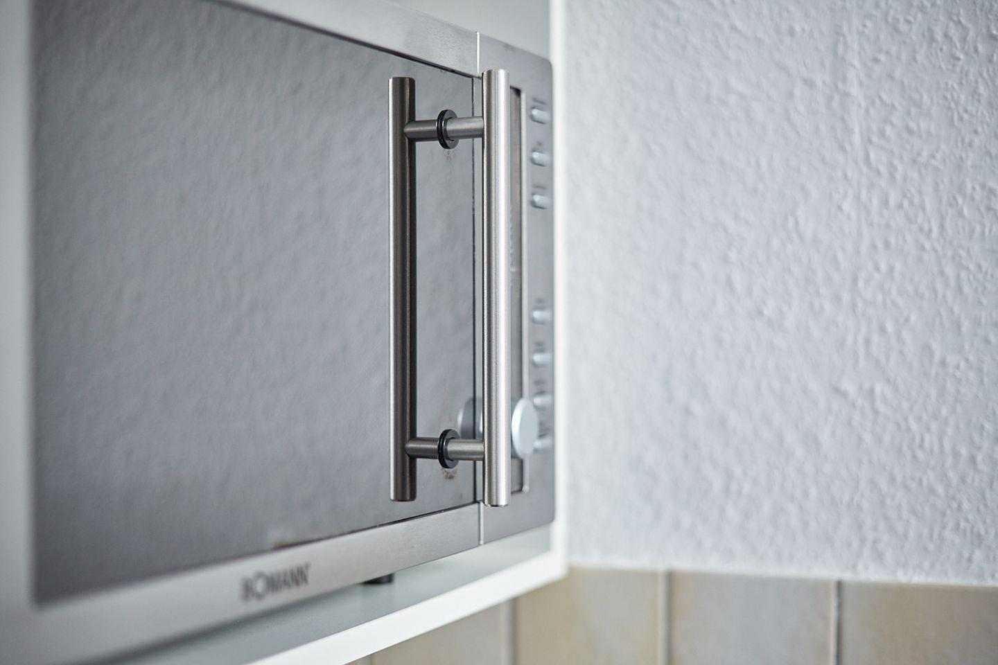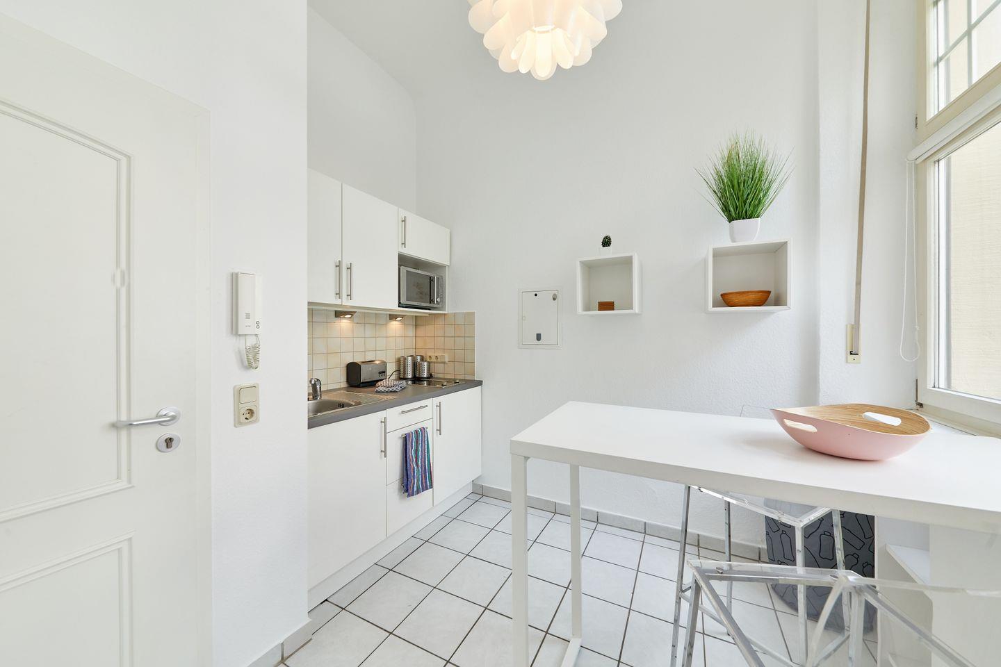 Die Küche ist offen angrenzend, der Herd mit zwei Platten, eine Mikrowelle, eine Kaffeemaschine, ein Wasserkocher, ein Toaster sowie Küchenutensilien und Geschirr stehen zur Verfügung, sowie ein Kühlschrank mit integriertem Gefrierfach , Ein höher Bar- Esstisch bietet Platz für gemeinsame Mahlzeiten.