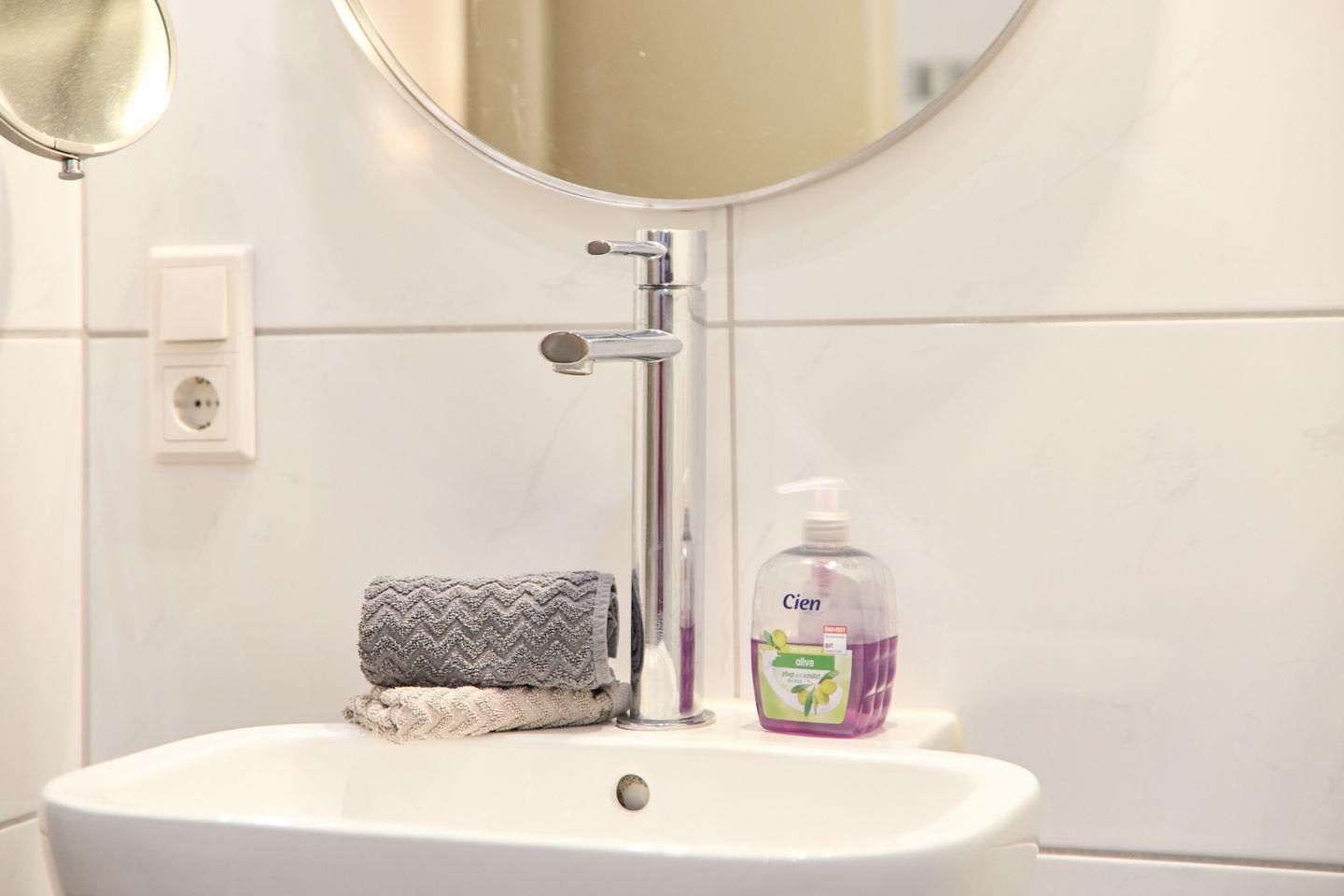 Das geräumige Badezimmer verfügt über eine Dusche, Waschbecken mit Spiegel, WC und bietet warmes Wasser sowie einen Haartrockner. Handtücher, Badetücher und Bettwäsche sind inbegriffen und sorgen für zusätzlichen Komfort. Für einen gepflegten Aufenthalt steht Ihnen außerdem ein Staubsauger zur Verfügung.
