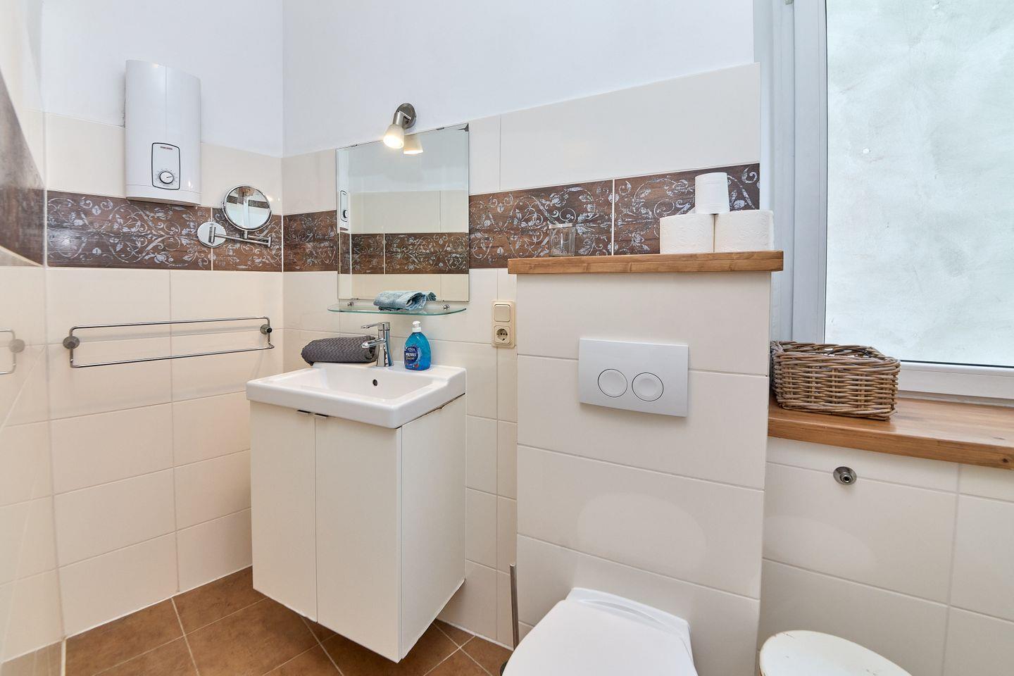 Das Badezimmer verfügt über eine Dusche, ein WC, ein Waschbecken, einen Spiegel und ein Fenster für Tageslicht und Belüftung. Handtücher, Badetücher und ein Haartrockner stehen Ihnen selbstverständlich zur Verfügung.