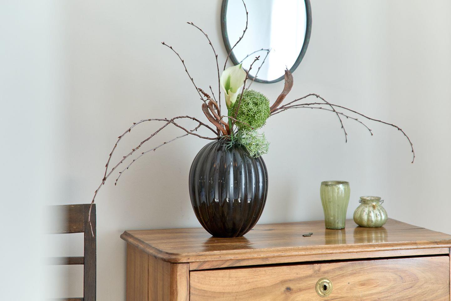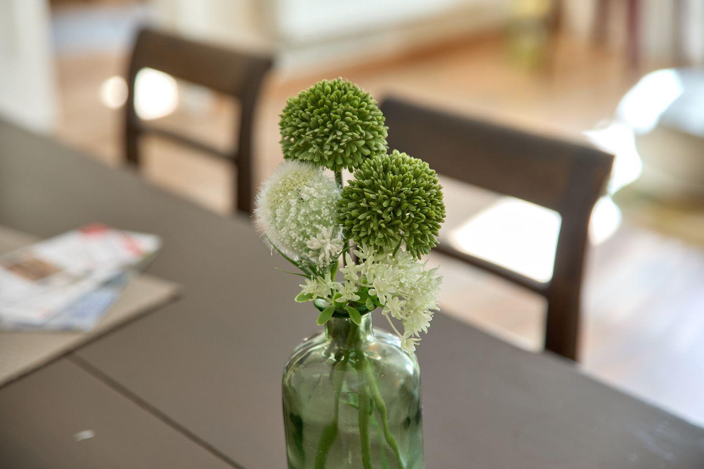 Der Essbereich ist geschmackvoll in die abgeschlossene Küche mit Esstisch integriert. Die Küche ist hochwertig ausgestattet: Sie finden hier einen Ceranherd, einen Backofen mit Elektroanschluss, einen Kühlschrank mit integriertem Gefrierfach, eine Spülmaschine sowie zahlreiche Küchenutensilien, Geschirr und Besteck. Damit ist die Zubereitung von Mahlzeiten ebenso angenehm wie das gemeinsame Speisen im dafür vorgesehenen Bereich. Reinigungsmittel, Geschirrtücher sowie eine Erstausstattung an Gewürzen sind ebenfalls vorhanden.