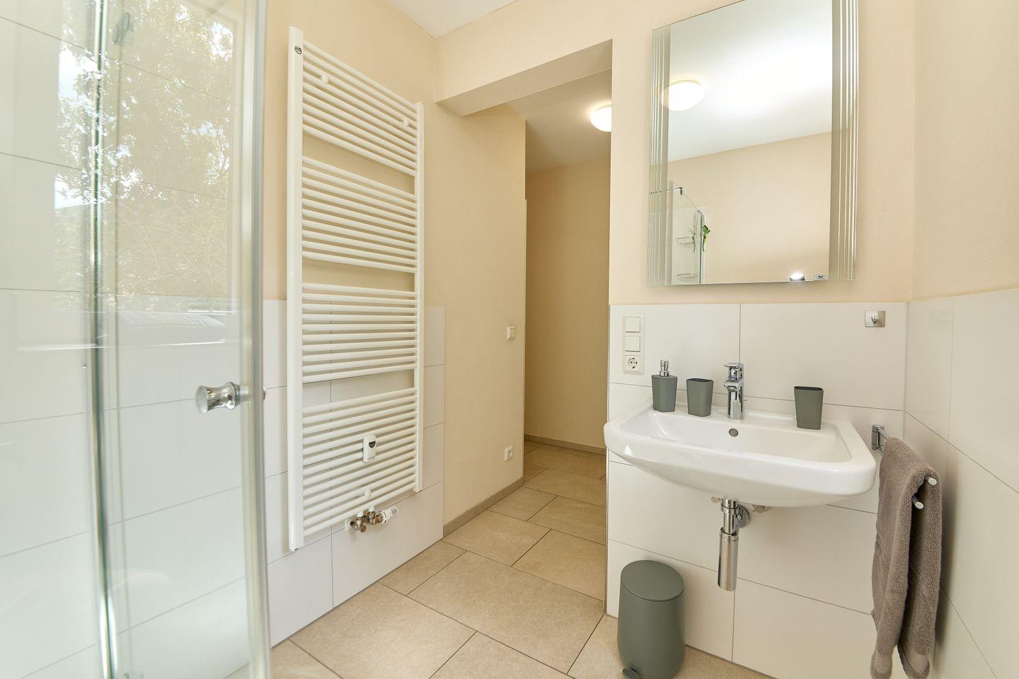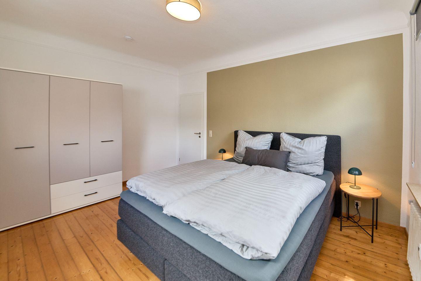 Die Ferienwohnung verfügt über ein separates Schlafzimmer, das optimalen Rückzugsort und Ruhe bietet. Ein Ganzkörperspiegel, Kommode und Schuhschrank schaffen zusätzlichen Stauraum und Komfort. Das Badezimmer ist mit einer bodengleichen Dusche, Waschbecken, WC, Haartrockner, Spiegel und Fenster ausgestattet und erfüllt alle Ansprüche an Funktionalität und Sauberkeit. Zusätzlich sind Handtücher, Badetücher sowie Bettwäsche und Reinigungsmittel vorhanden.