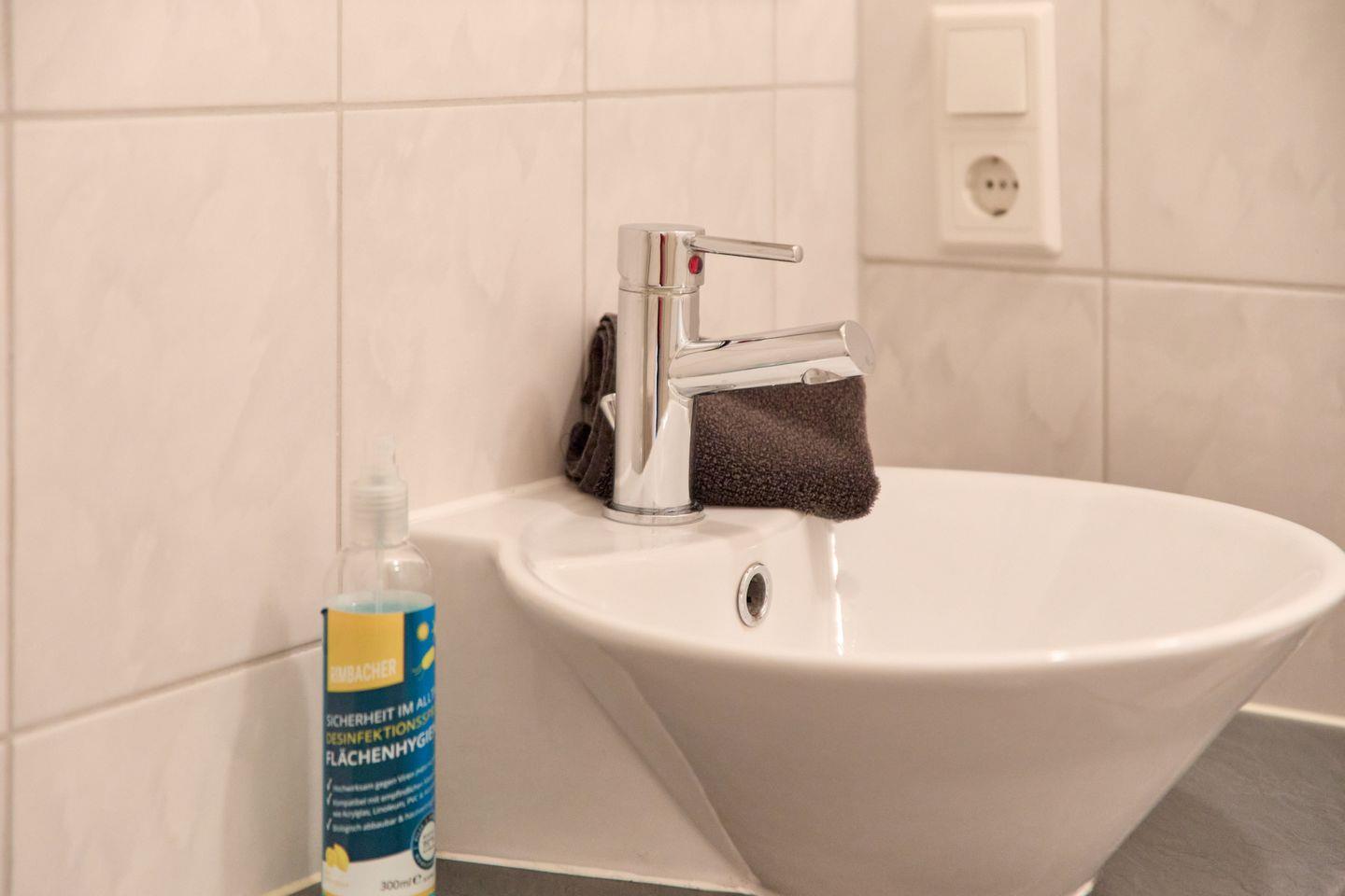 Das Badezimmer bietet mit einem Waschbecken und separaten WC, den notwendigen Komfort. Ein besonderes Highlight ist die Dusche, welche sich in einem offenen Raum hinter der Küche befindet Für Ihren Aufenthalt stehen Ihnen Hand-, Badetücher sowie Bettwäsche bereit.