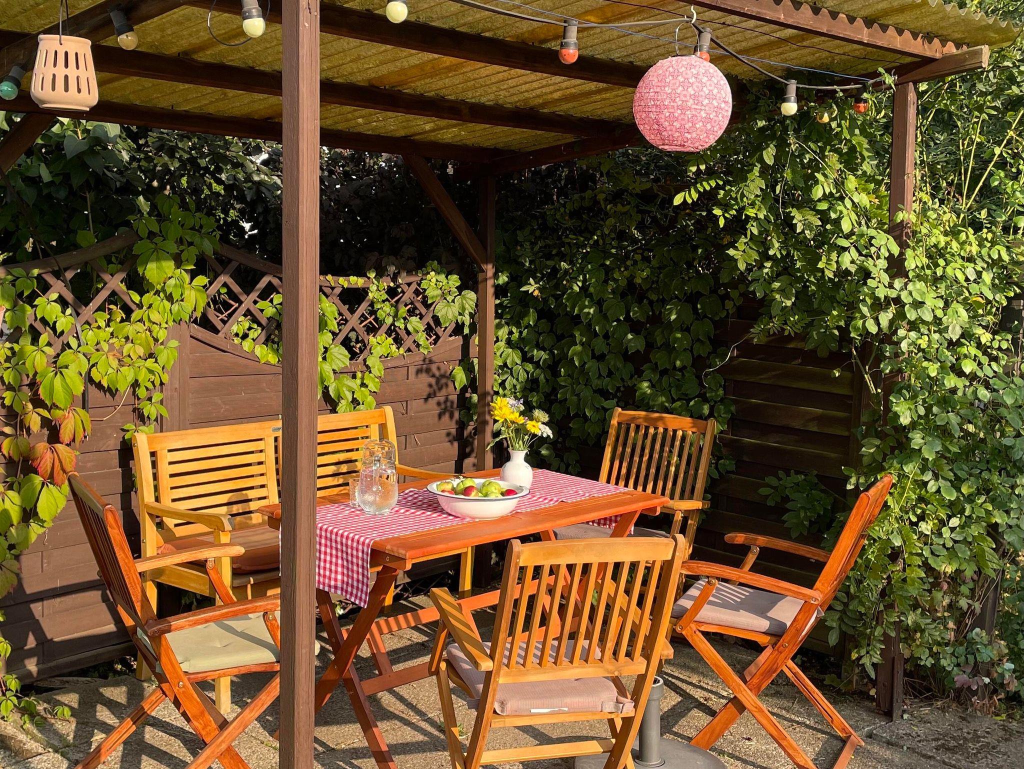 Im Garten bietet eine lauschige überdachte Terrasse Raum für Mahlzeiten oder Lesestunden. Gerne können unsere Fahrräder benutzt werden, bis zu 3 Autos finden Platz.