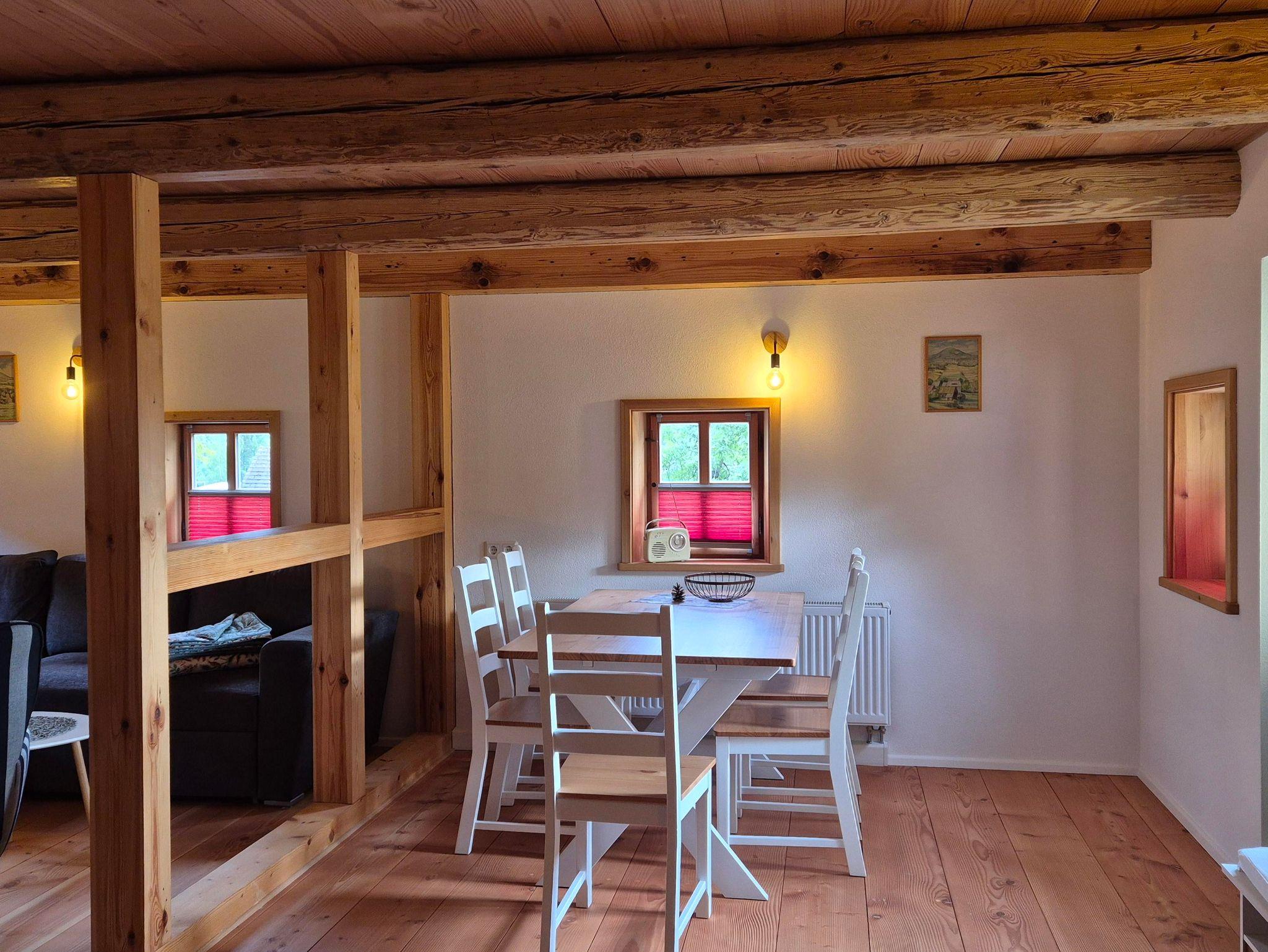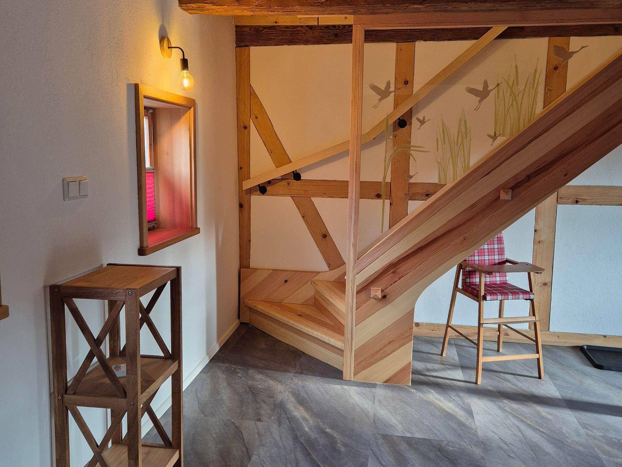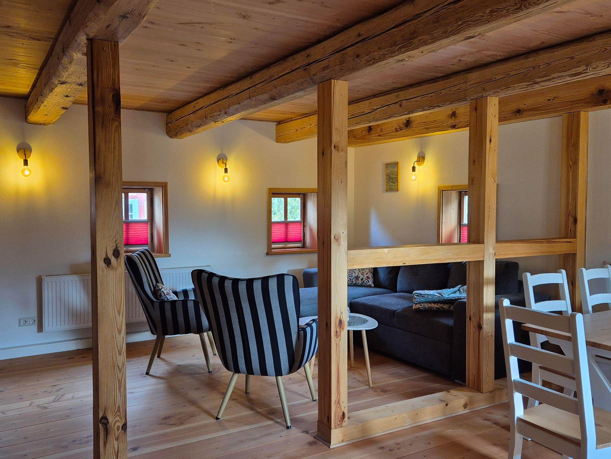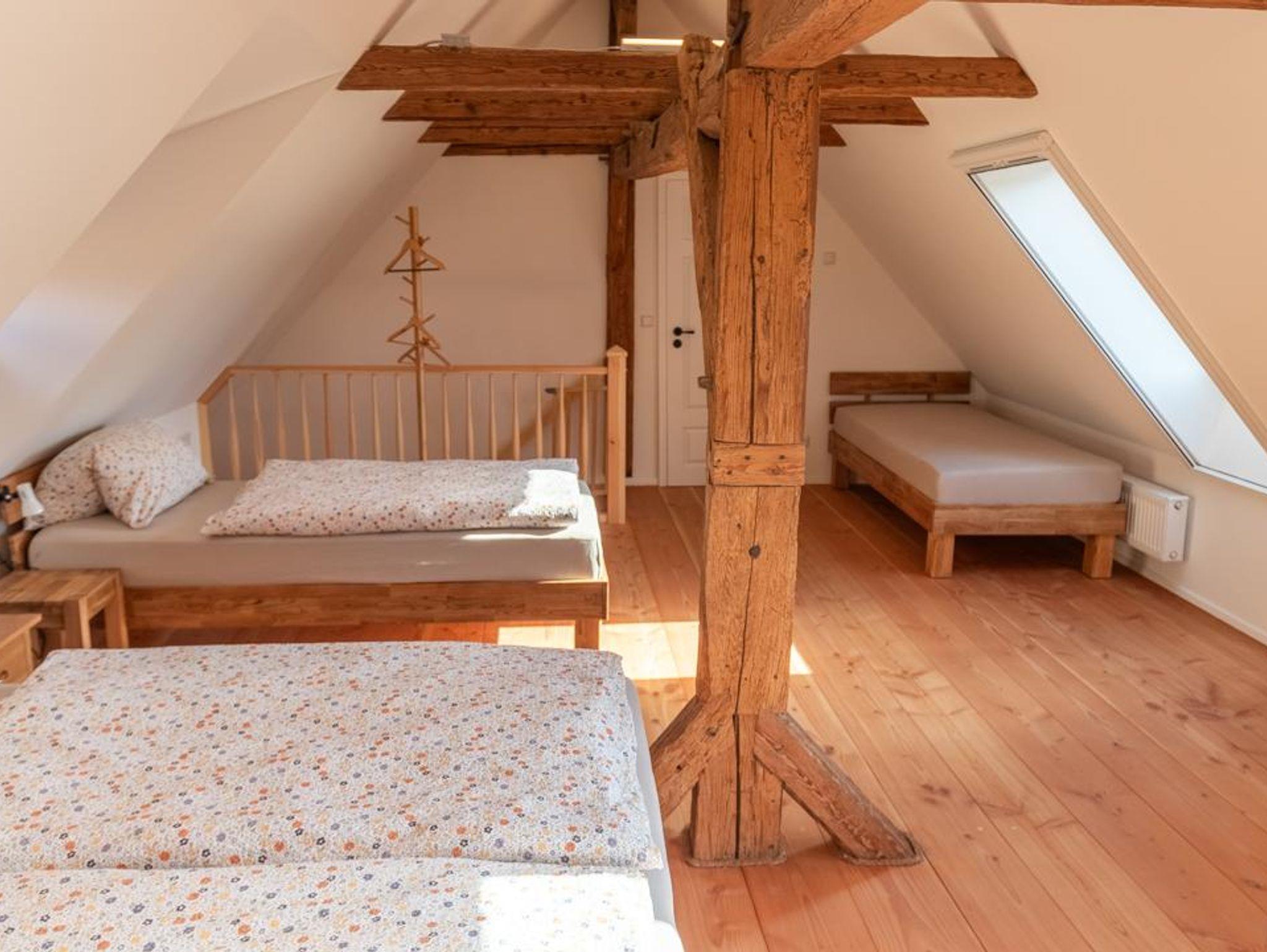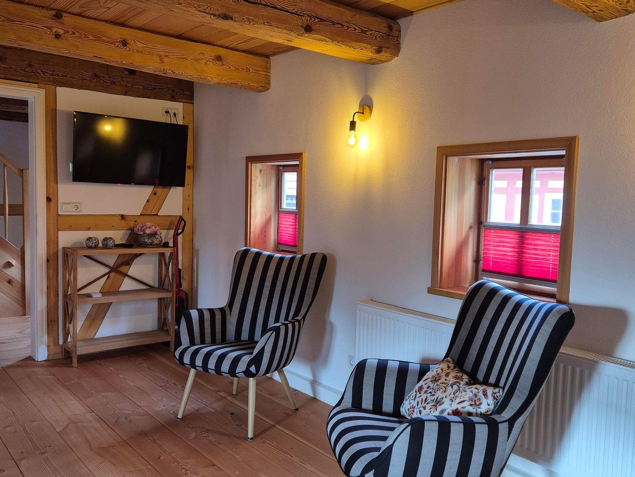 Fachwerk trifft modernen Komfort Mit 90?m² Wohnfläche im Obergeschoss verbindet die Ferienwohnung „Hochwald“ traditionelle Fachwerkarchitektur mit zeitgemäßer Ausstattung. Im geräumigen Schlafzimmer finden Sie ein Doppelbett und zwei Einzelbetten vor – optimal für Familien oder kleine Gruppen. Zusätzlich bietet der Wohnbereich eine komfortable Schlafcouch.