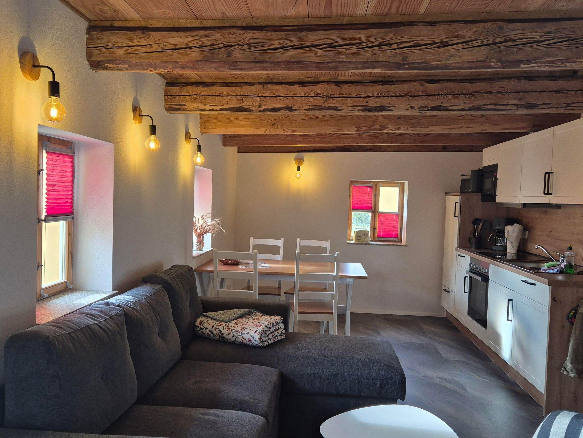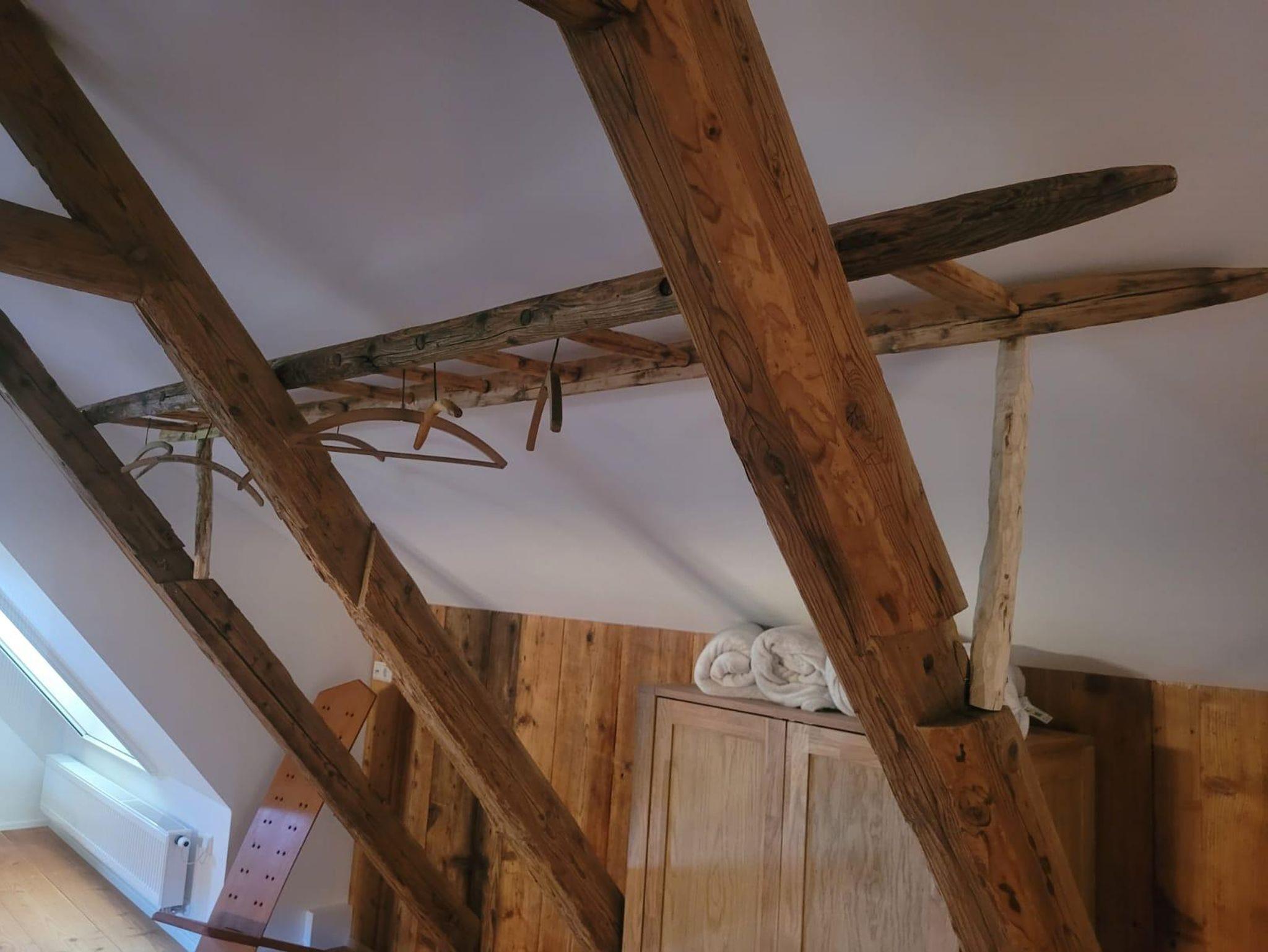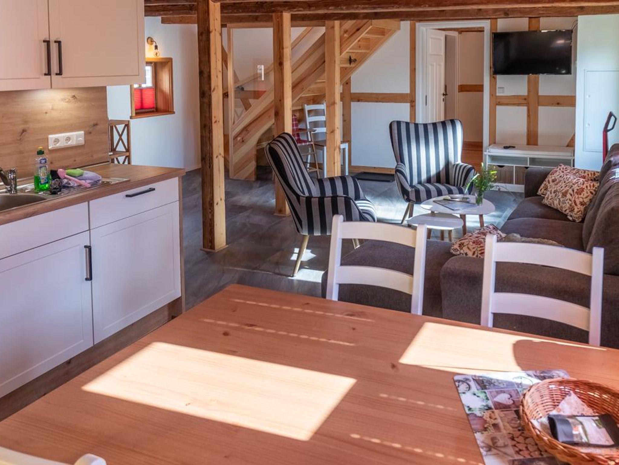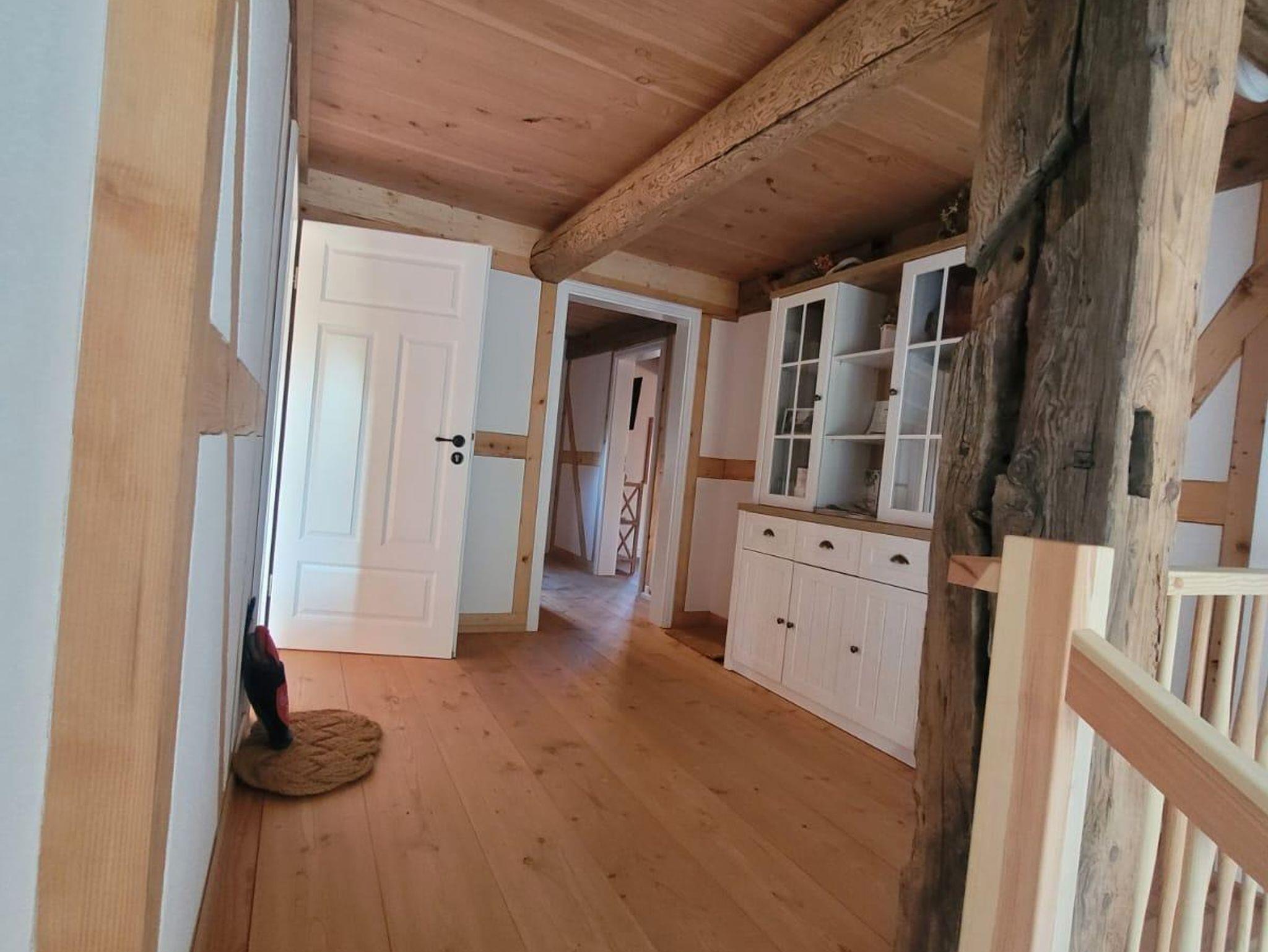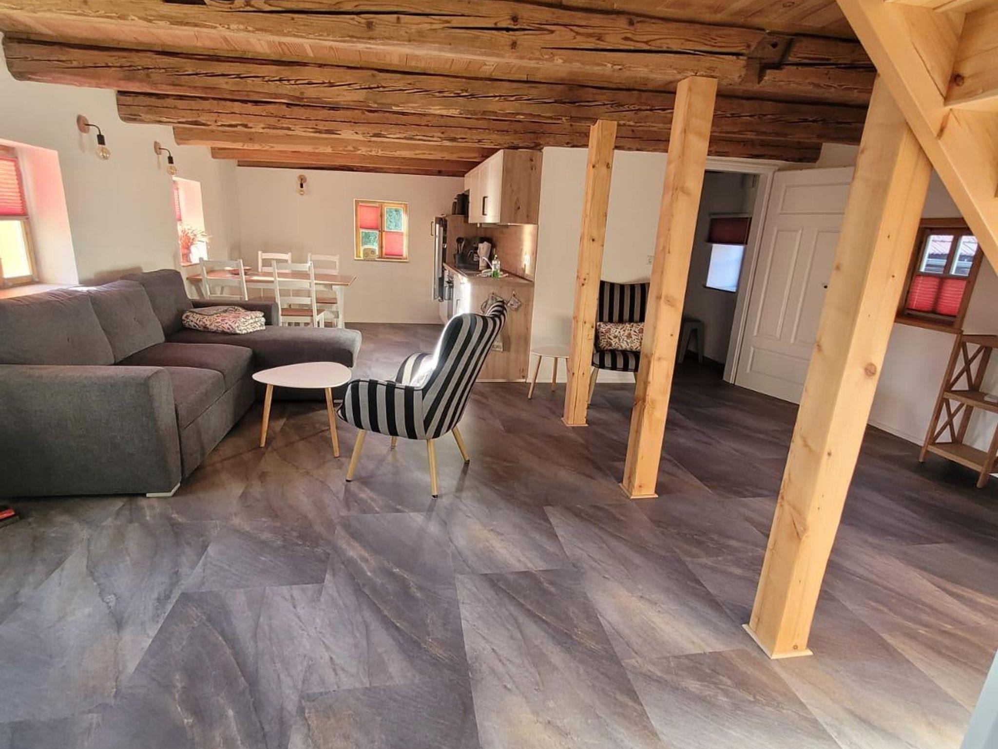 Fachwerk trifft modernen Komfort Mit 90?m² Wohnfläche im Obergeschoss verbindet die Ferienwohnung „Hochwald“ traditionelle Fachwerkarchitektur mit zeitgemäßer Ausstattung. Im geräumigen Schlafzimmer finden Sie ein Doppelbett und zwei Einzelbetten vor – optimal für Familien oder kleine Gruppen. Zusätzlich bietet der Wohnbereich eine komfortable Schlafcouch.