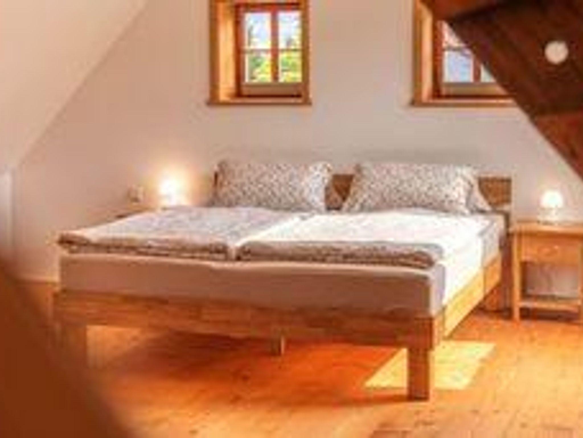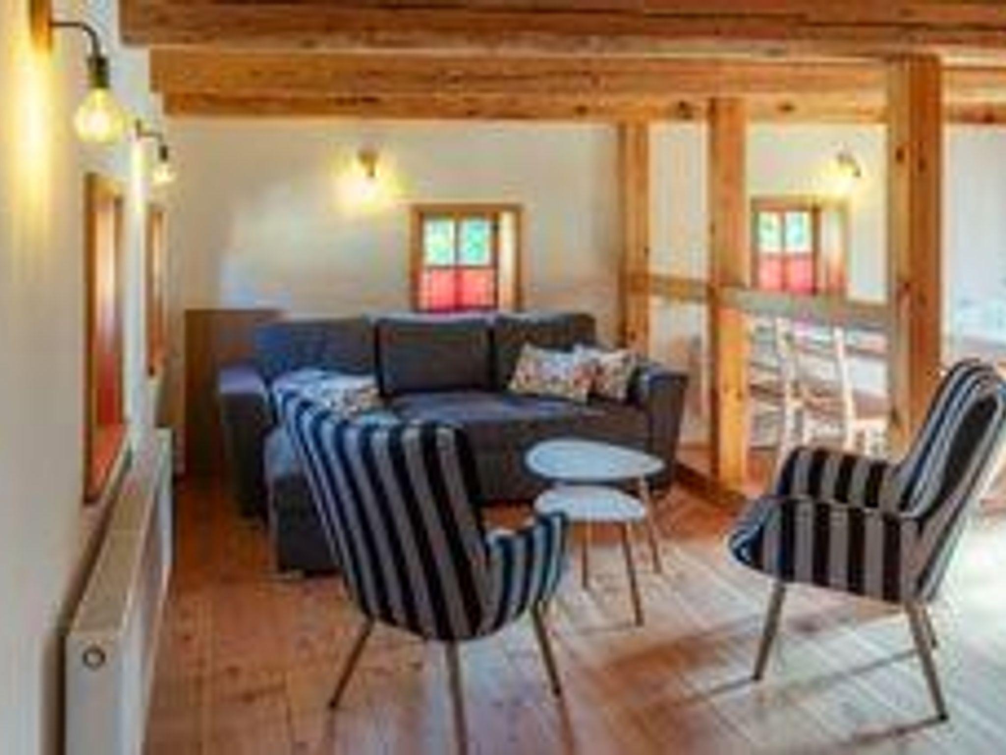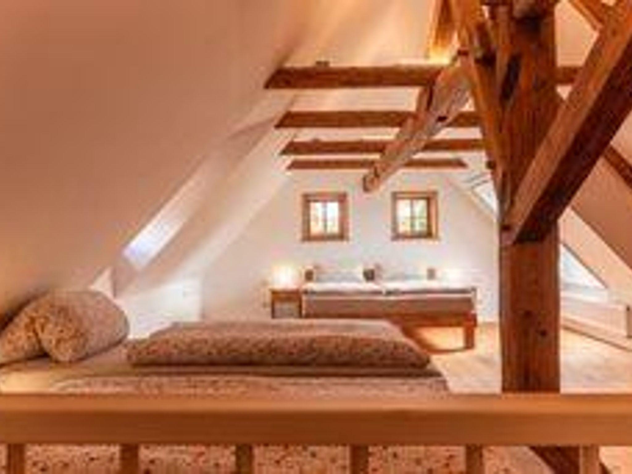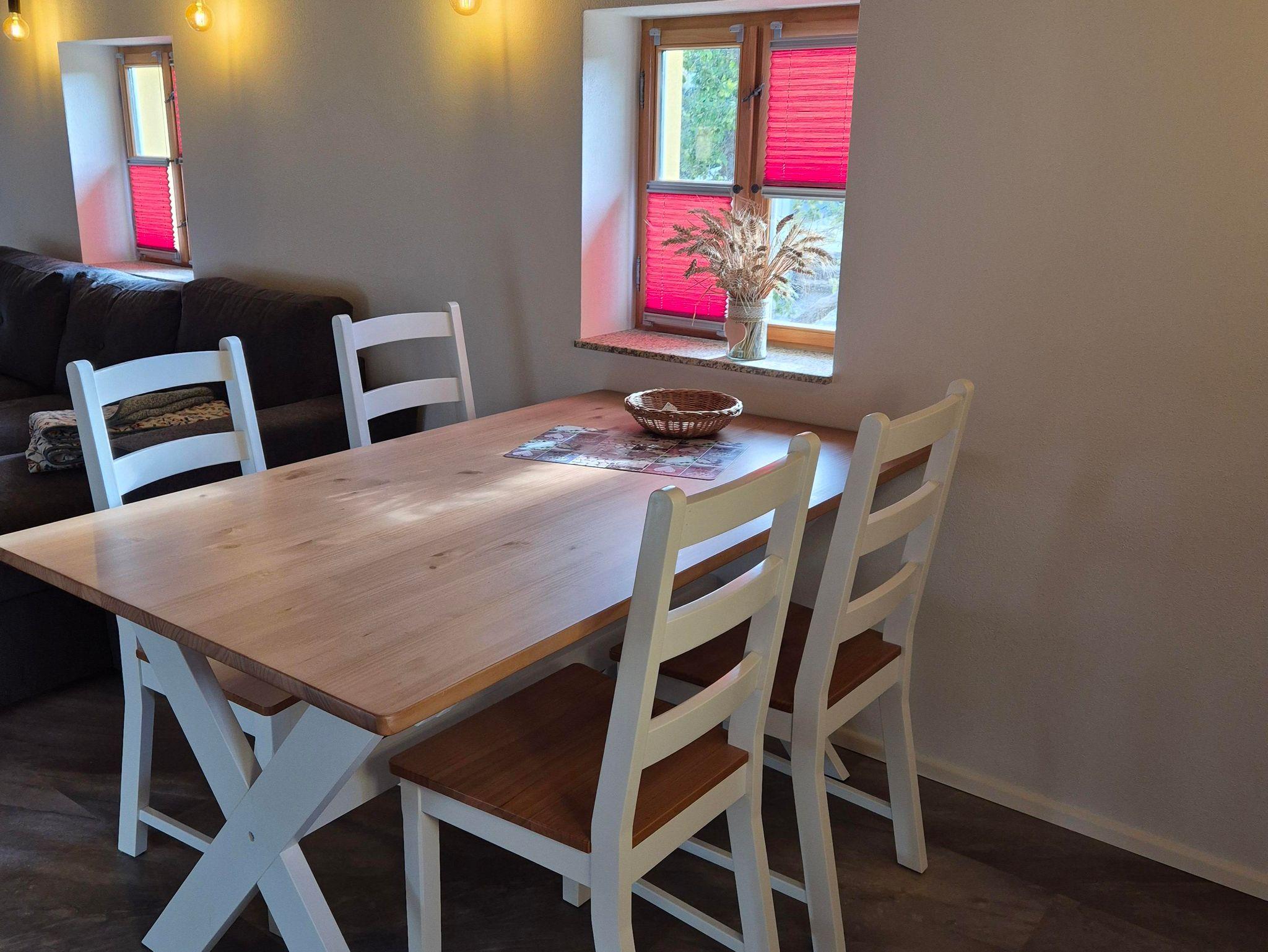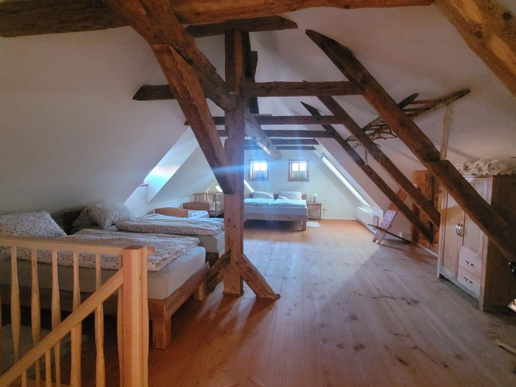 Fachwerk trifft modernen Komfort Mit 90?m² Wohnfläche im Obergeschoss verbindet die Ferienwohnung „Hochwald“ traditionelle Fachwerkarchitektur mit zeitgemäßer Ausstattung. Im geräumigen Schlafzimmer finden Sie ein Doppelbett und zwei Einzelbetten vor – optimal für Familien oder kleine Gruppen. Zusätzlich bietet der Wohnbereich eine komfortable Schlafcouch.