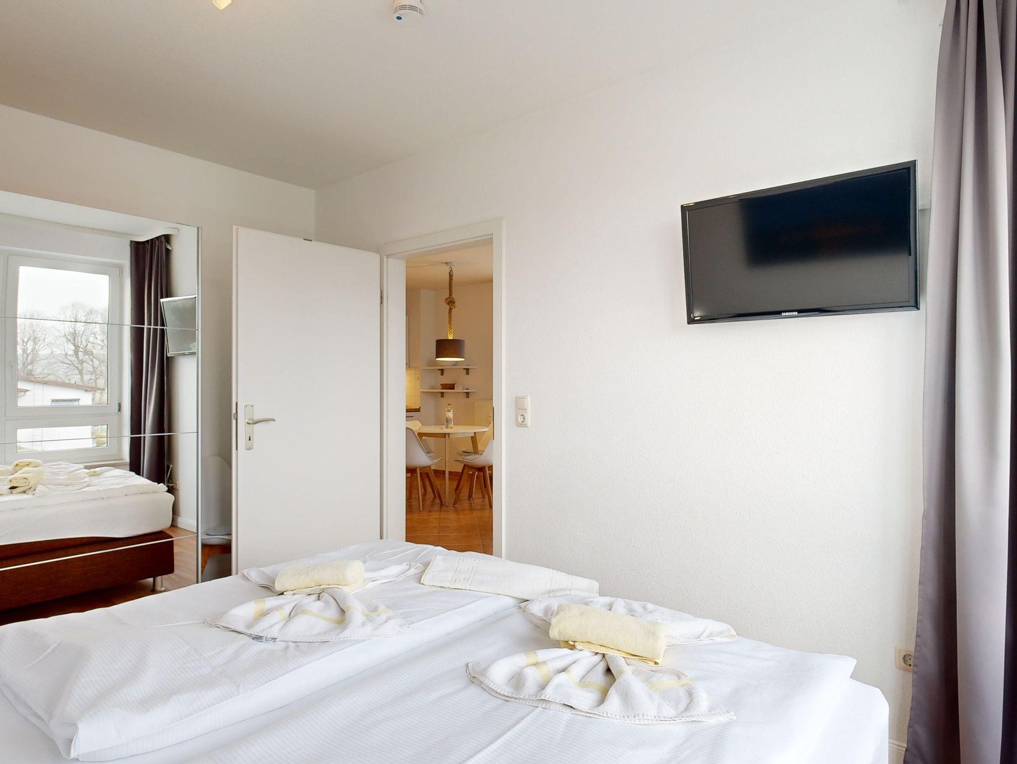 1 Schlafzimmer mit einem Boxspringbett (Doppelbett) und TV, ausklappbarer Schreibtisch hinter der Tür