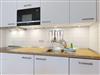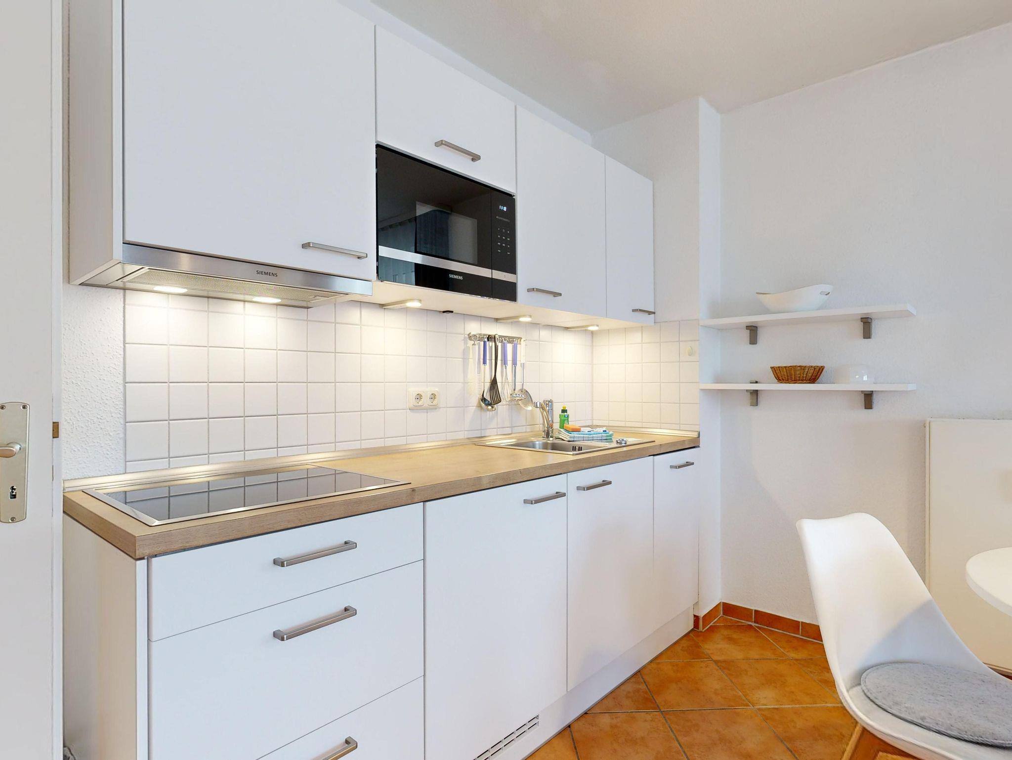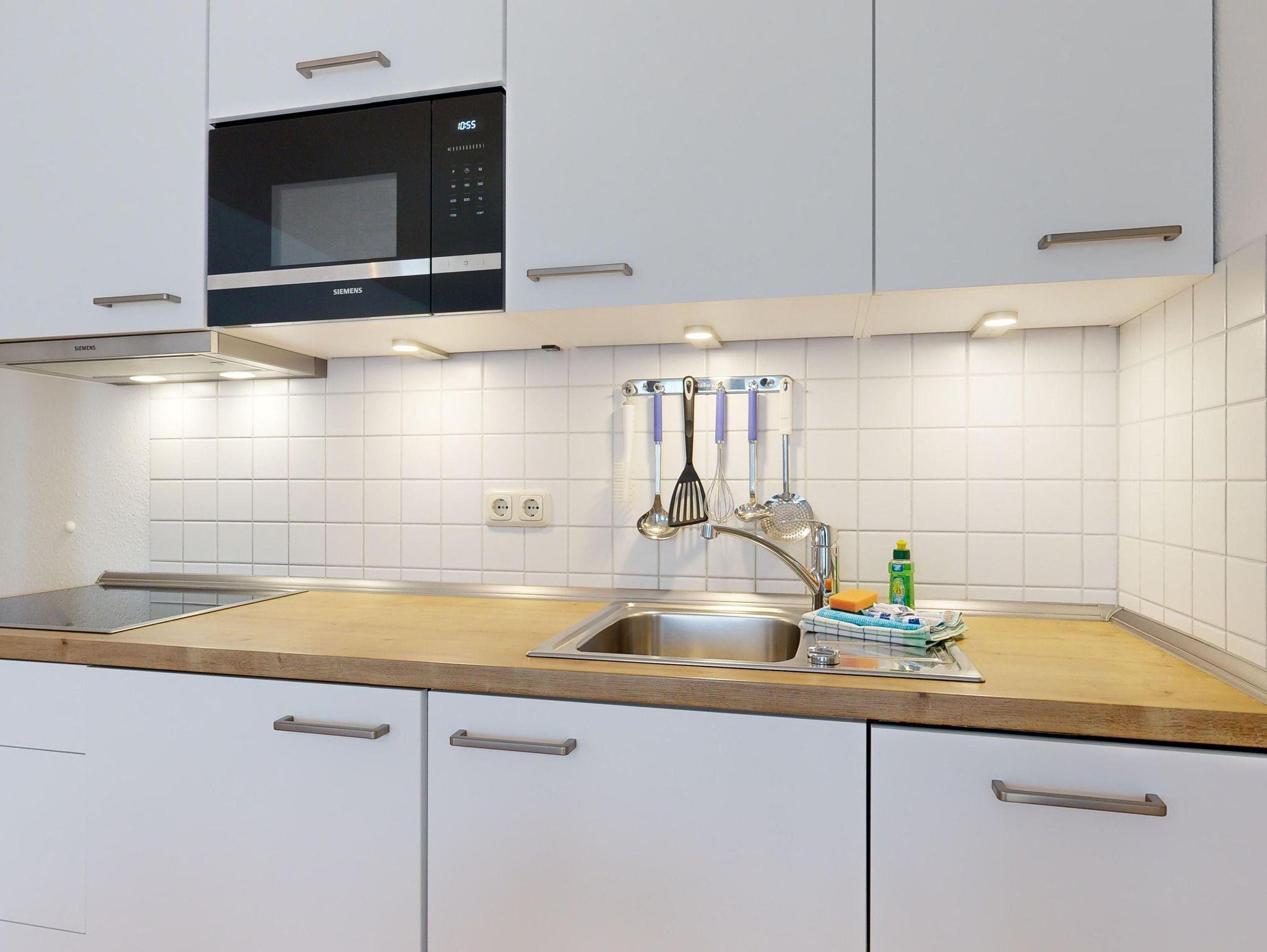 Küchenzeile mit Spülmaschine, Ceranfeld, Mikrowelle mit Grillfunktion, Kaffeemaschine, Toaster und Kühlschrank mit Gefrierfach