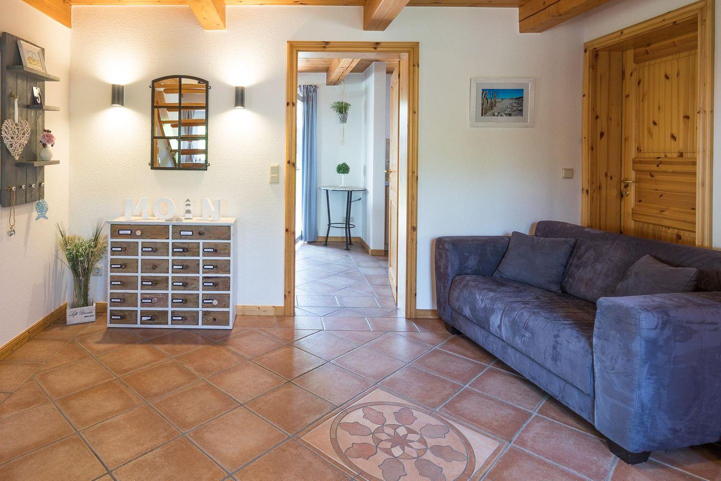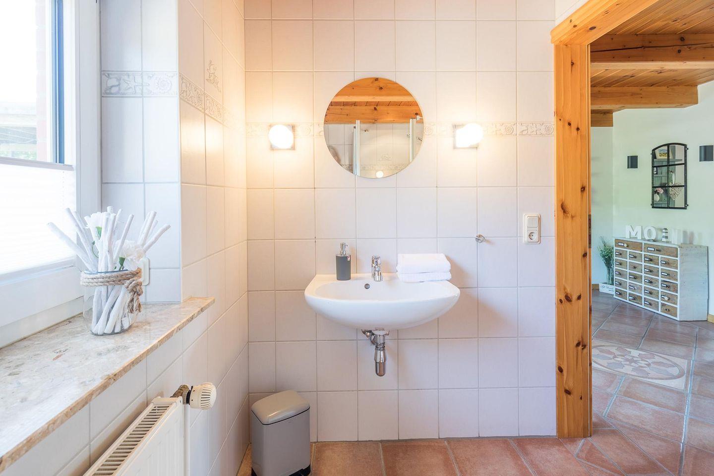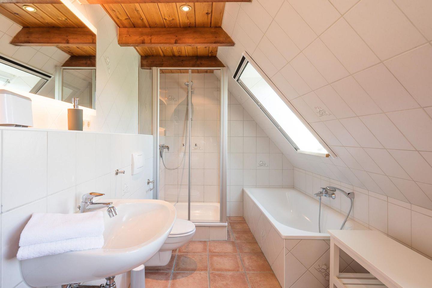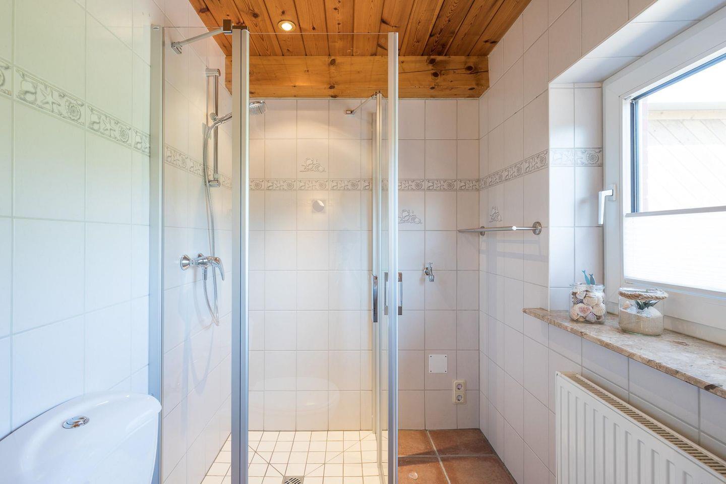 Das Ferienhaus verfügt über drei Schlafzimmer (1 Boxspringbett 180 x 200, zwei Doppelbetten 140 x 200), im Erdgeschoss finden Sie ein Duschbad und im Obergeschoss ein kombiniertes Dusch/Wannenbad, beide mit WC.