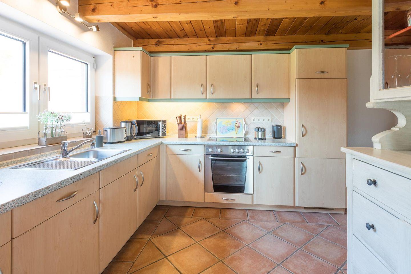 Die offene Küche ist sehr gut ausgestattet: Geschirrspüler, Kühlschrank, Gefrierfach, Backofen, Ceranfeld mit 4 Kochplatten, Filterkaffee-Maschine (Filtergröße 4), Wasserkocher und ein Toaster.