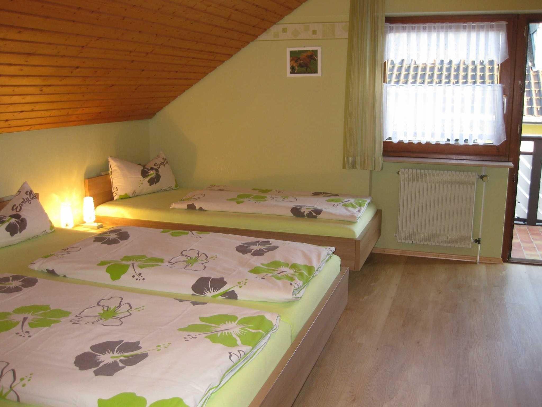 3 Raum Ferienwohnung (77qm), ein Doppelzimmer, ein Dreibettzimmer, eine komplett eingerichtete Wohnküche, Bad/Dusche, zusätzliches WC, Waschmaschine, Farb-Sat-TV, Balkon, Kinderbett, Liegewiese, Grill, Parkplatz am Haus. Grosses Spielzimmer mit Tischtennis, Tischfussball, elektronische Dartscheibe, Kindertrampolin. Sauna, Rotlichtkabine