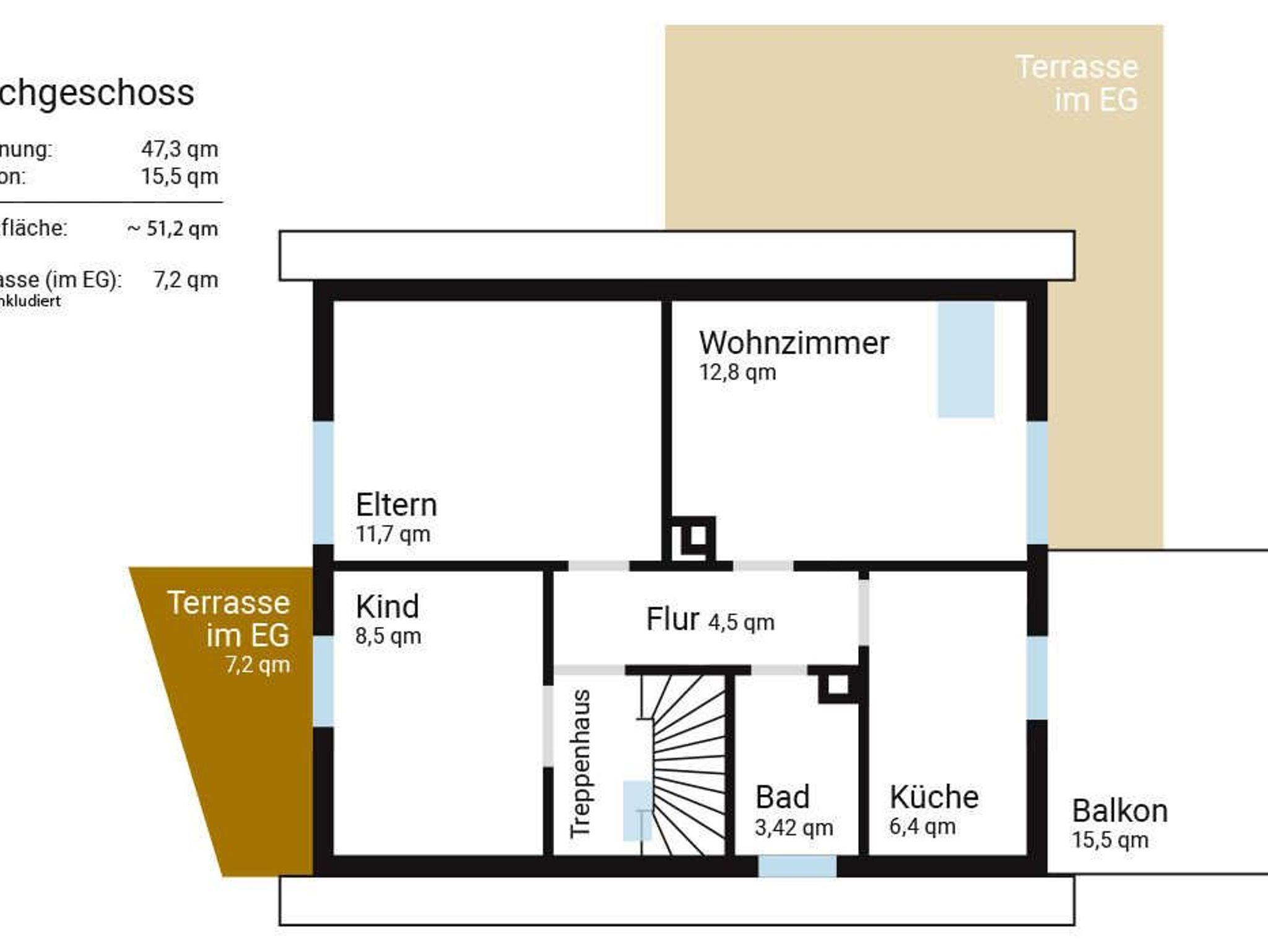 Die Ferienwohnung Odenwald liegt im Obergeschoss und verfügt über ca. 55 qm und 24 qm Balkon sowie einer kleinen Terrasse im Erdgeschoss.