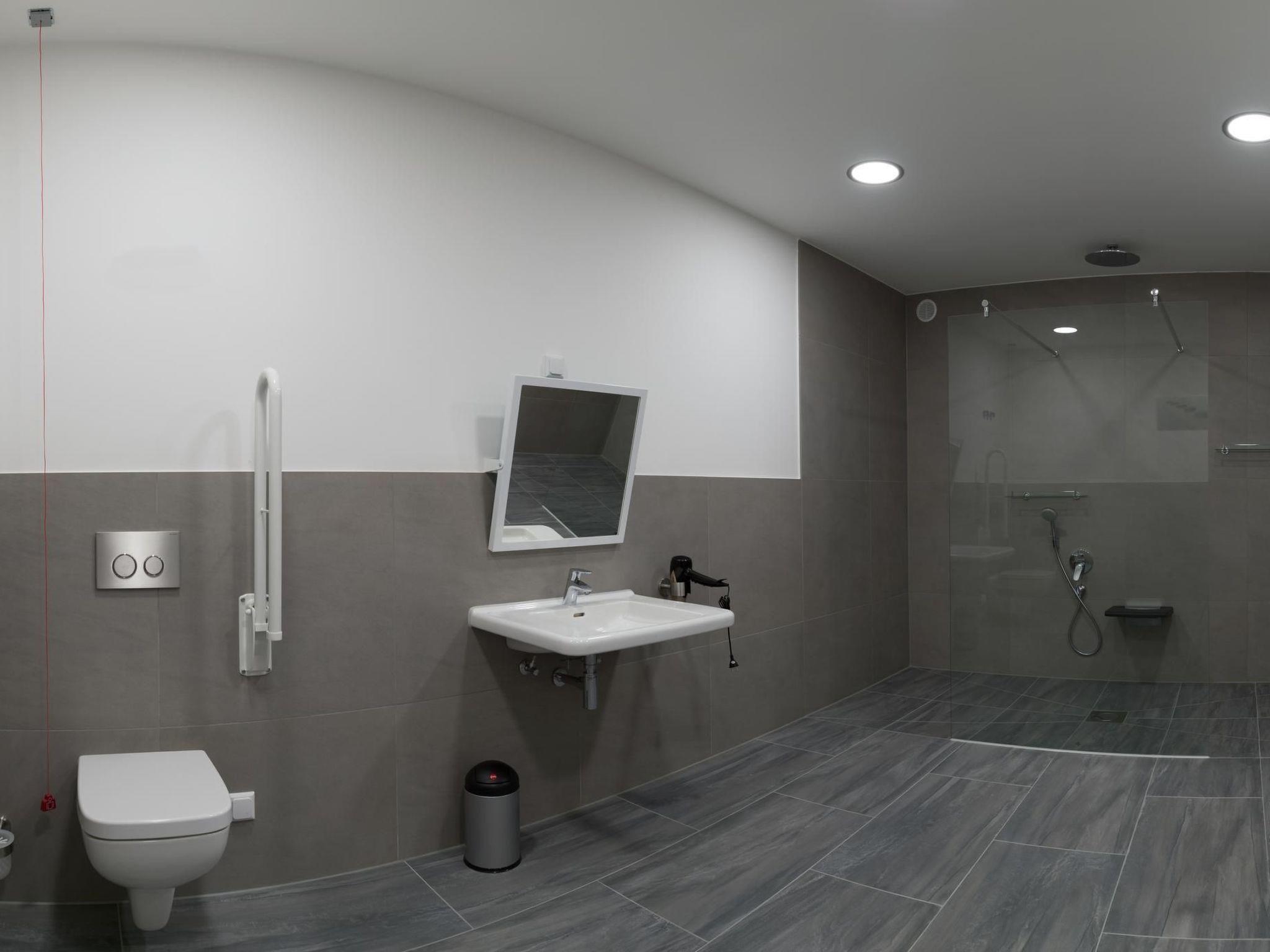 The bathroom is characterised by its generous dimensions and offers a spacious, barrier-free shower with a suitable seat, a wheelchair-accessible washbasin and a toilet with a grab rail.