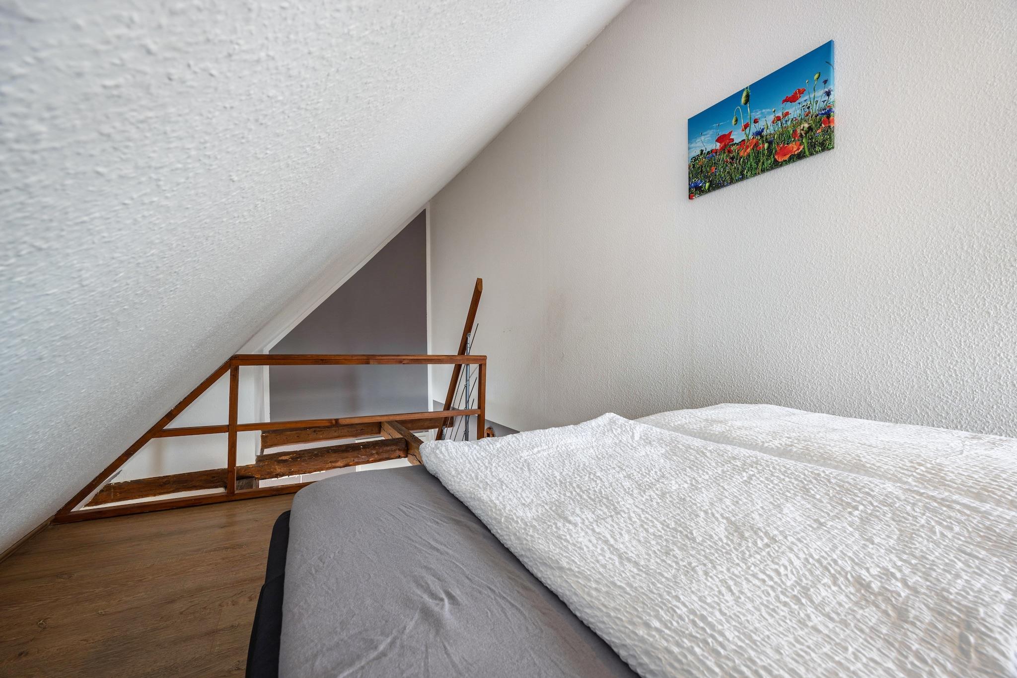 På 1. etage: (åbent køkken(kogeplade(Komfur med to kogeplader, glaskeramisk), elkedel, brødrister, kaffemaskine, mikrobølgeovn, køle-fryseskab), stue / spisestue(dobbeltsovesofa, Fjernsyn, spisebord), badeværelse(bruser, håndvask, toilet)) Loft: (svalegang soveværelse(via forholdsvis stejle trapper)(dobbeltseng(180 x 200 cm))) varme(gas), have(deles med andre gæster), parkering, Håndklæder/sengelinned (ekstra gebyr)