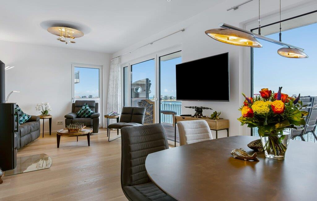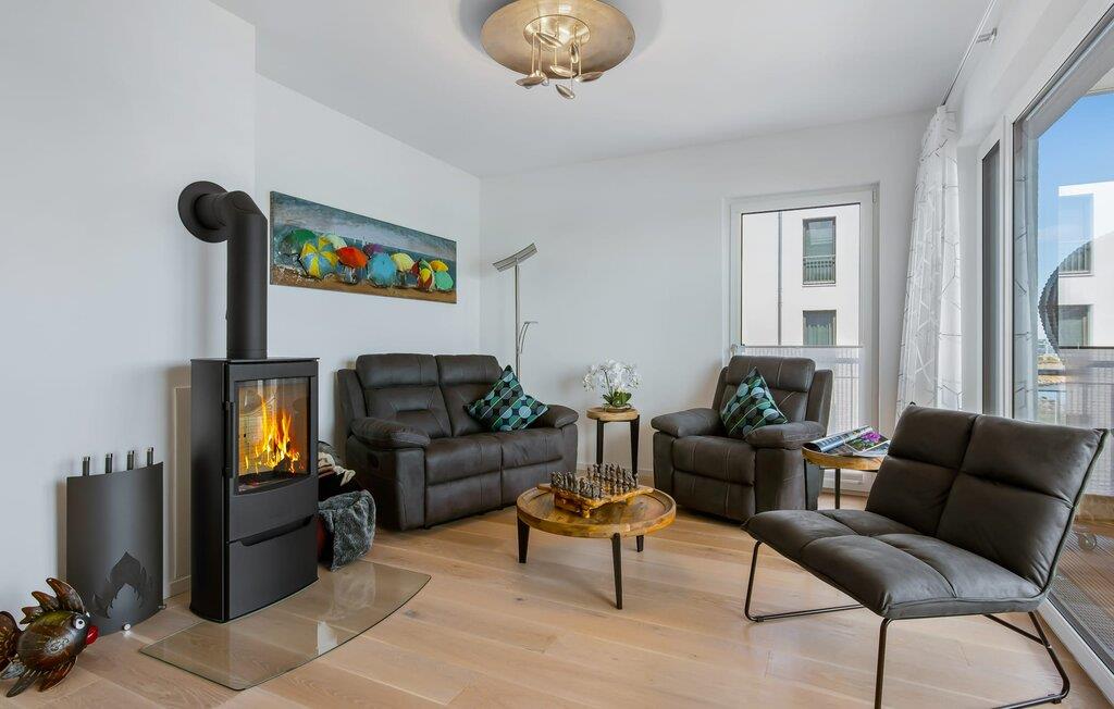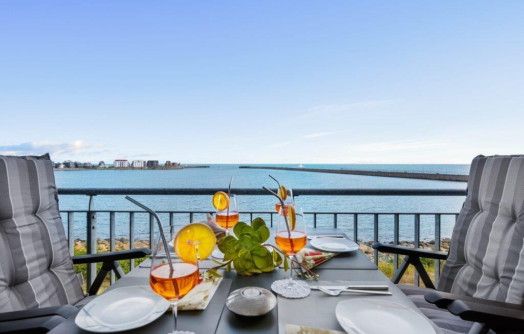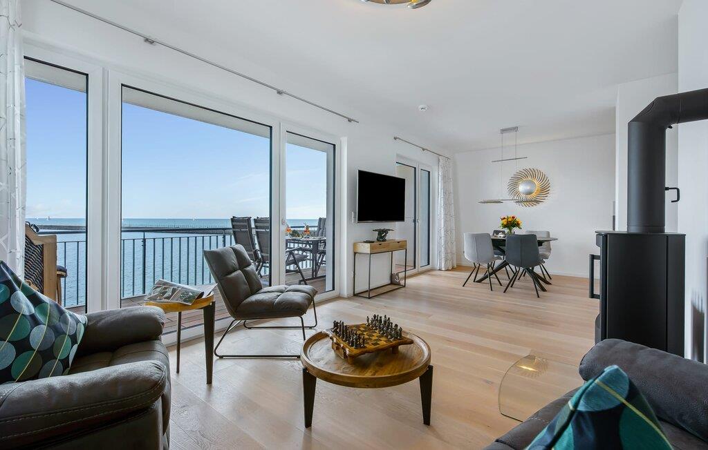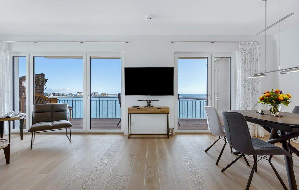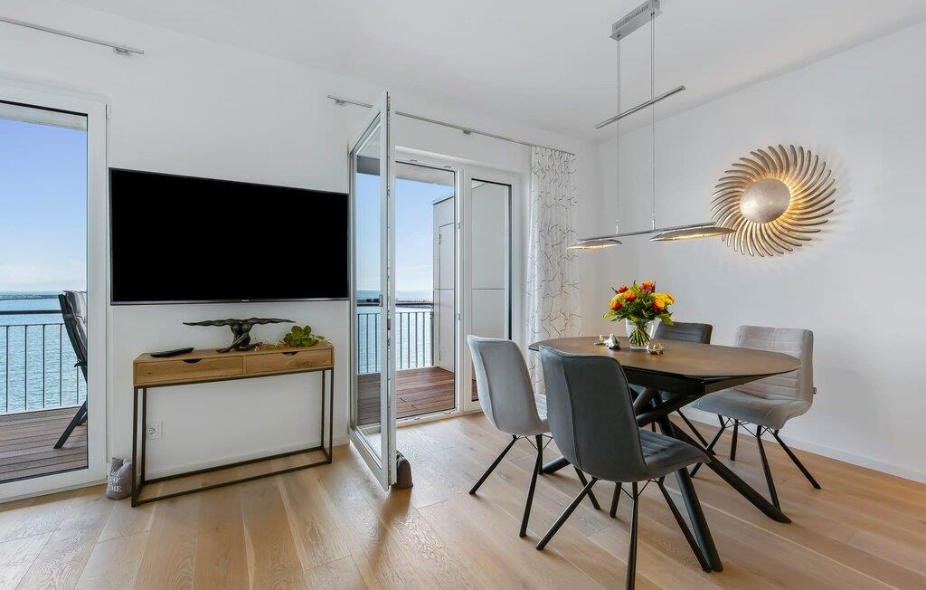 Alt dette kan nydes foran det utrolige panorama af Østersøen. Det er et imponerende og utroligt vandskue, der tilbydes jer her 24 timer i døgnet. Hvis vejret ikke tillader jer at sidde på altanen, kan I også nyde skuet fra jeres sofa takket være gulv til loft-vinduerne. Har I brug for musikalsk akkompagnement, er der radio og fjernsyn i stuen og begge soveværelser.