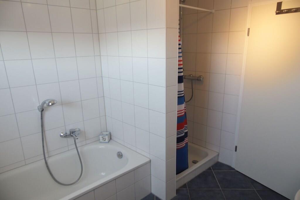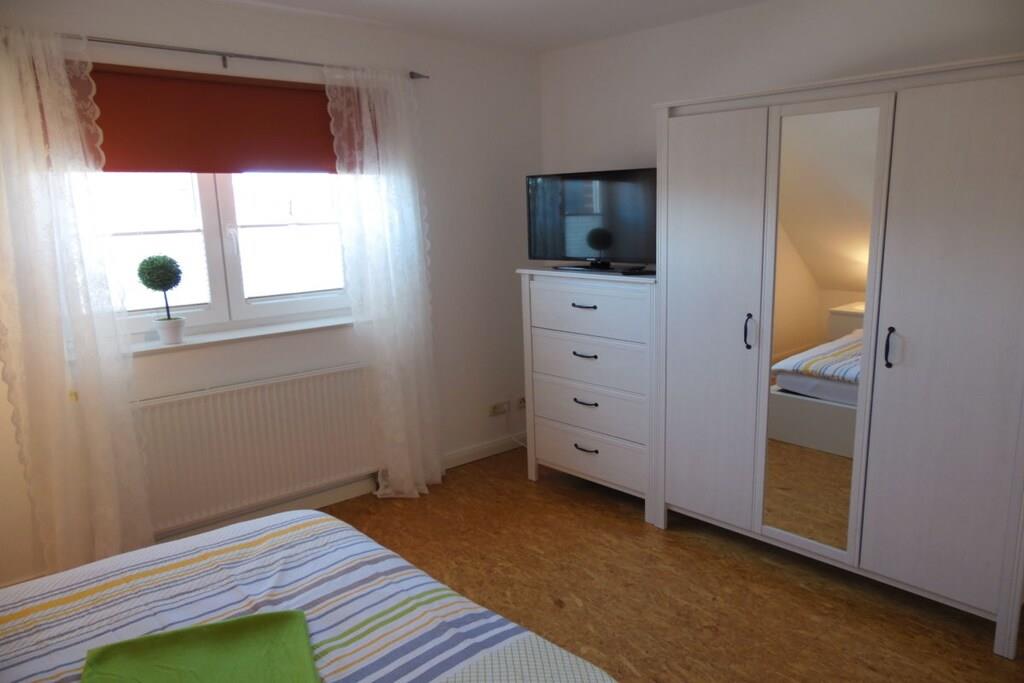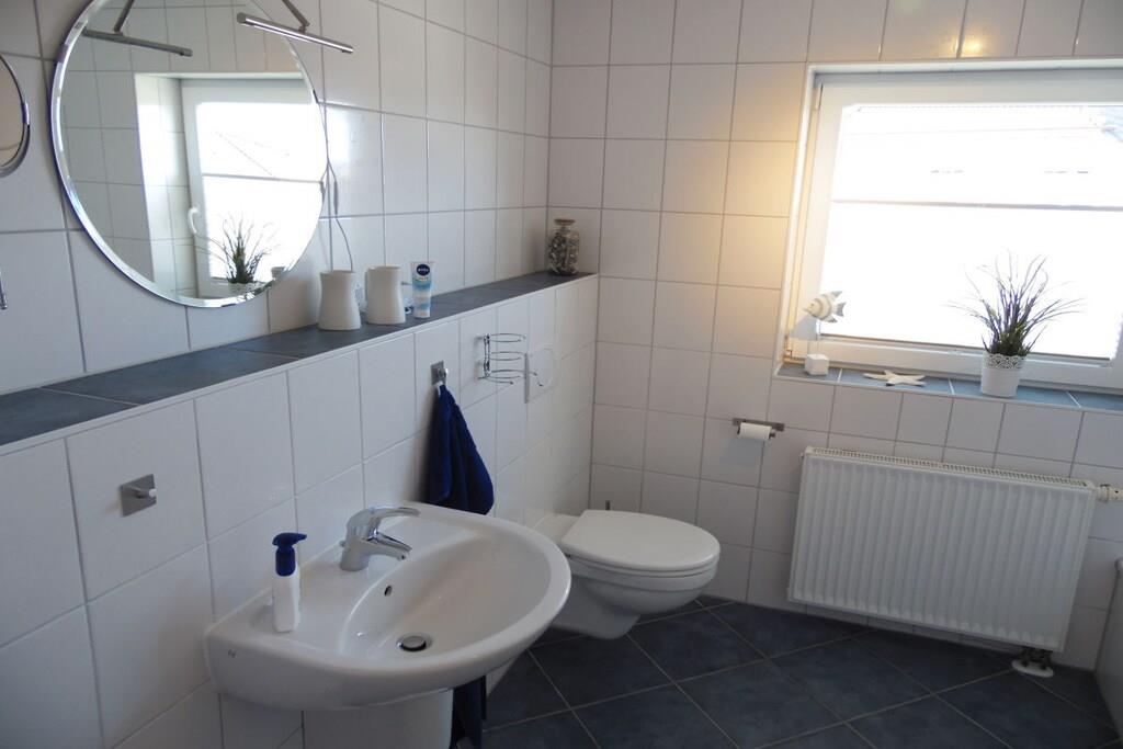 Das Ferienhaus erstreckt sich über zwei Etagen. Im Erdgeschoss befindet sich ein behinderten geeignetes Badezimmer mit rollstuhlbefahrbarer Dusche und WC. Ebenfalls ist das Einzelschlafzimmer im EG. Ein großzügiger Wohn-u. Essbereich mit direktem Ausgang auf die sonnige Terrasse und Garten hat den größten Anteil in der unteren Etage. Sehr schön ist die separate Küche mit Nebeneingangstür zum Carport. Gepäck und Einkäufe können so trockenen Fußes ins Haus gebracht werden. Im Dachgeschoß befinden sich 3 weitere Schlafzimmer und ein Badezimmer mit Dusche und Badewanne, sowie ein Abstellraum für Ihre Koffer. Die Schlafzimmer sind allesamt mit gemütlichen Doppelbetten ausgestattet. Ein Schlafzimmer hat zusätzlich einen Fernseher mit Flachbildschirm.